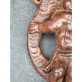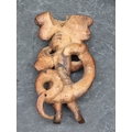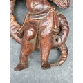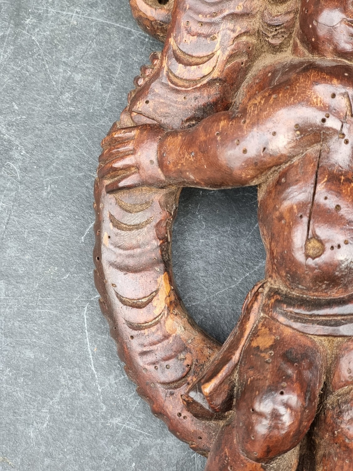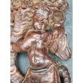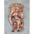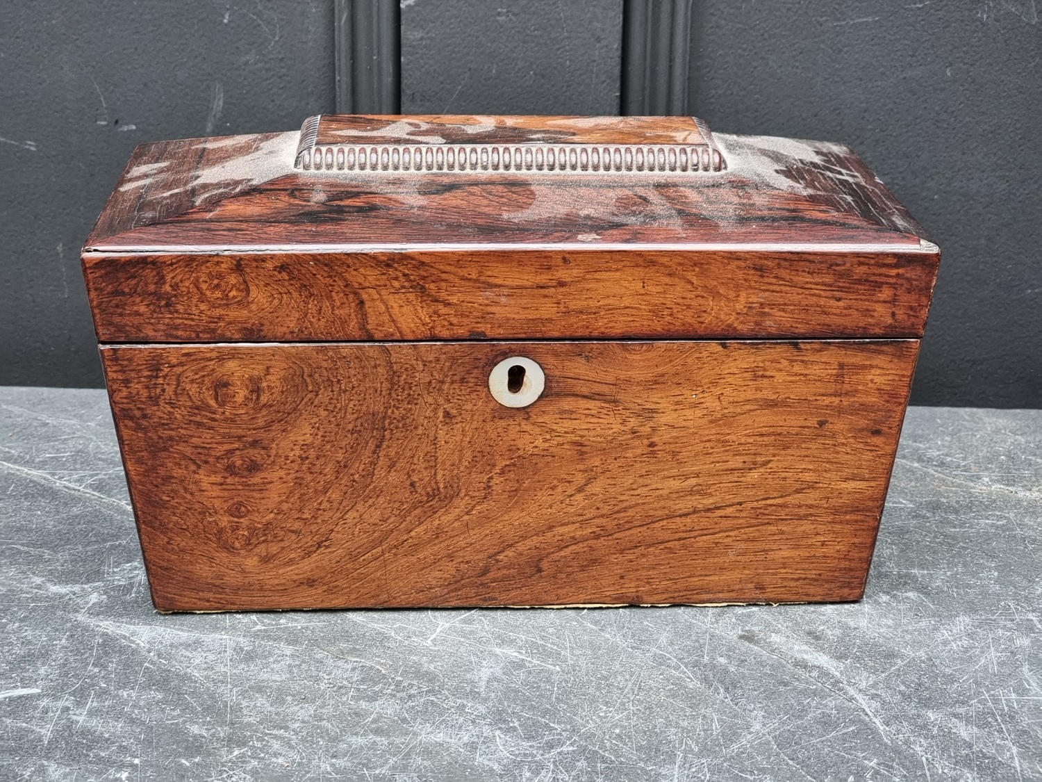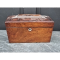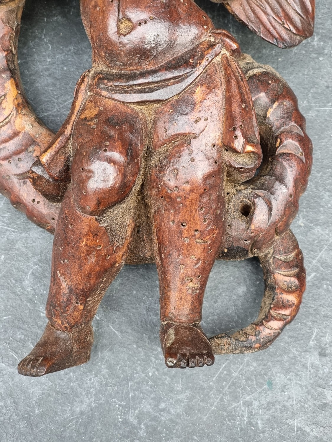 An antique carved softwood cherub bracket, 30cm high, (wormed); together with a 19th century sarcophagus tea caddy, 28cm wide. (2)