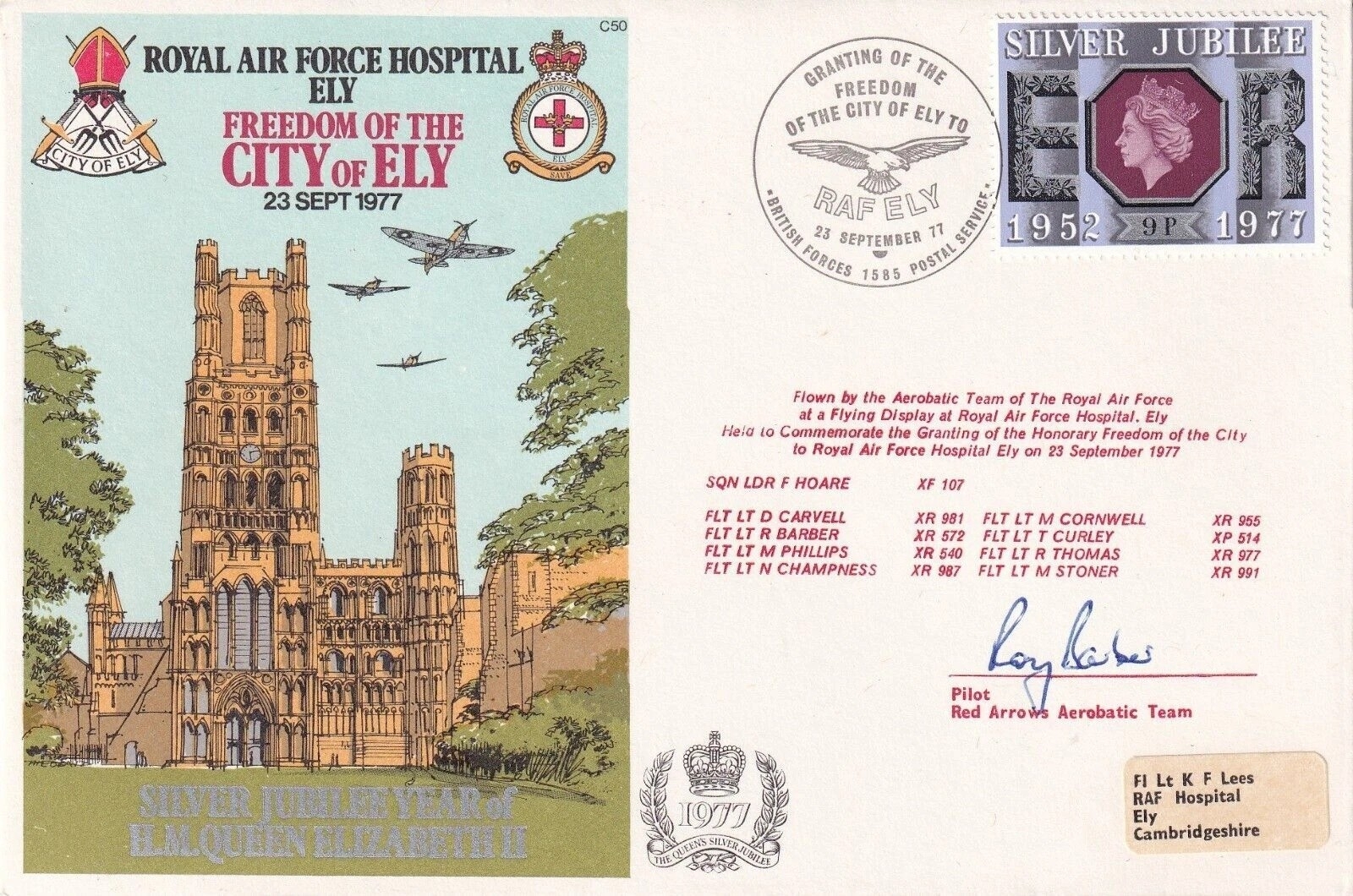 C50bC Flown Red Arrows over City of Ely Signed Red Arrow Pilot Flt lt R Barber. 23 Sept 77 BFPS 1585 Granting of the Freedom of the city of Ely to RAF Ely Special Postmark. Royal Air Force Hospital Ely Freedom of the City of Ely. Cover depicts Spitfires of the Battle of Britain Flight flying over Ely Cathedral, RAF Hospital Ely and City of Ely badges and Silver Jubilee logo. RAF Hospital Ely was opened in 1940 as a 600 bed Hospital. Post WW11 rebuilding has taken place and the Hospital now caters for service and civilian patients. Flown in the Red Arrows Aerobatic Team Gnat T1's in flying display over the Royal Air Force Hospital Ely. Backstamped RAF Post Room RAF Hospital Ely Cambs. Personally Signed by Red Arrow Display Pilot Flt Lt R Barber One of the rare Signature's in this set. Signed Less. Single Vendor RAF cover collection. Good condition. All autographs come with a Certificate of Authenticity. We combine postage on multiple winning lots and can ship worldwide. UK postage from £5.99, EU from £7.99, Rest of World from £9.99