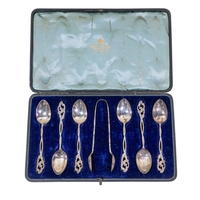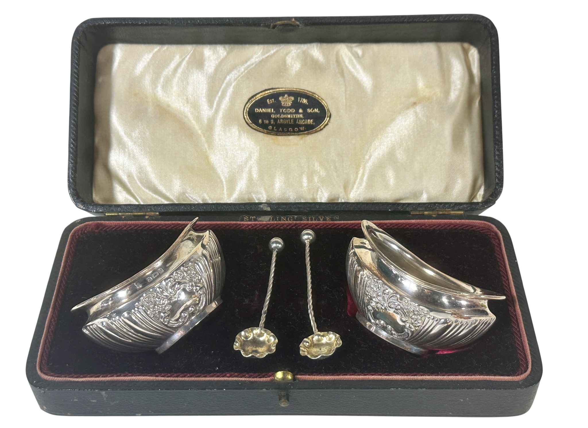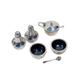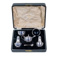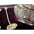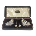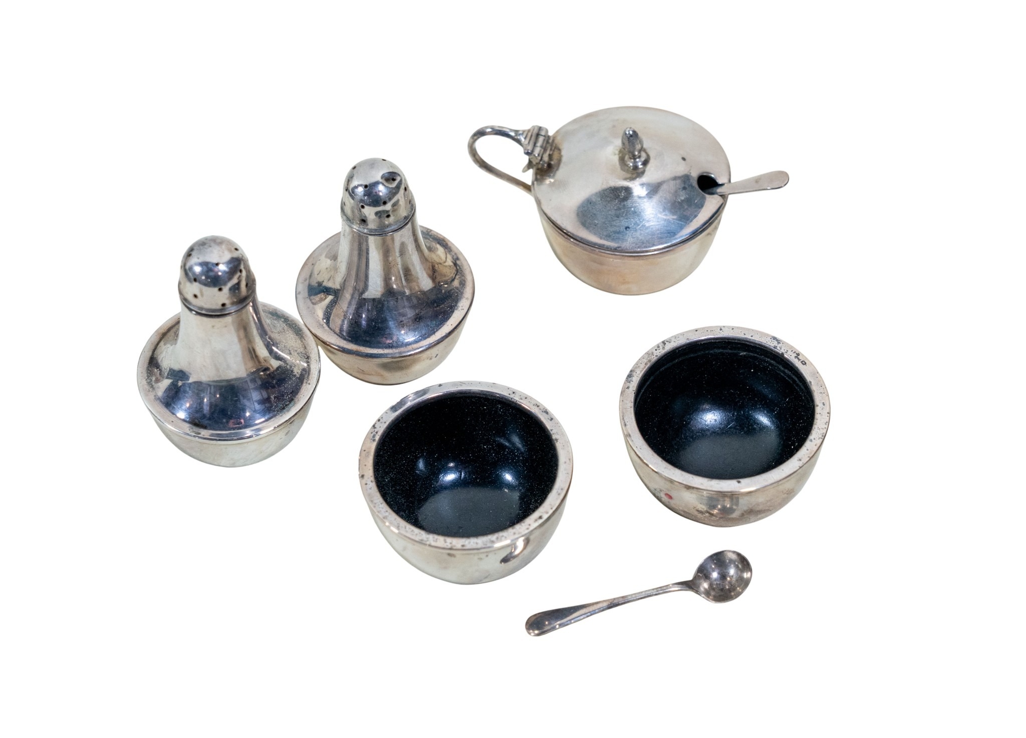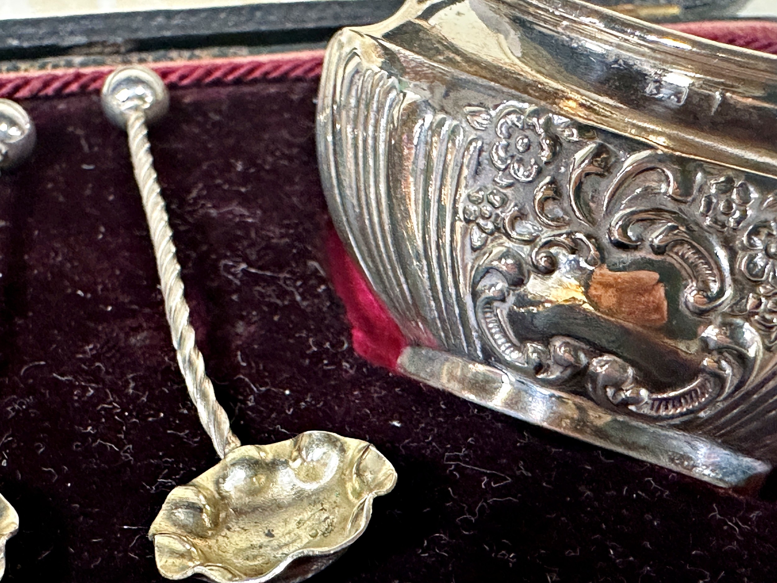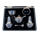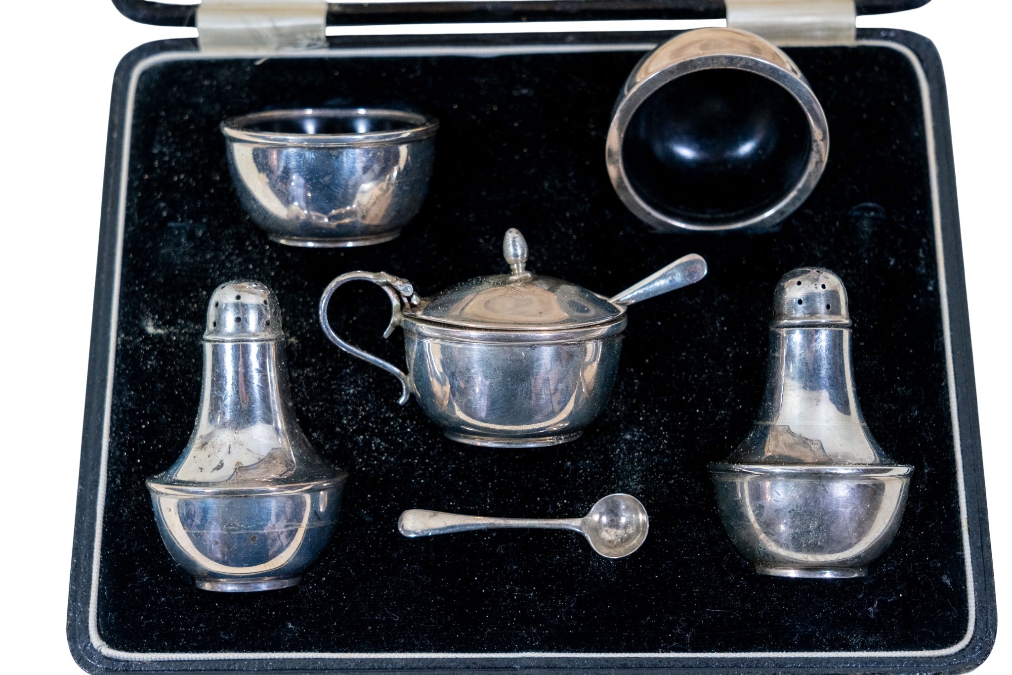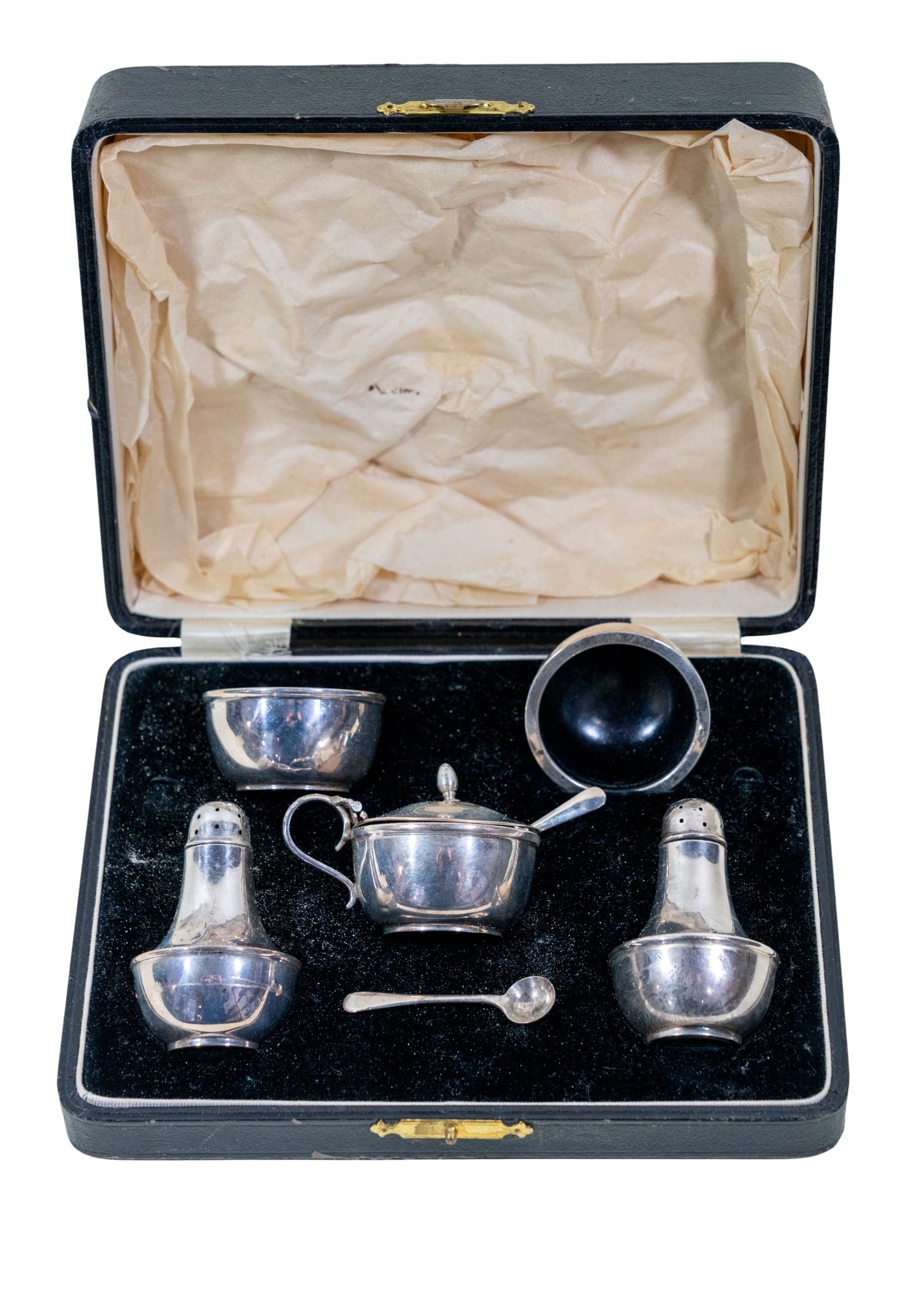 A George V cased silver five piece condiment set, Birmingham, 1935, by Joseph Gloster Ltd. (with loaded bowls)