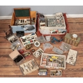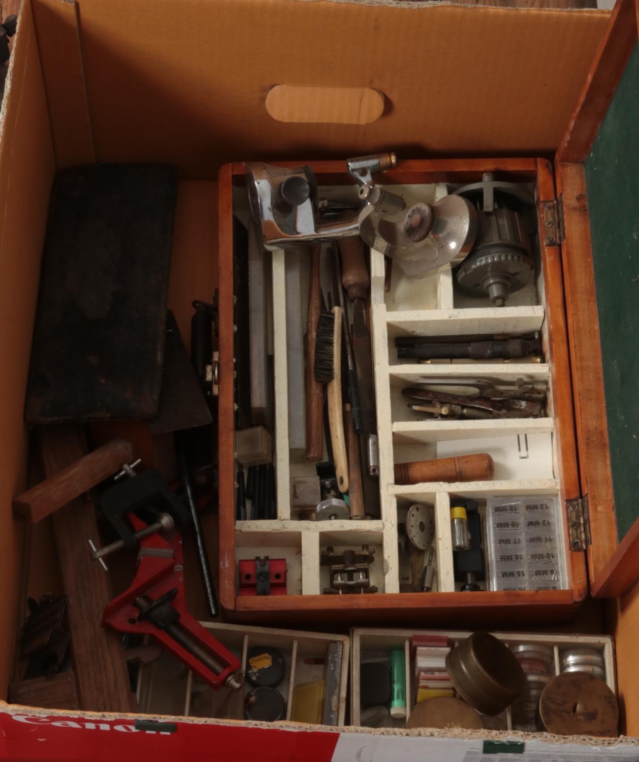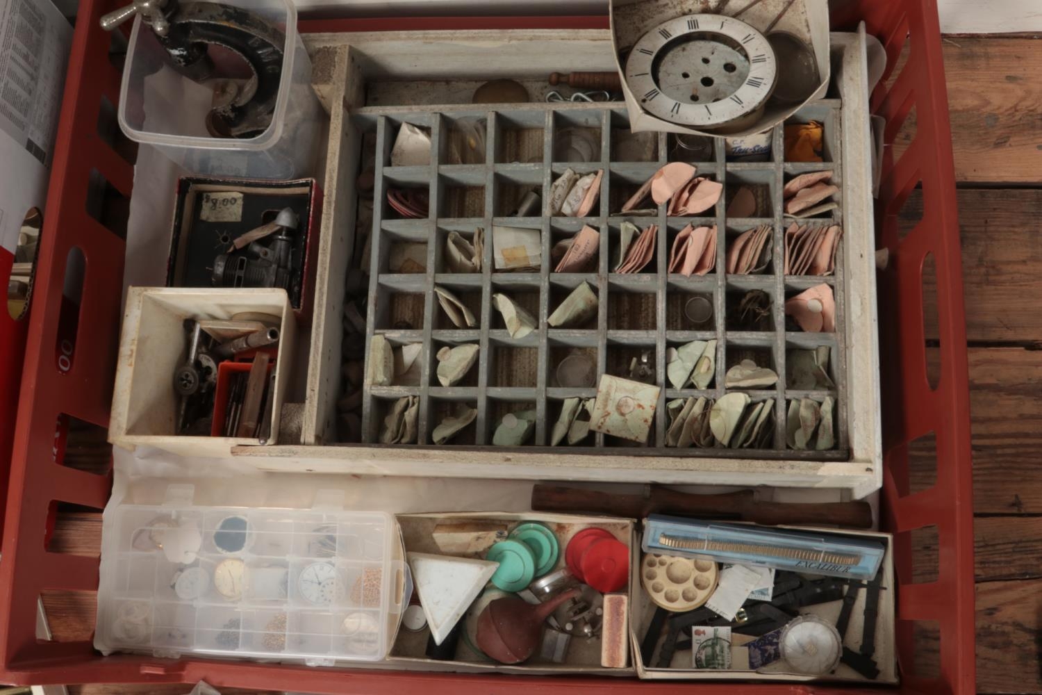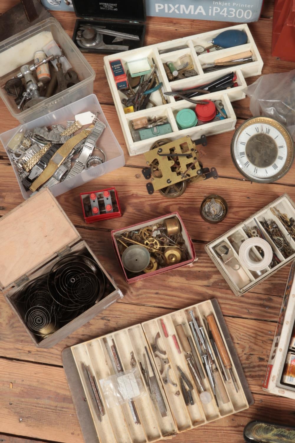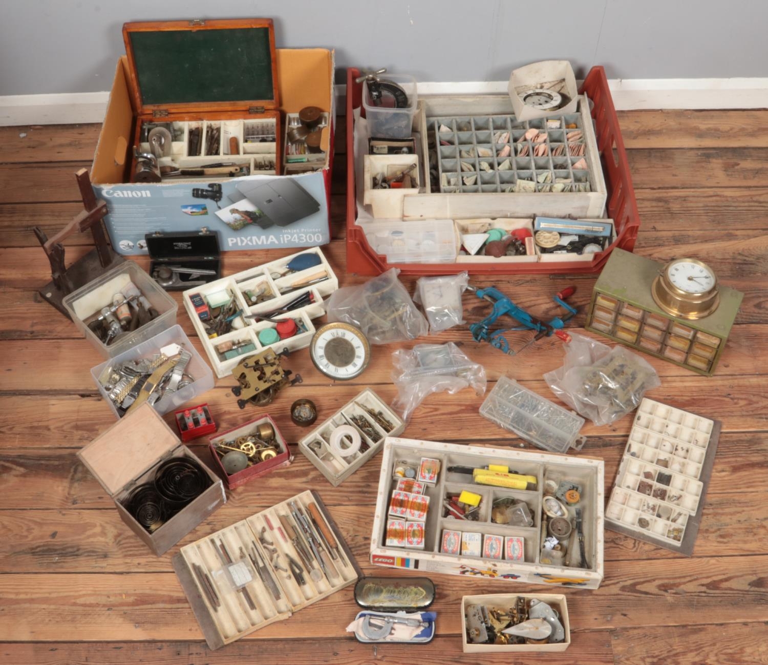 A good quantity of watch/clock makers equipment and tools. Includes cased Moore & Wright Micrometer, clock movements, Triumph, watch movements, coils, etc.