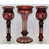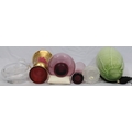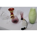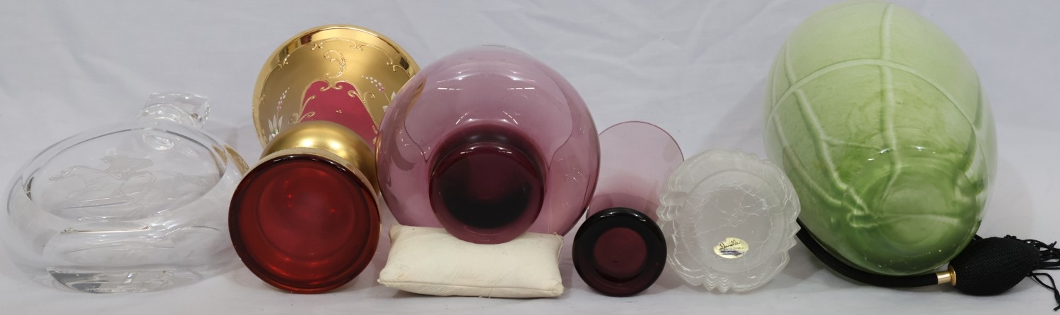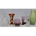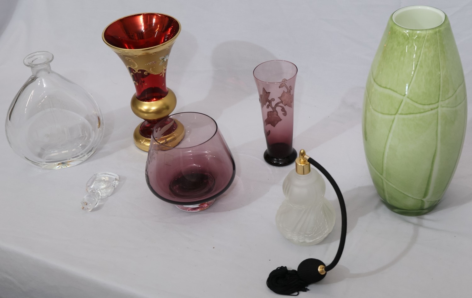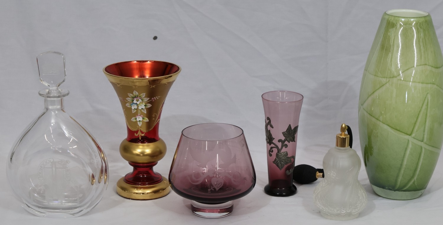 An Orrefors engraved glass bulbous shaped decanter with stopper, 26cm high, a Caithness purple glass round bulbous shaped vase with engraved dove motifs, a Venetian round bulbous trumpet shaped vase on red ground with allover gilt and encrusted floral decoration, a bulbous green glass round vase, 31cm high, a purple glass trumpet shaped vase with raised metal leaf decoration and a Danielle Canadian glass spray scent bottle (6)