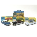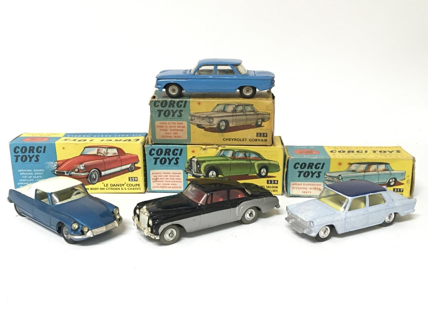 Corgi toys, #259 Le Dandy coupe, #217 Fiat 1800, #229 Chevrolet Corvair and #224 Benley Continental sports saloon, boxed