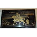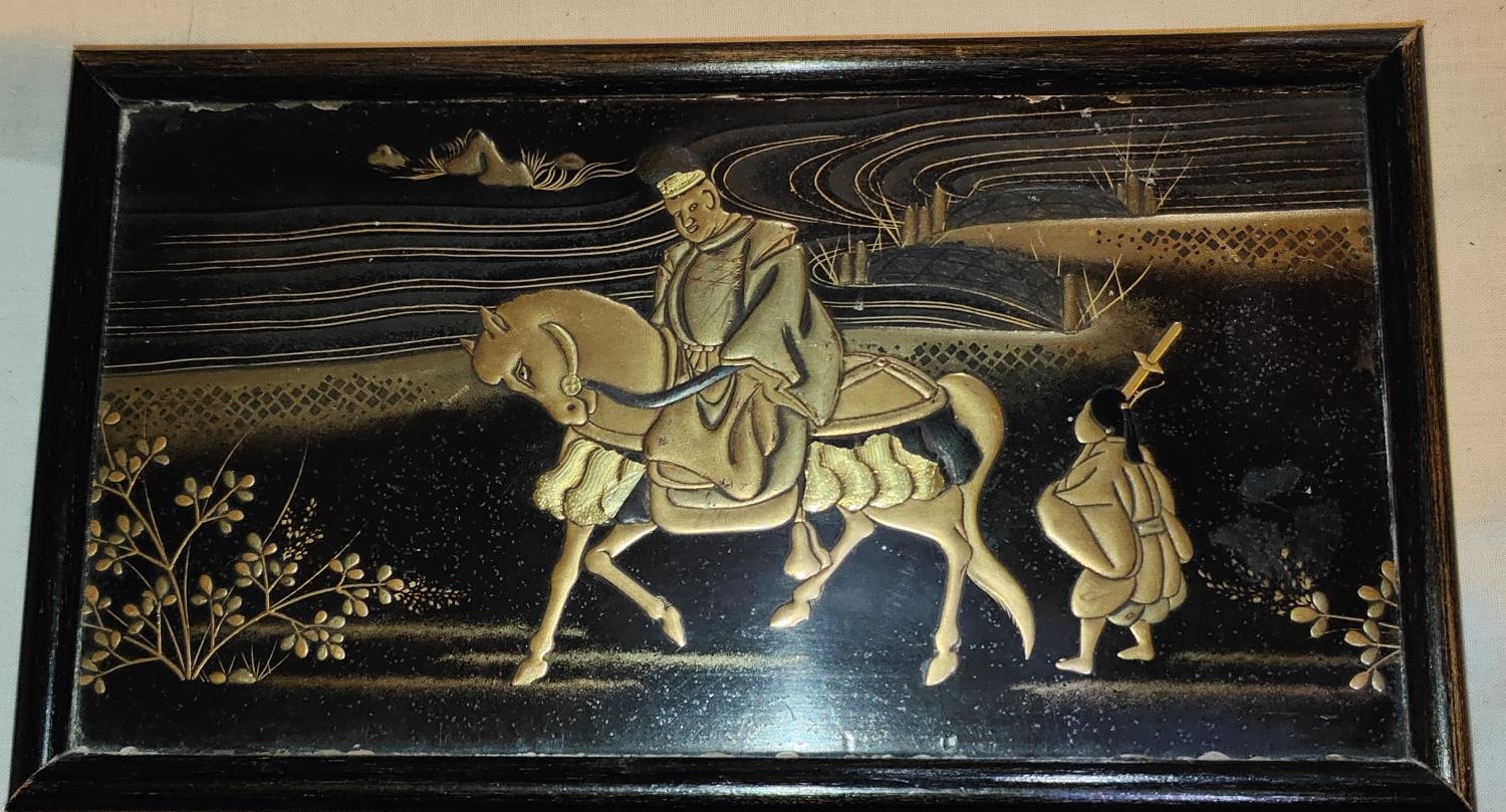 A Japanese black lacquer and gilt plaque depicting a man on horseback, 10 x 19cm