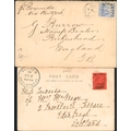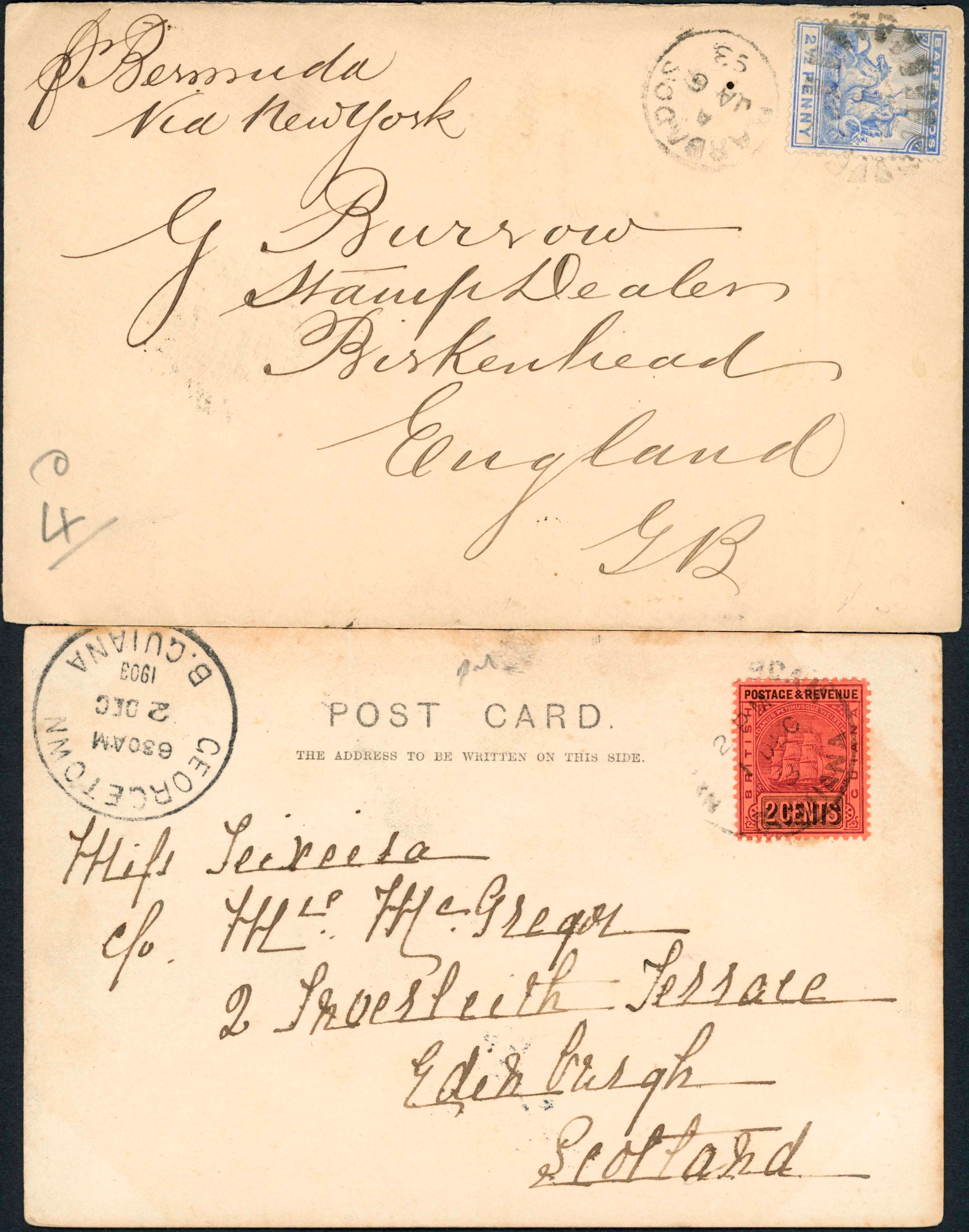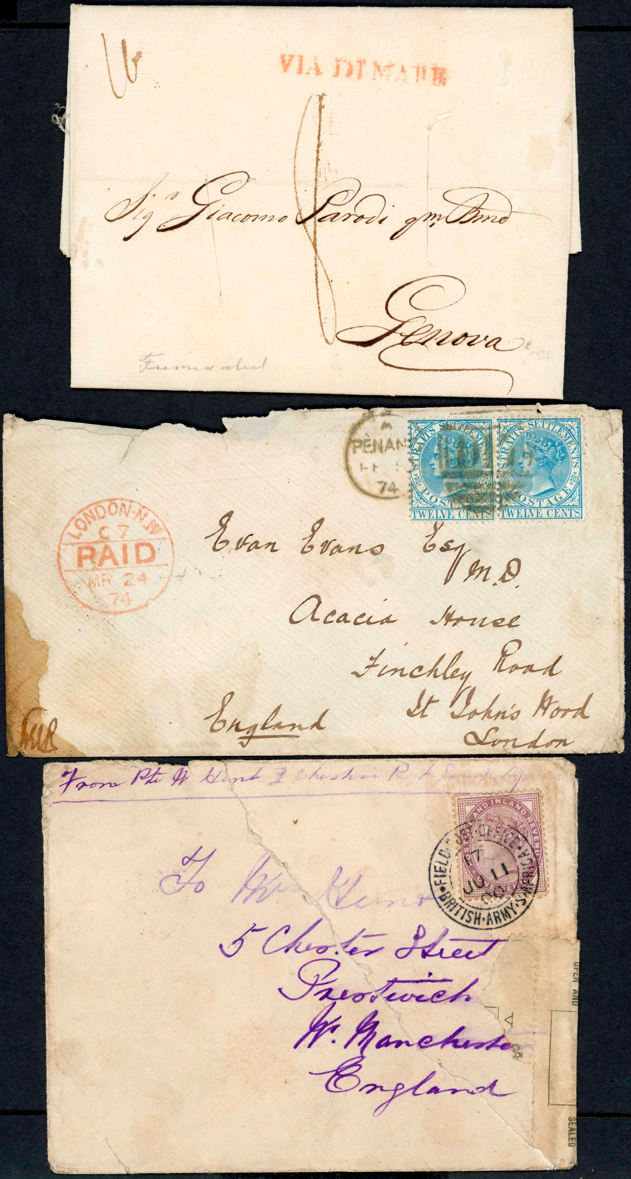 EARLY COMMONWEALTH COVER MISCELLANY: Includes 1826 EL from Gibraltar to Genoa with disinfection slits and s/l "VIA DI MARE" mark in red, 1874 env. from Penang to London with 2 x 12c blue franking (SG 15), Barbados 1893 env. to Birkenhead with QV 2½d ultramarine, 11 Jul. 1900 env. to Manchester (damaged) with GB 1d lilac cancelled by Br. Army. S. Africa Field PO cancel, Dec 1903 PPC from Georgetown, Br. Guiana to Edinburgh franked 2c black & purple/red, etc. Also Tonga 25 Jan. 1944 Regd. FDC with Jubilee set of 5 to 1/-. (7 cards/covers)Cross Reference: GIBRALTAR, MALAYA - PENANG, DISINFECTED MAIL