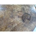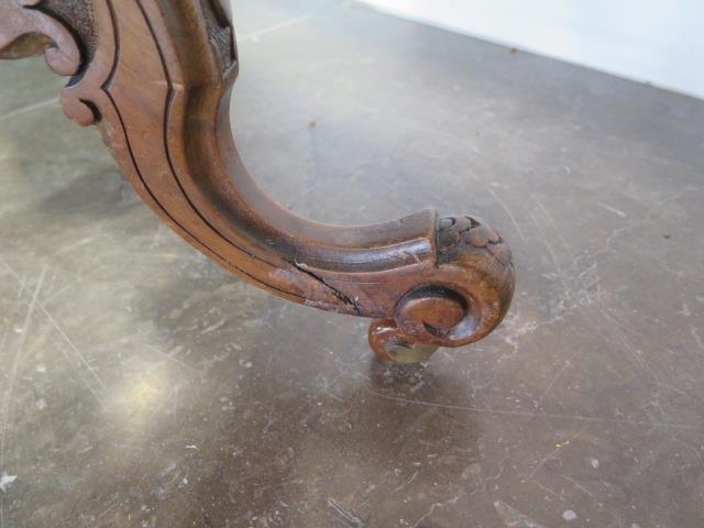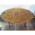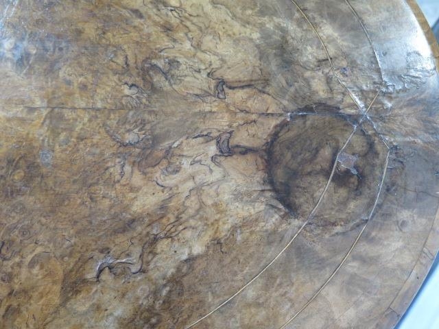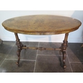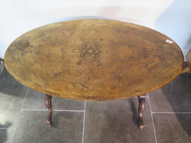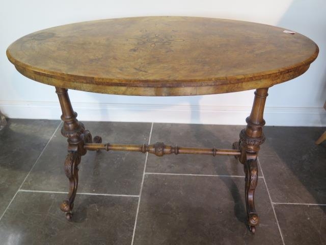 A Victorian inlaid burr walnut oval centre table on carved supports united by a turned stretcher, 71cm tall x 106cm x 62cm some fading and slight veneer lifting to top otherwise generally good