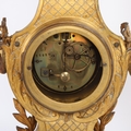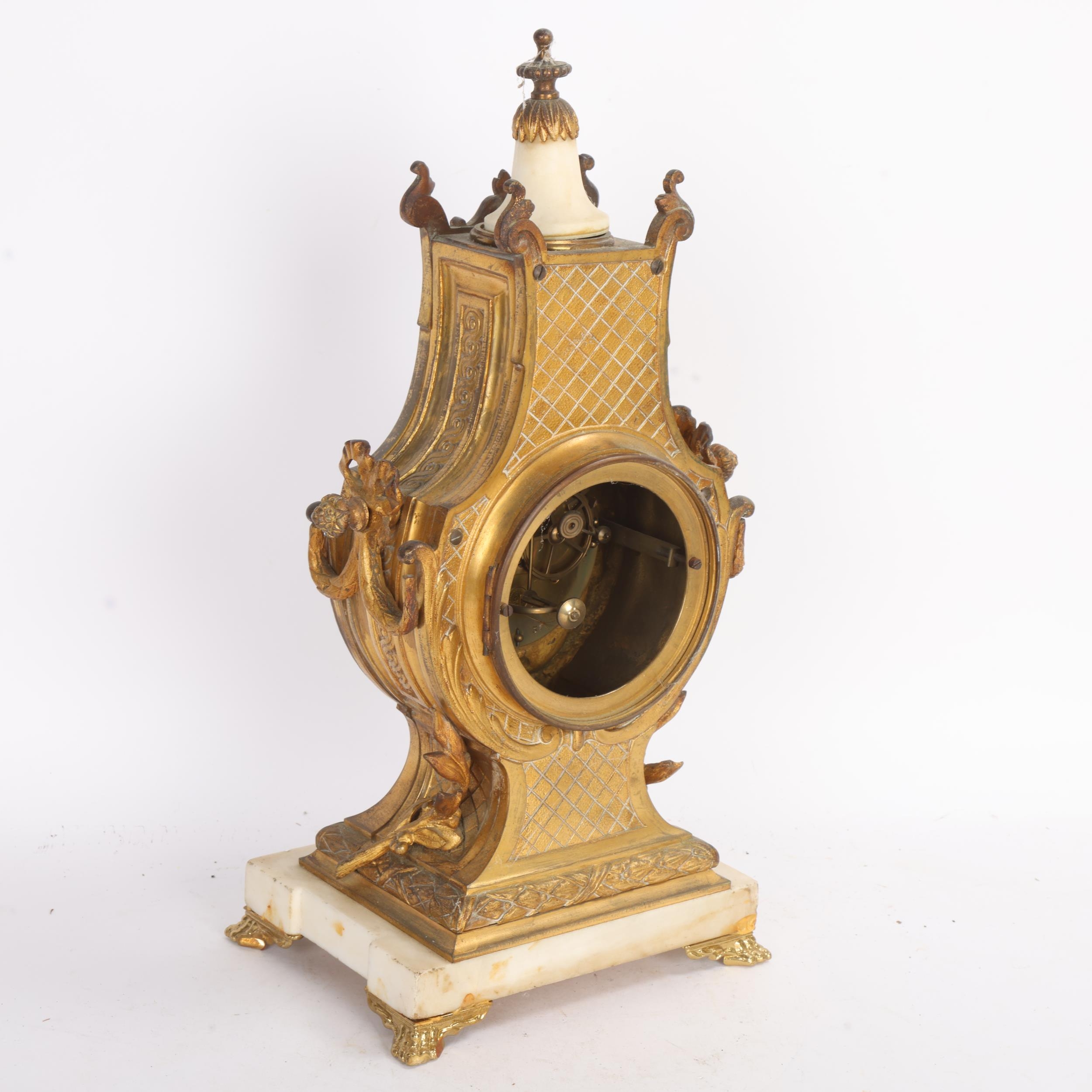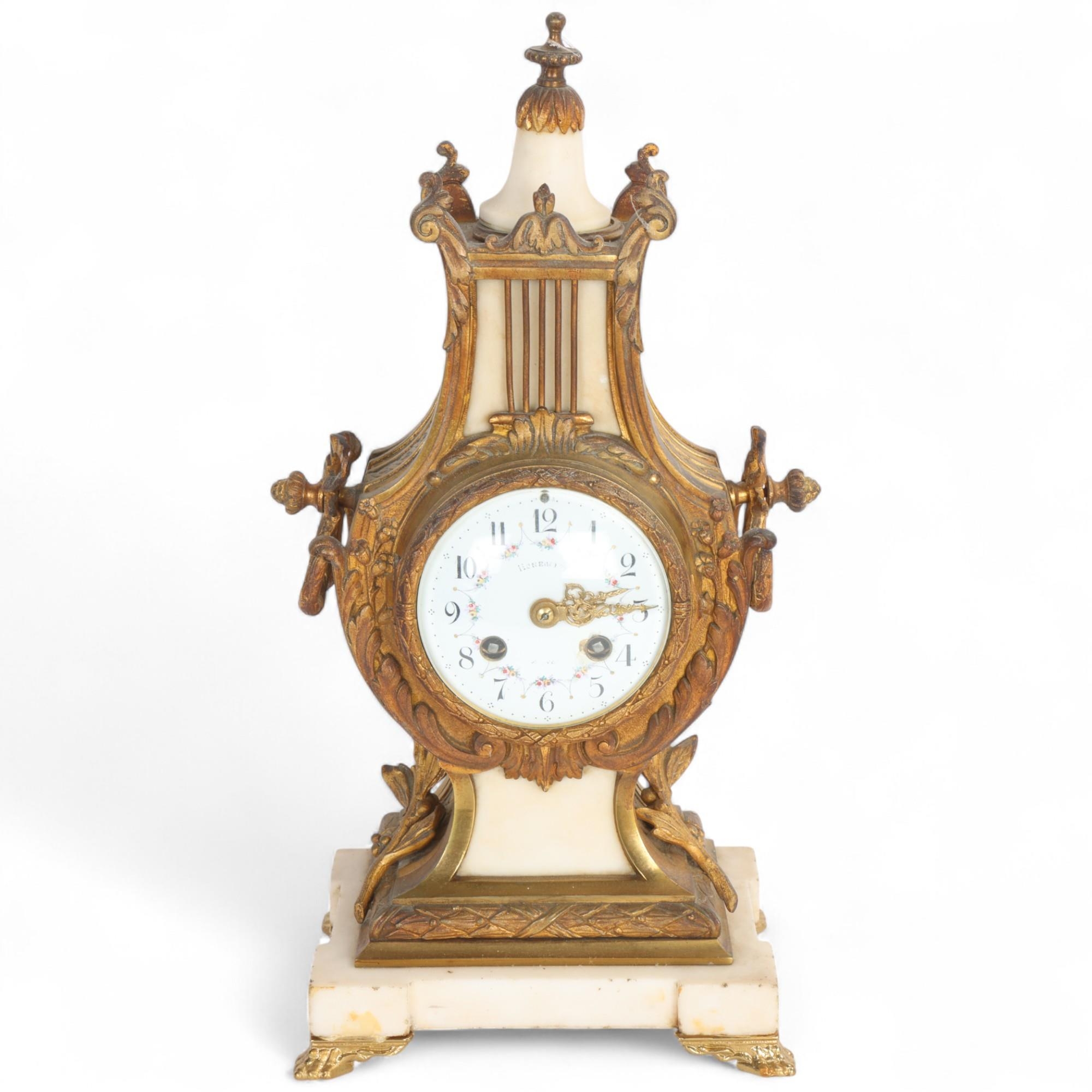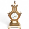 A French 19th century ormolu and alabaster lyre cased mantel clock, with enamel dial, height 37cm