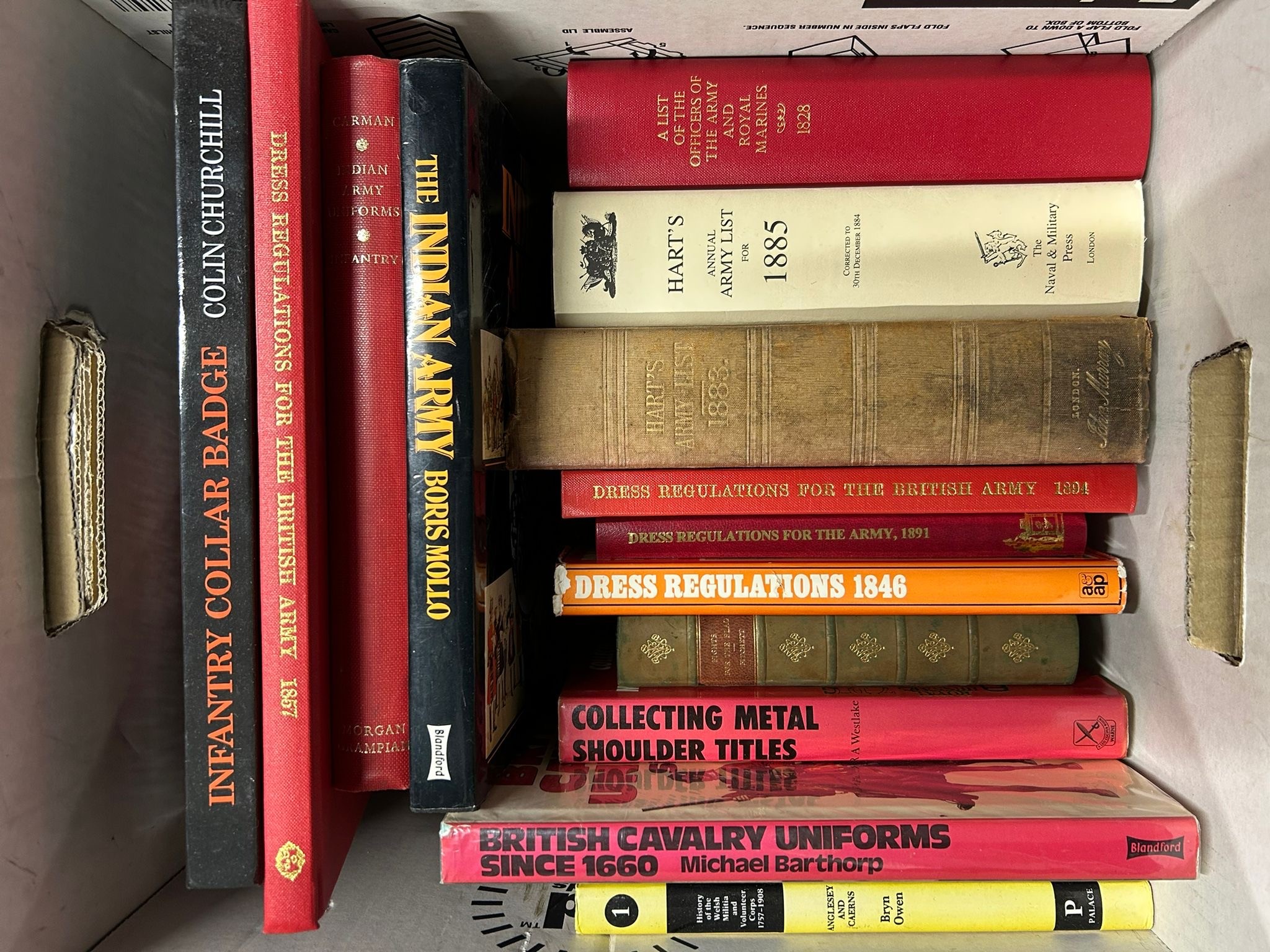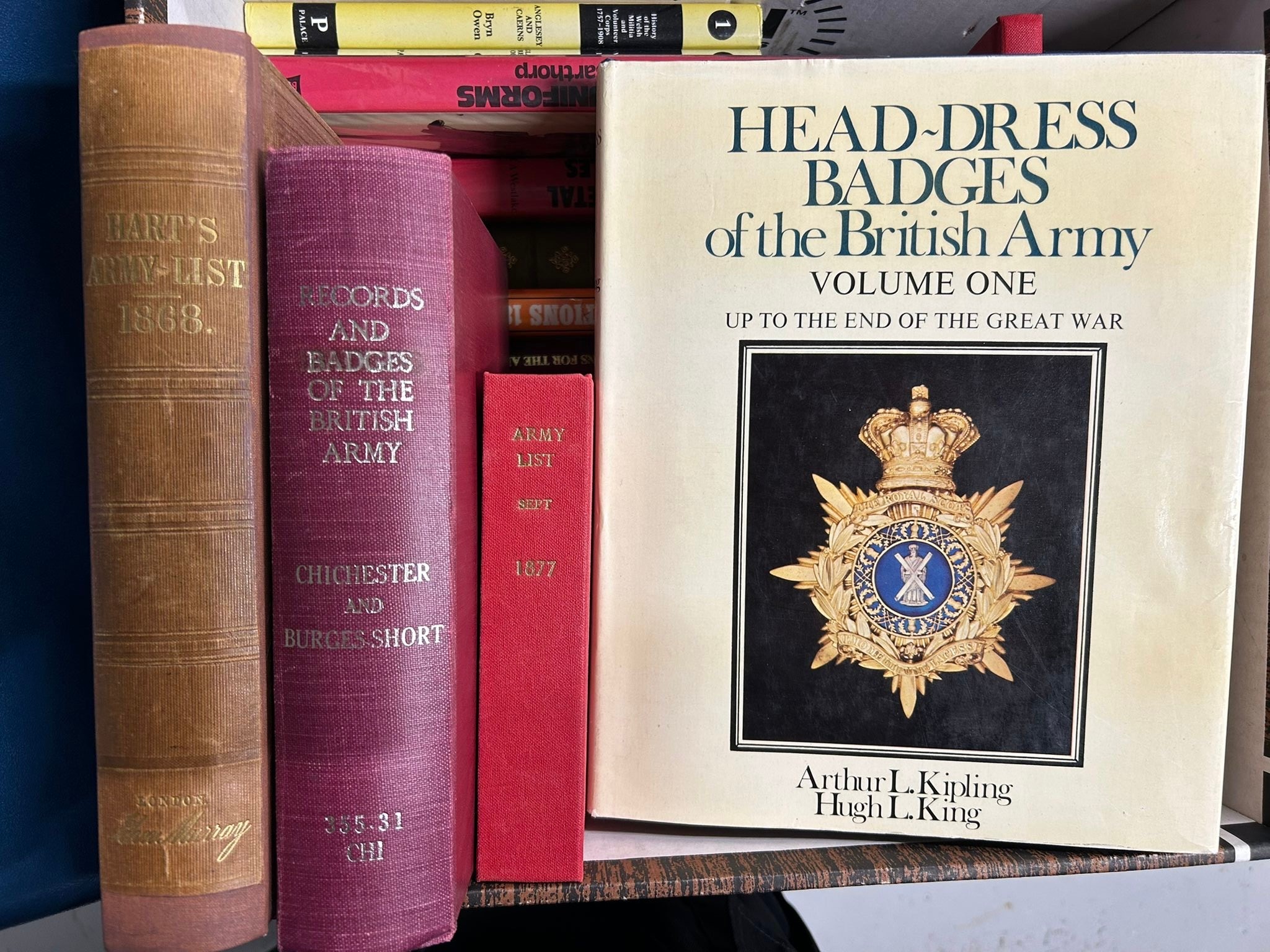 British Militaria reference books comprising Hart’s Army List for 1868 and 1883, and 1885 (the latter a reprint); annual Army List 1828 and for Sept 1877 (both re-bound); Dress Regulations for the British Army 1846, 1857, 1891 and 1894 (all re-prints); Head-dress badges of the British Army Volume 1, Kipling and King; Indian Army Uniforms, Carman; The Indian Army Mollo; Fights for the Flag, W H Fitchett, 1904; Infantry Collar Badge C Churchill; Collecting Metal Shoulder Titles, R A Westlake; Records and Badges of the British Army, Chichester and Burgess-Short (Ex. public library) and 3 other titles. Average good condition