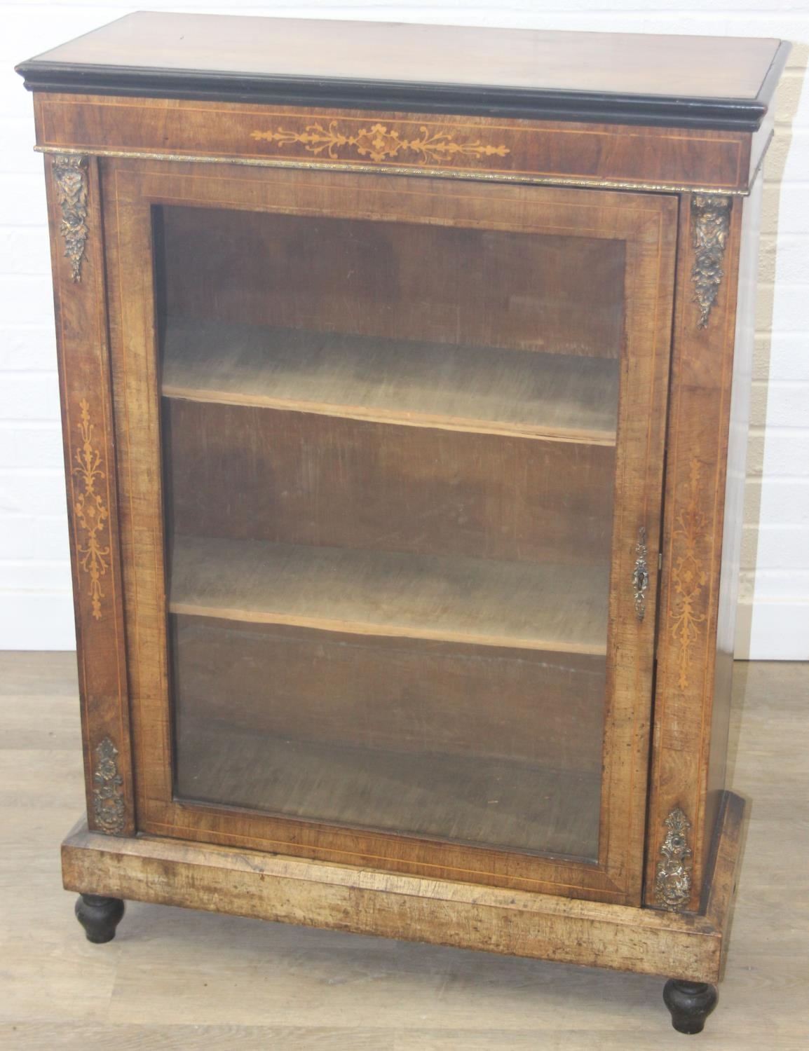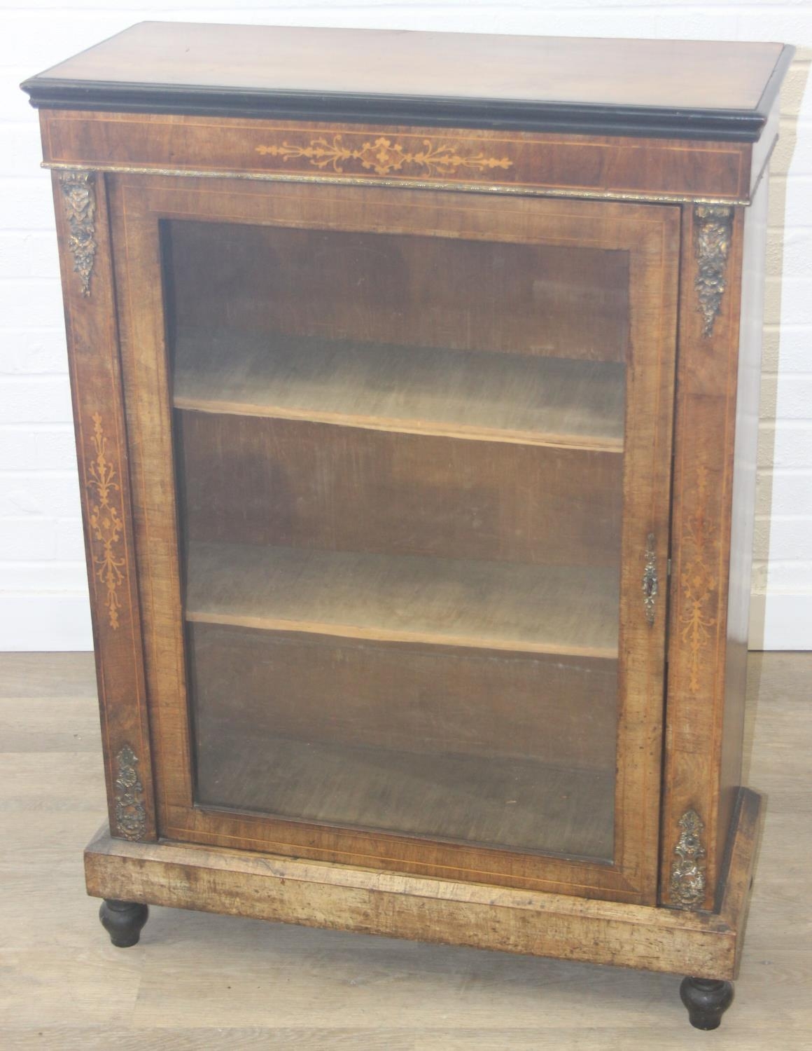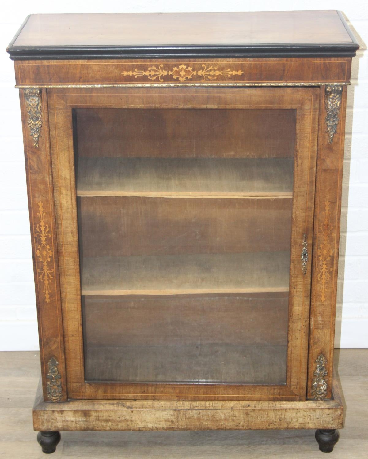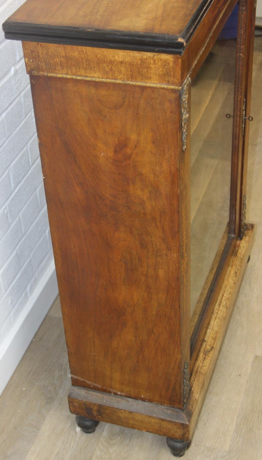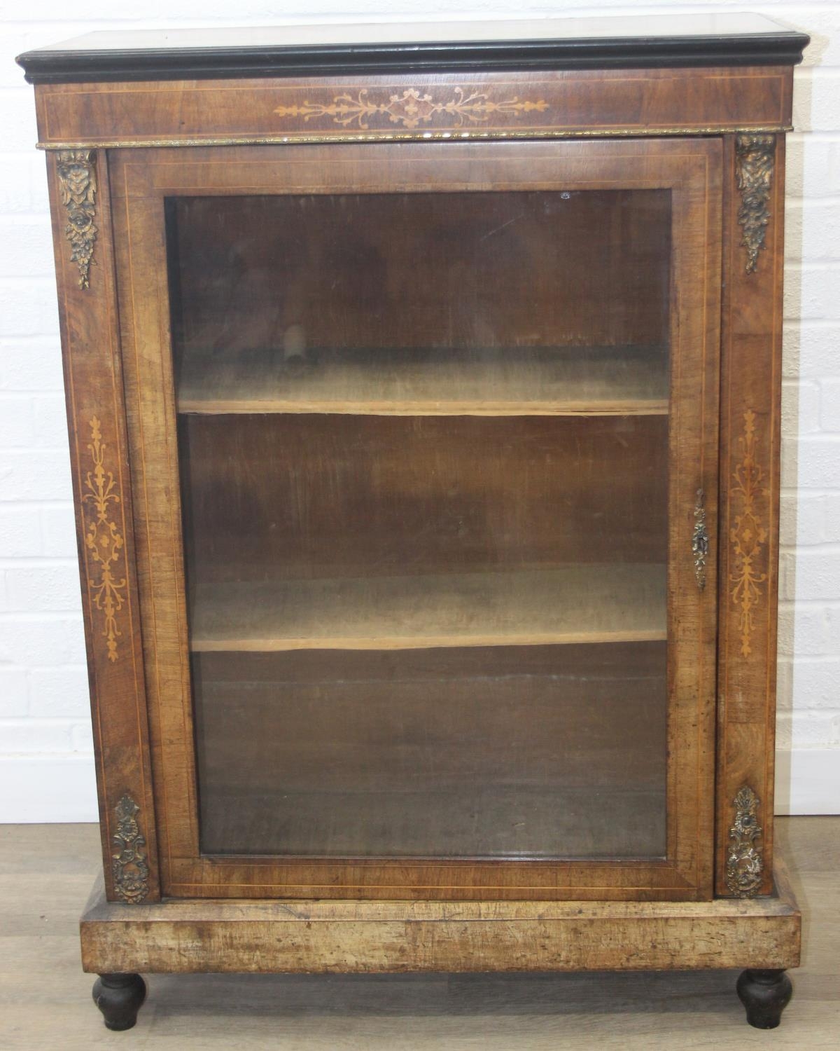 A Victorian walnut and marquetry inlaid pier cabinet or glazed bookcase with gilt metal mounts, two shelves, ebonised edging, 76cm x 32cm x 106cm