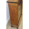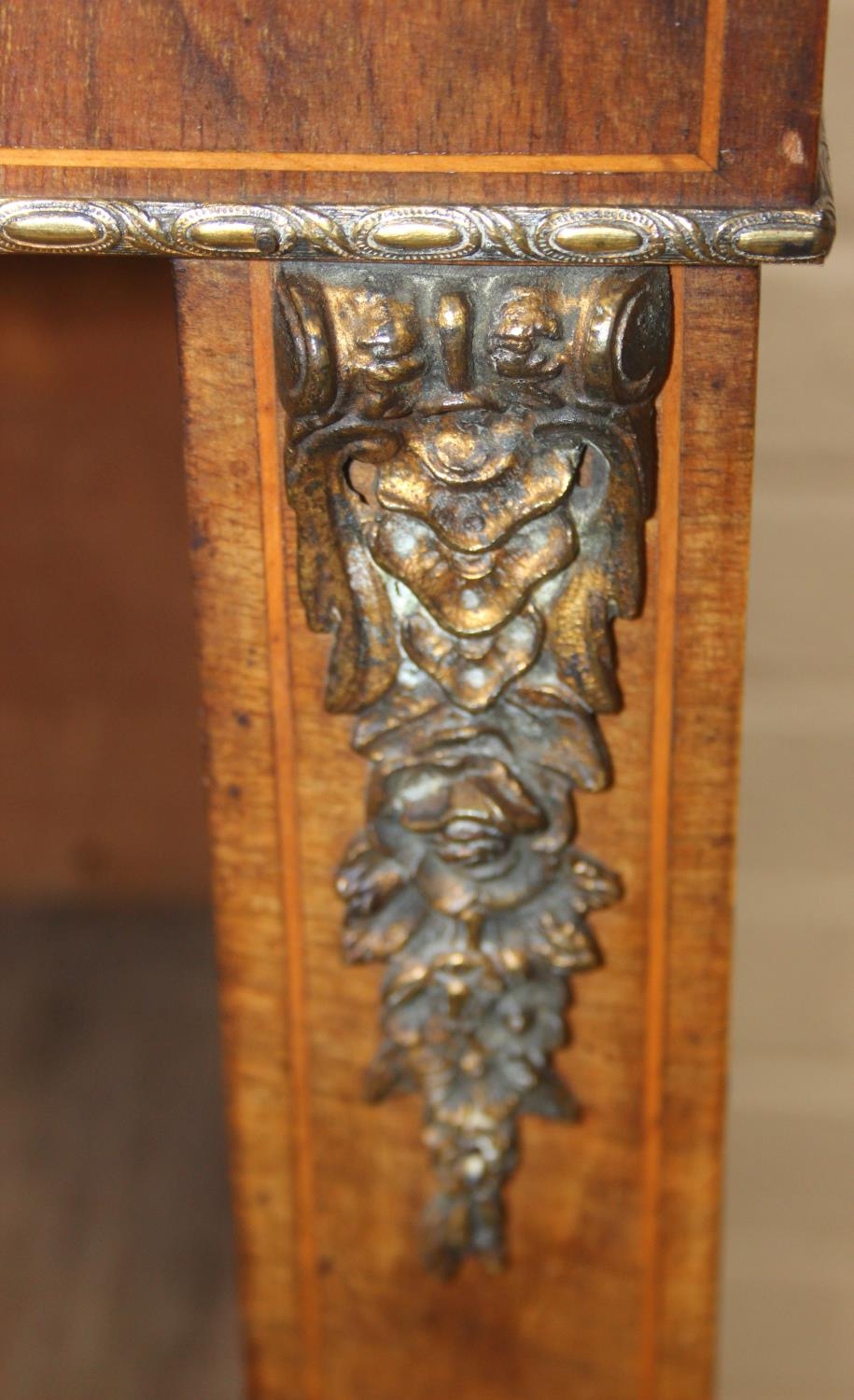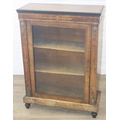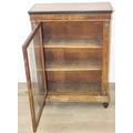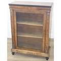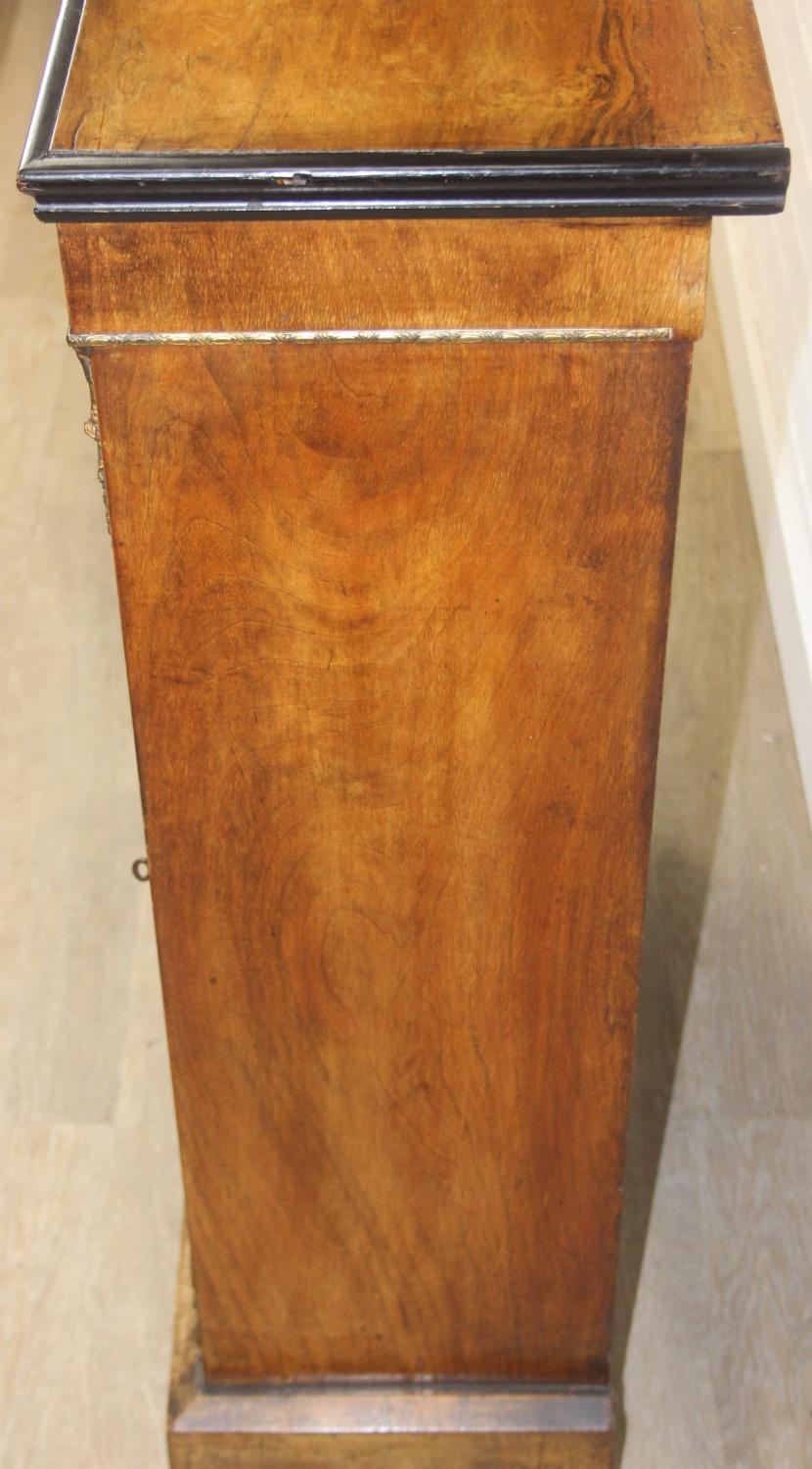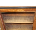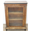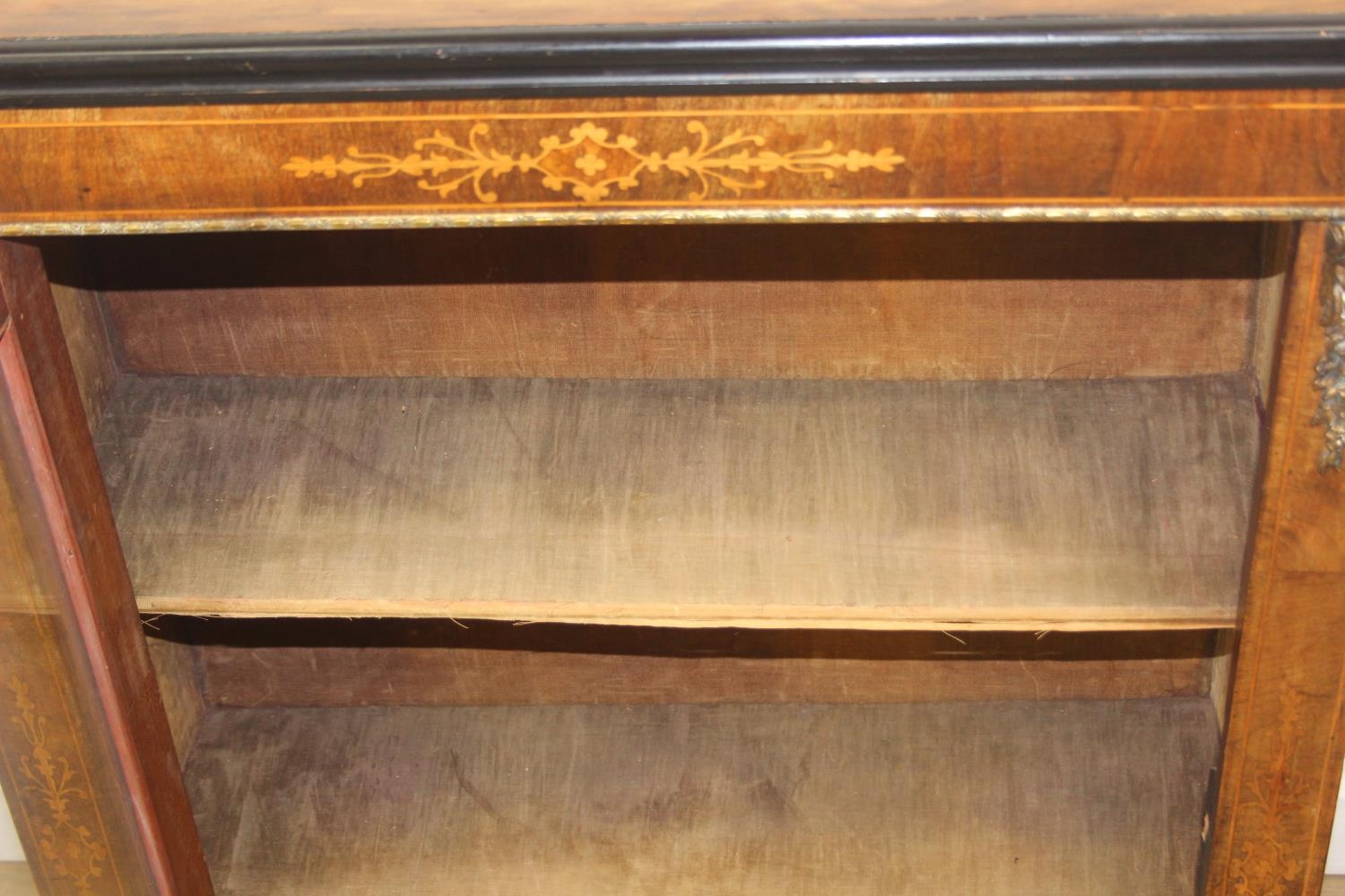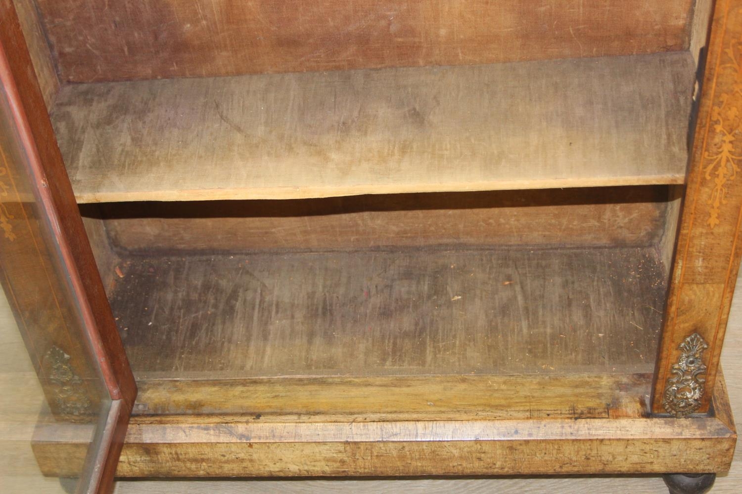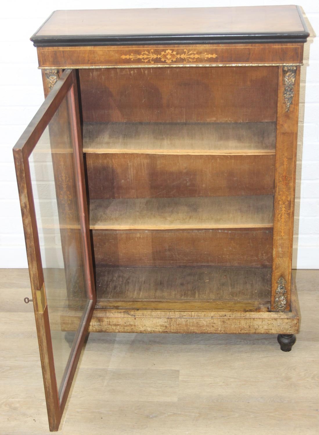 A Victorian walnut and marquetry inlaid pier cabinet or glazed bookcase with gilt metal mounts, two shelves, ebonised edging, 76cm x 32cm x 106cm