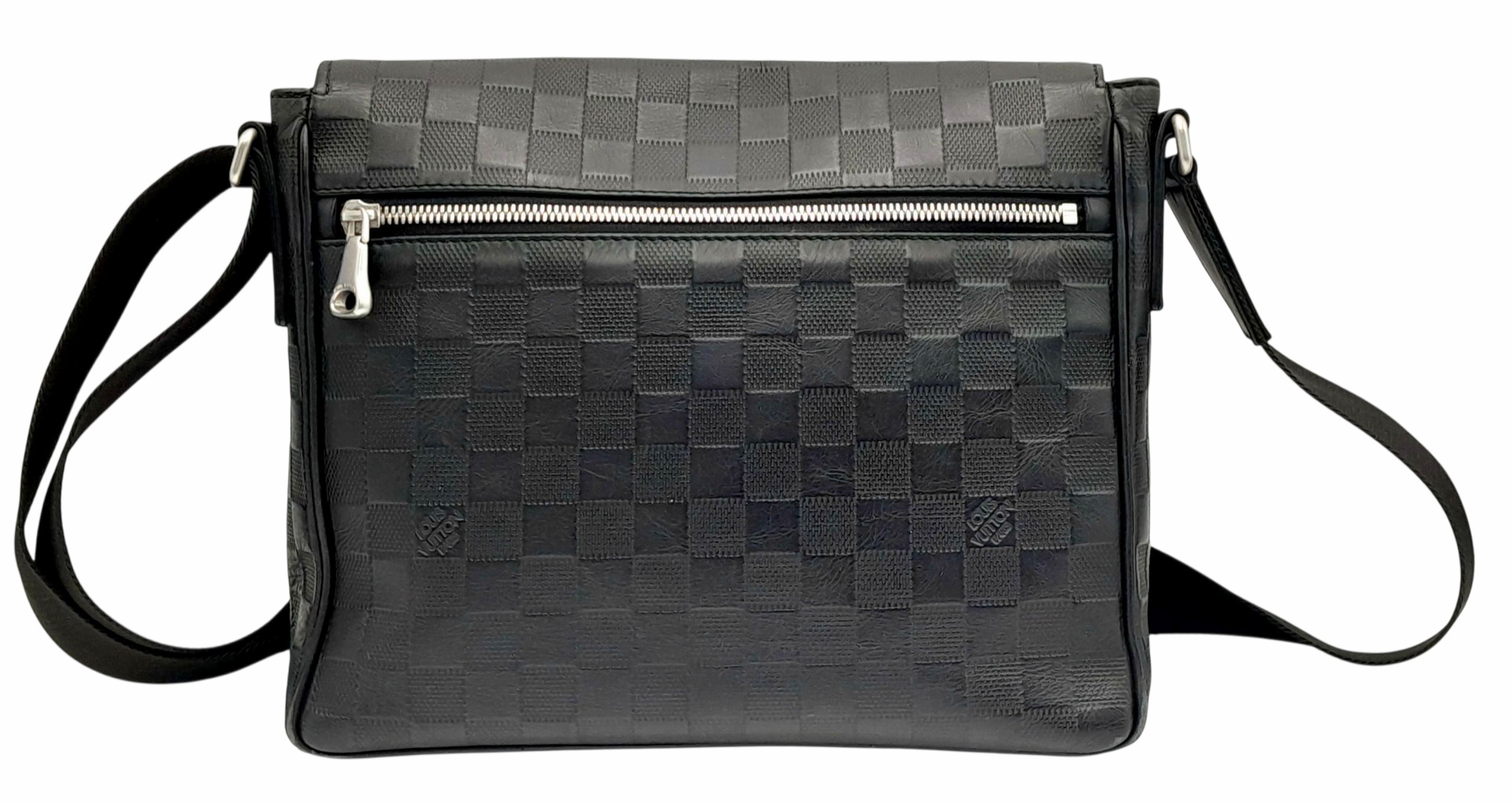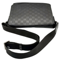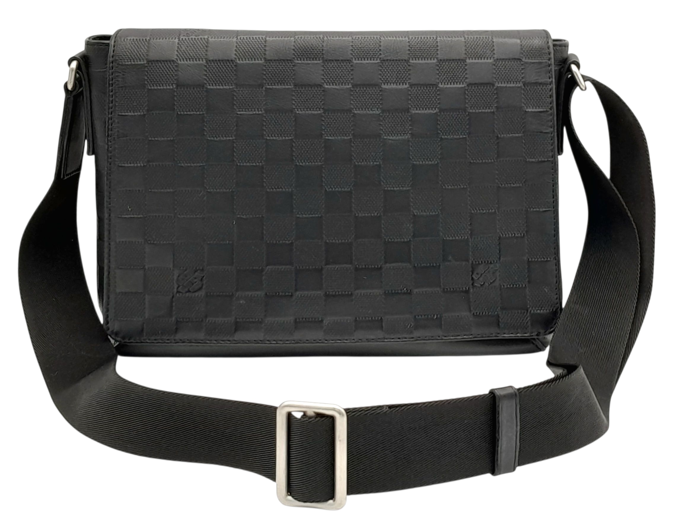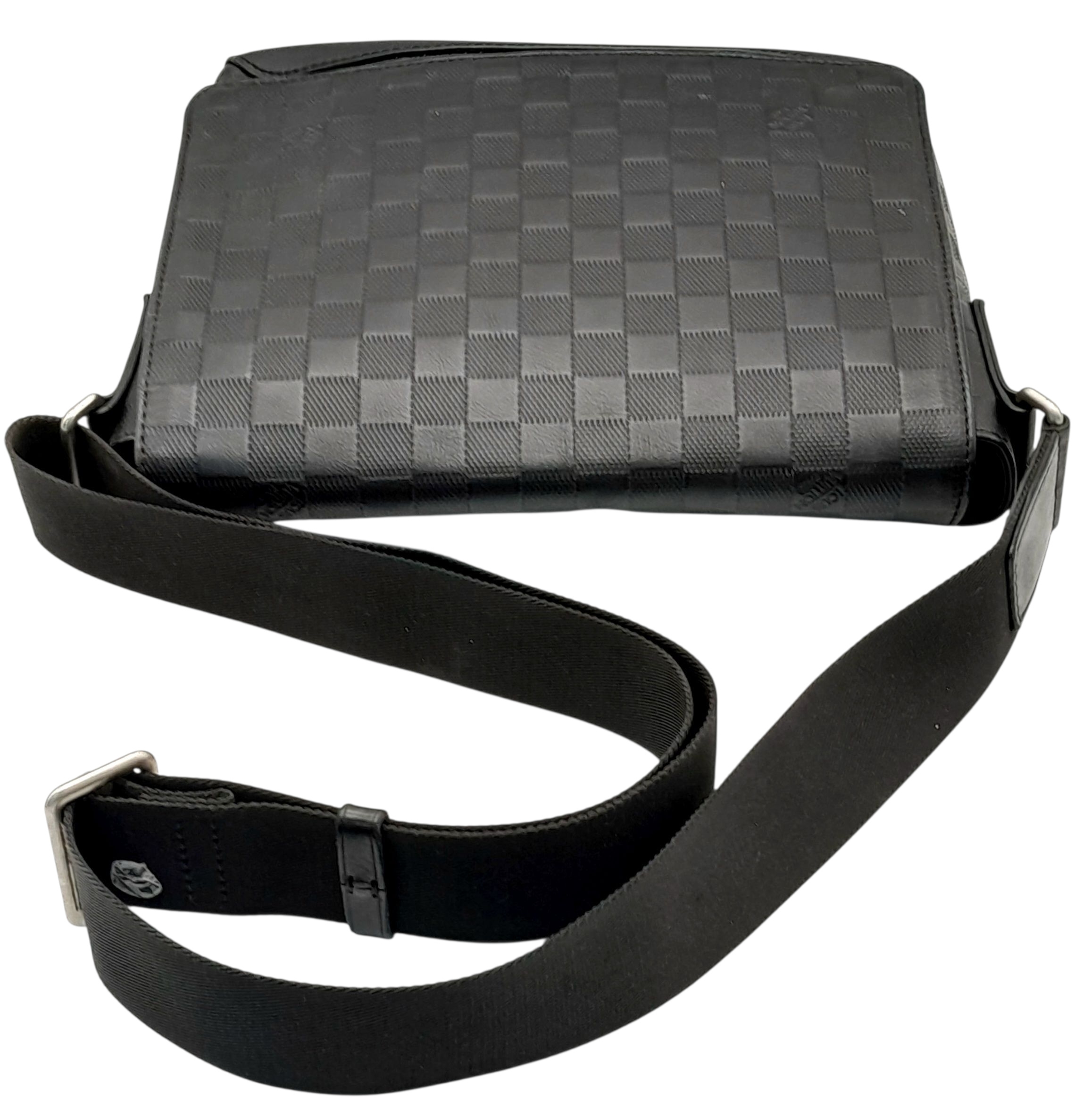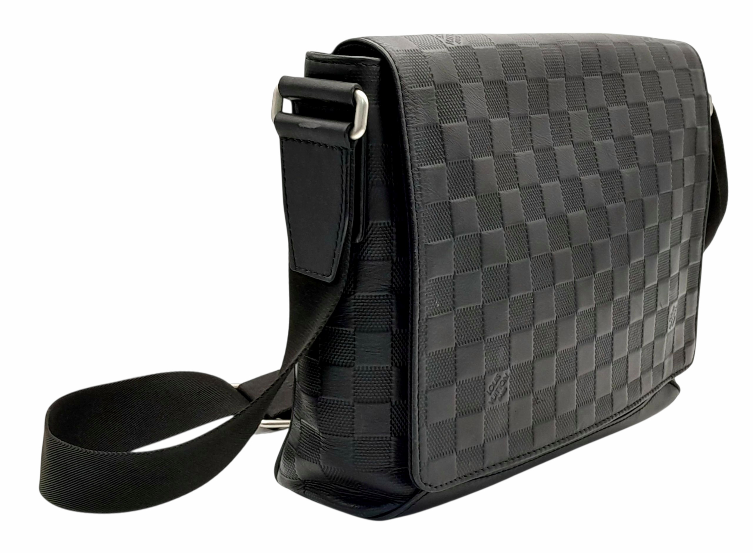 A Louis Vuitton Black Damier District PM Messenger Bag. Leather exterior with silver-toned hardware, textile adjustable strap and magnetic closure. Black textile interior with three open pockets. Approximately 29cm length x 22cm height. Signs of wear to corners, some scuffs to exterior, some light stains to interior - please see photos for conditions or request a condition report. . REF: STK024808