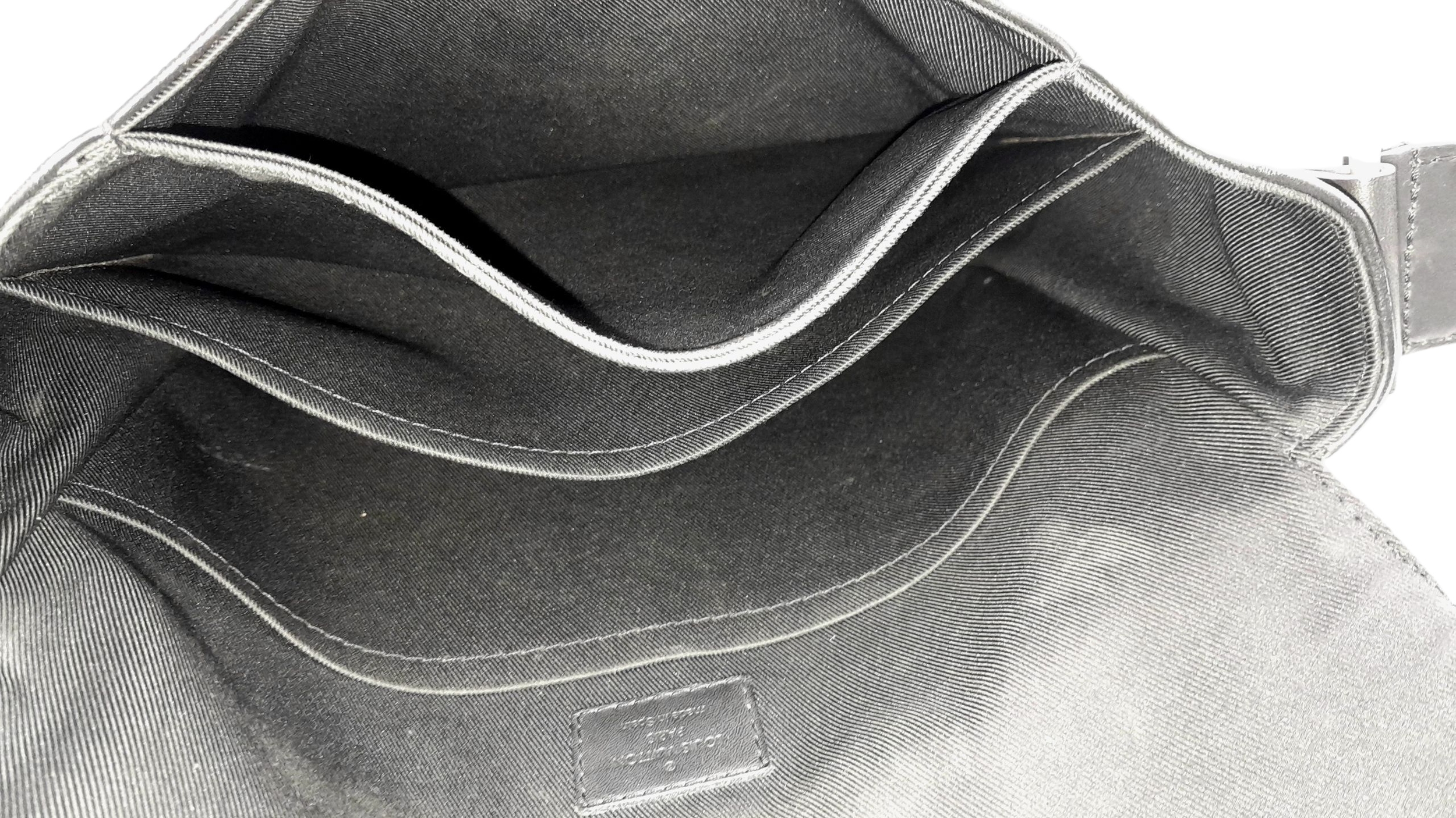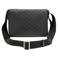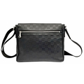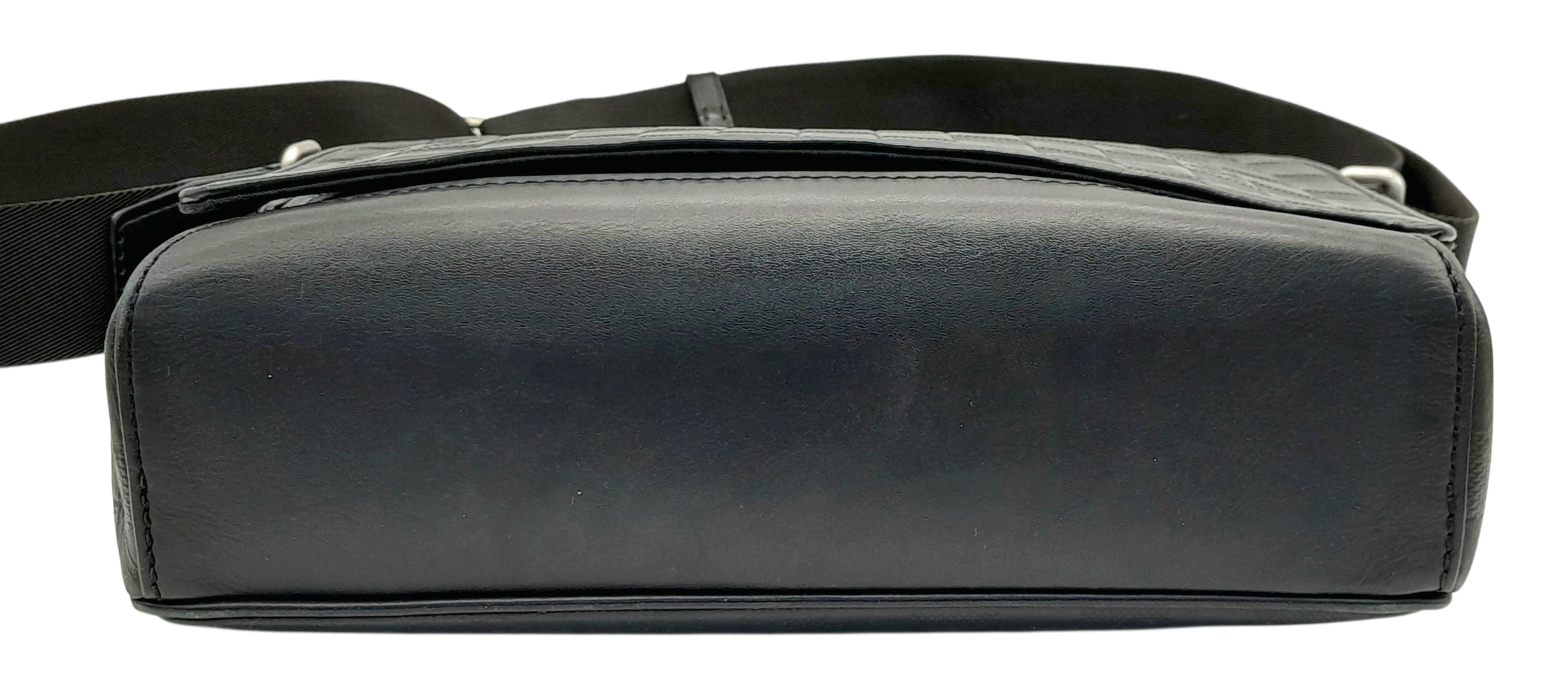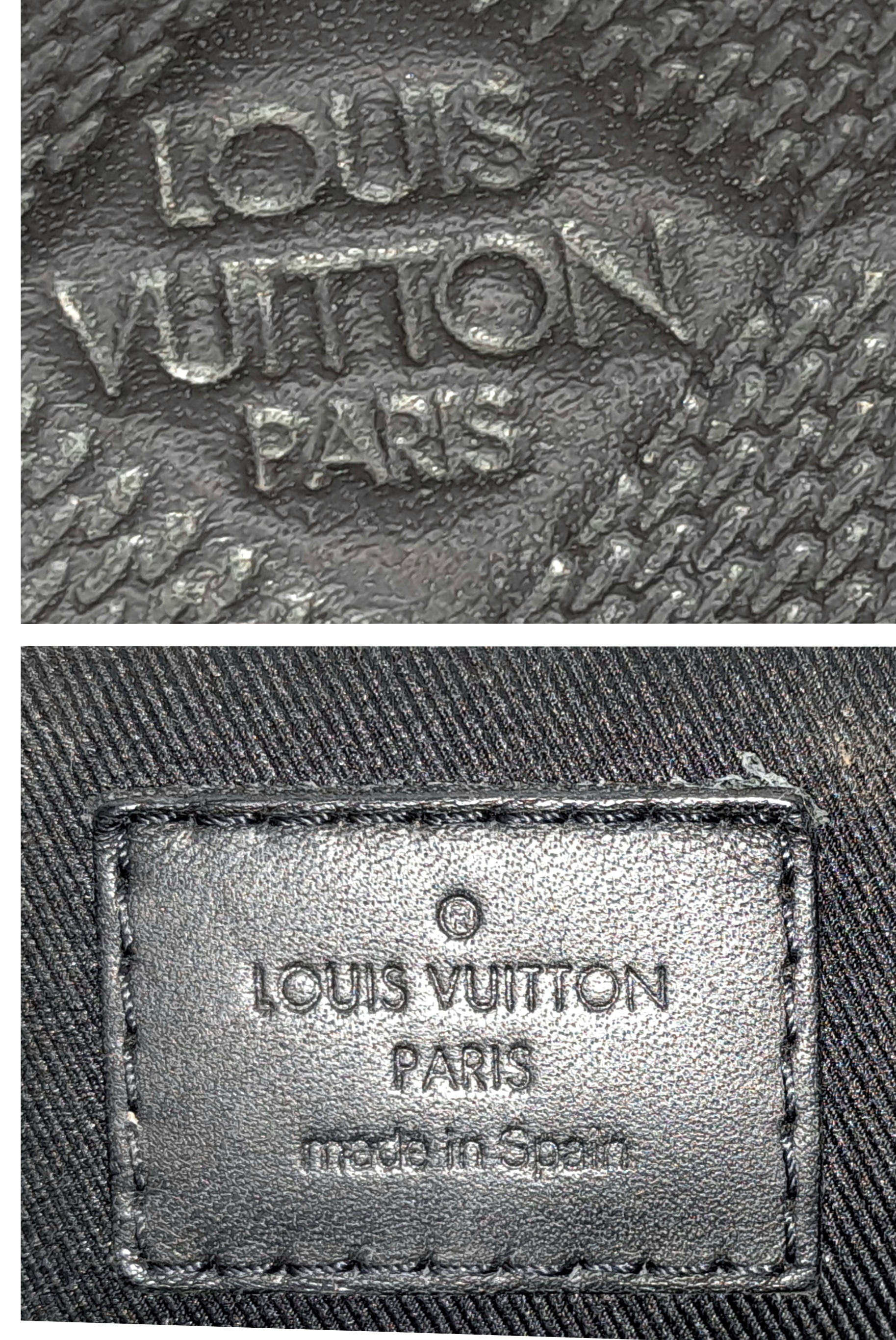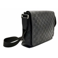 A Louis Vuitton Black Damier District PM Messenger Bag. Leather exterior with silver-toned hardware, textile adjustable strap and magnetic closure. Black textile interior with three open pockets. Approximately 29cm length x 22cm height. Signs of wear to corners, some scuffs to exterior, some light stains to interior - please see photos for conditions or request a condition report. . REF: STK024808