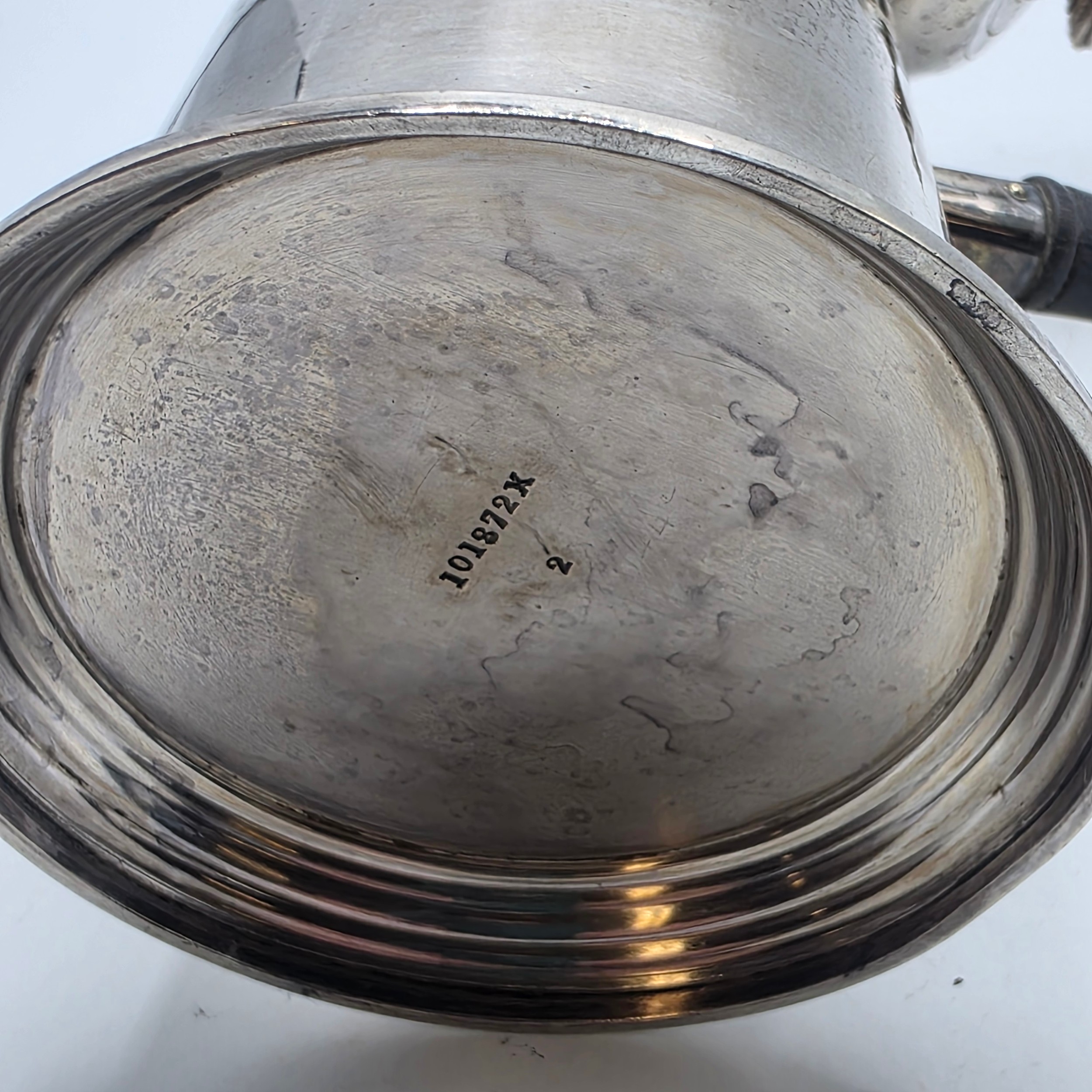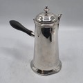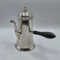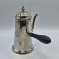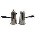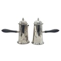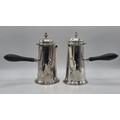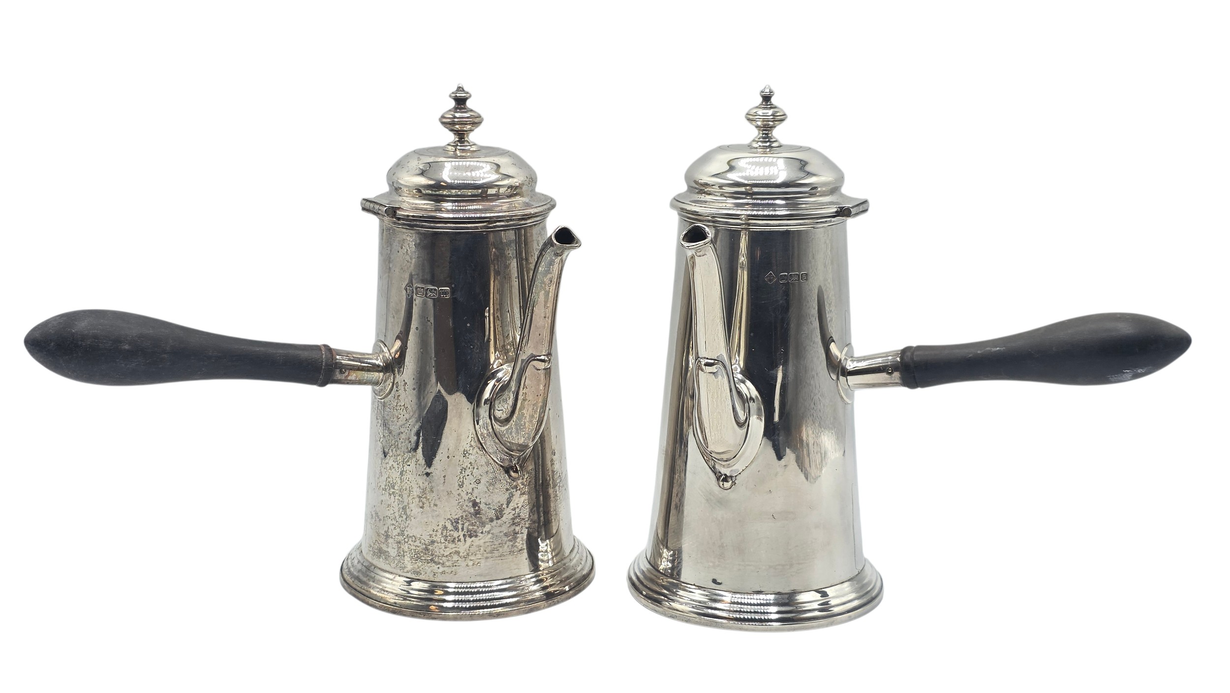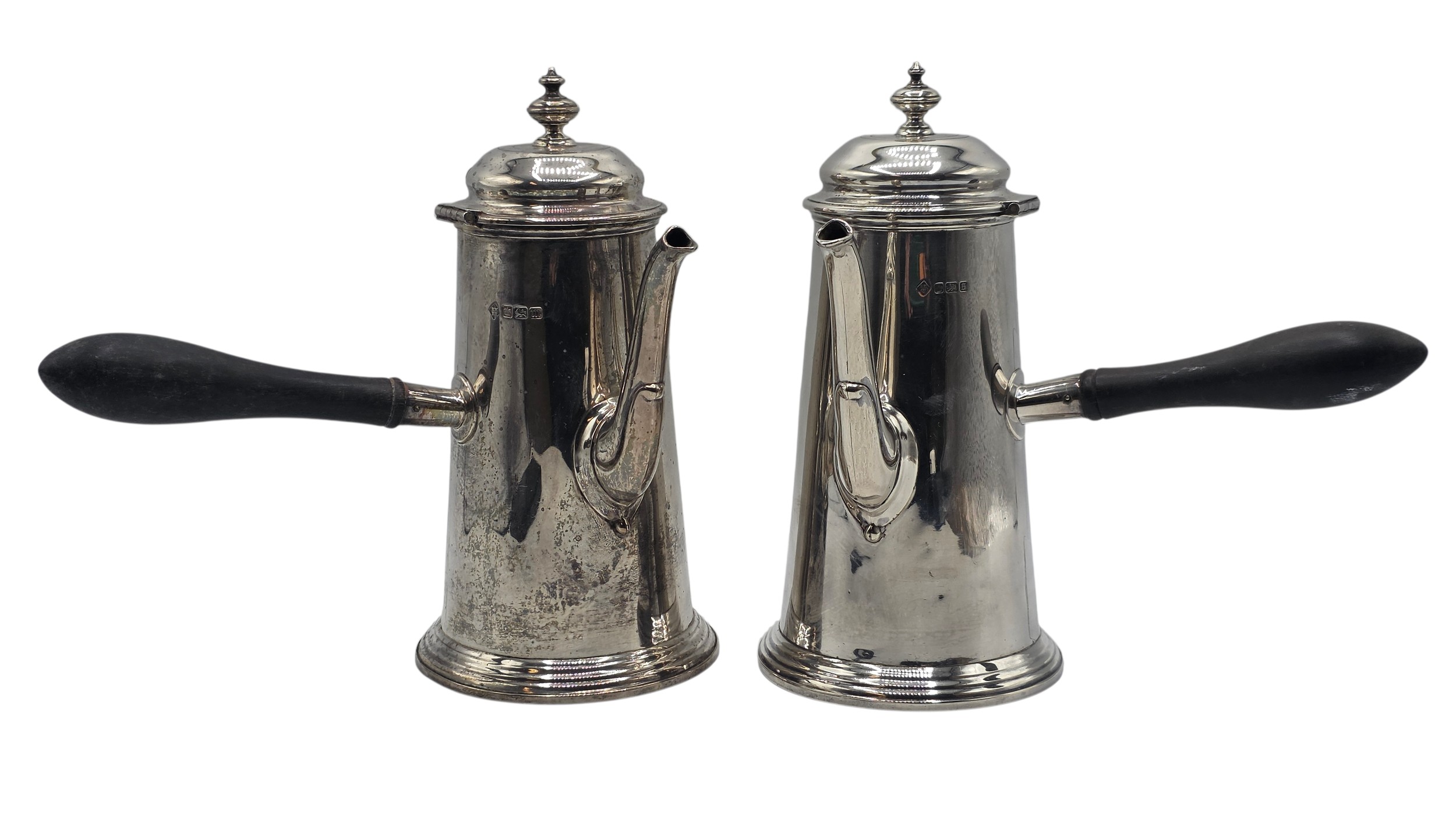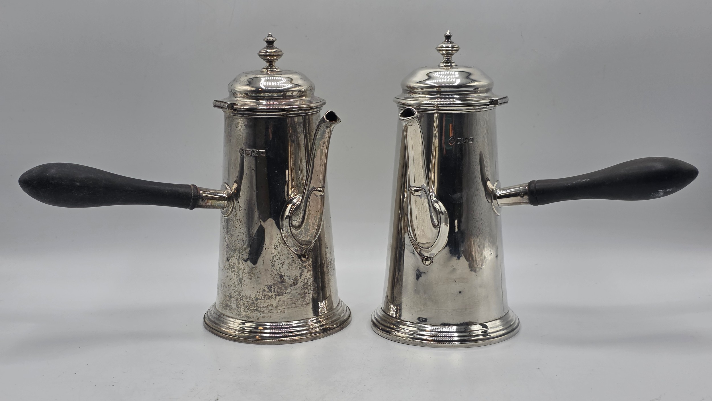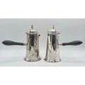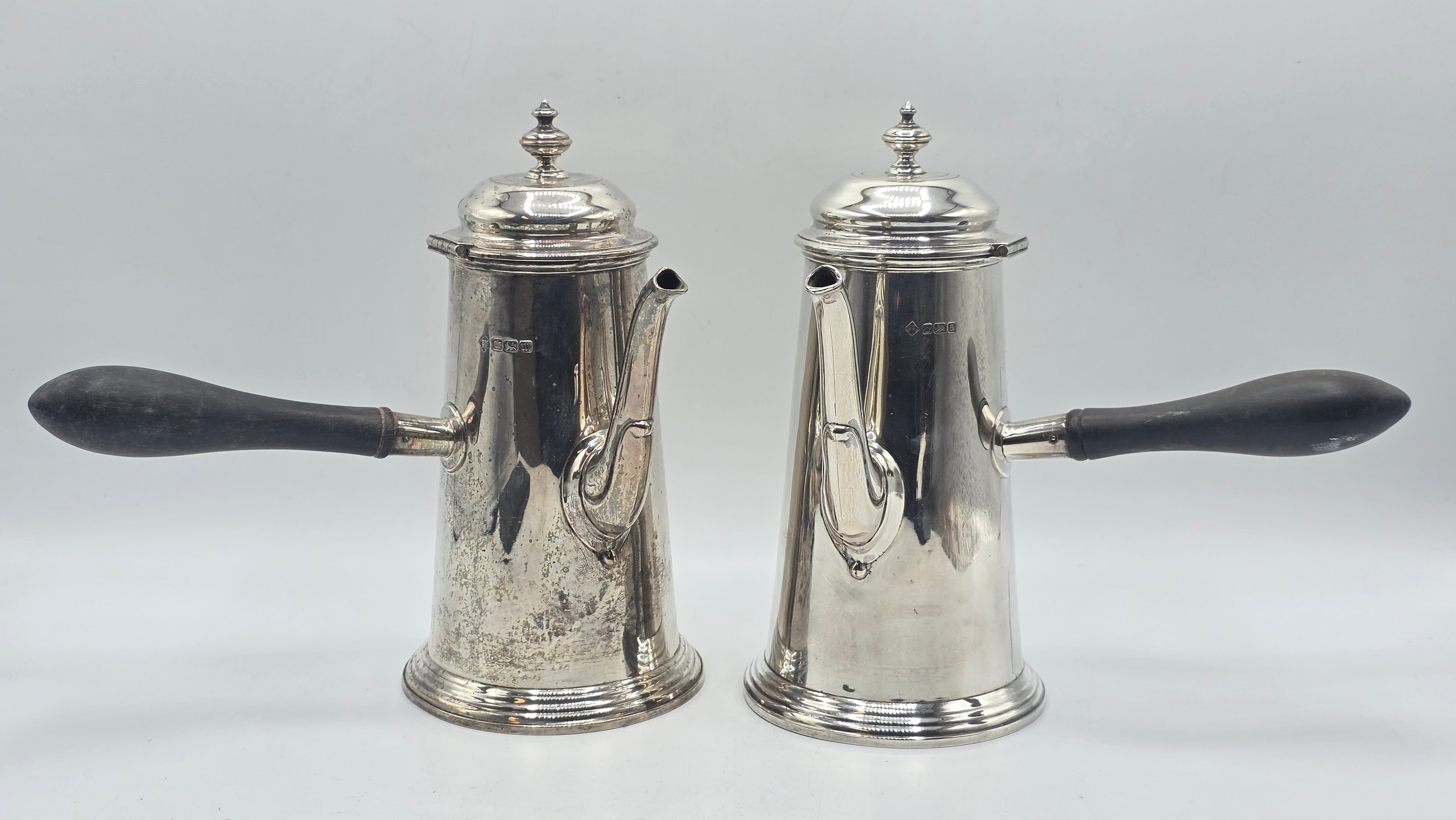 A matched pair of sterling silver chocolate pots with ebonised handles, Martin Hall & Co. Sheffield 1904 & 1910. Gross weight 816 g
