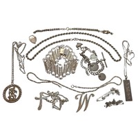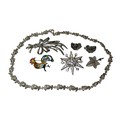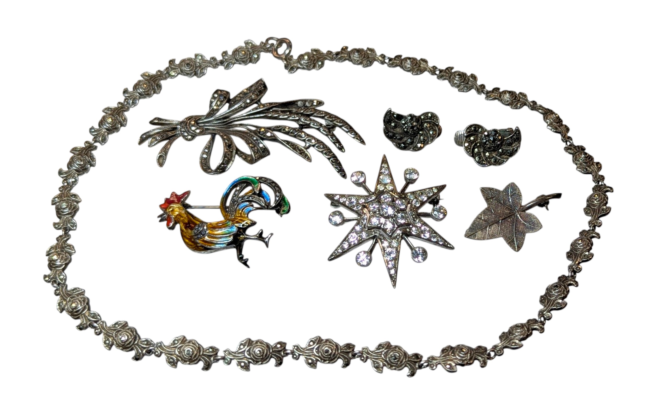 the silver jewellery includes; a "925" hallmarked silver marcasite set floral brooch, an "ENGLAND SILVER" stamped rose flower design marcasite set articulated necklace, a pair of "SILVER" stamped marcasite set clip on earrings and a "STERLING" stamped marcasite set enamelled cockerel brooch, the unmarked white metal jewellery includes a paste stone star design brooch and a leaf brooch, approx. 52.3g gross, a/f