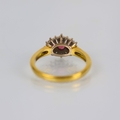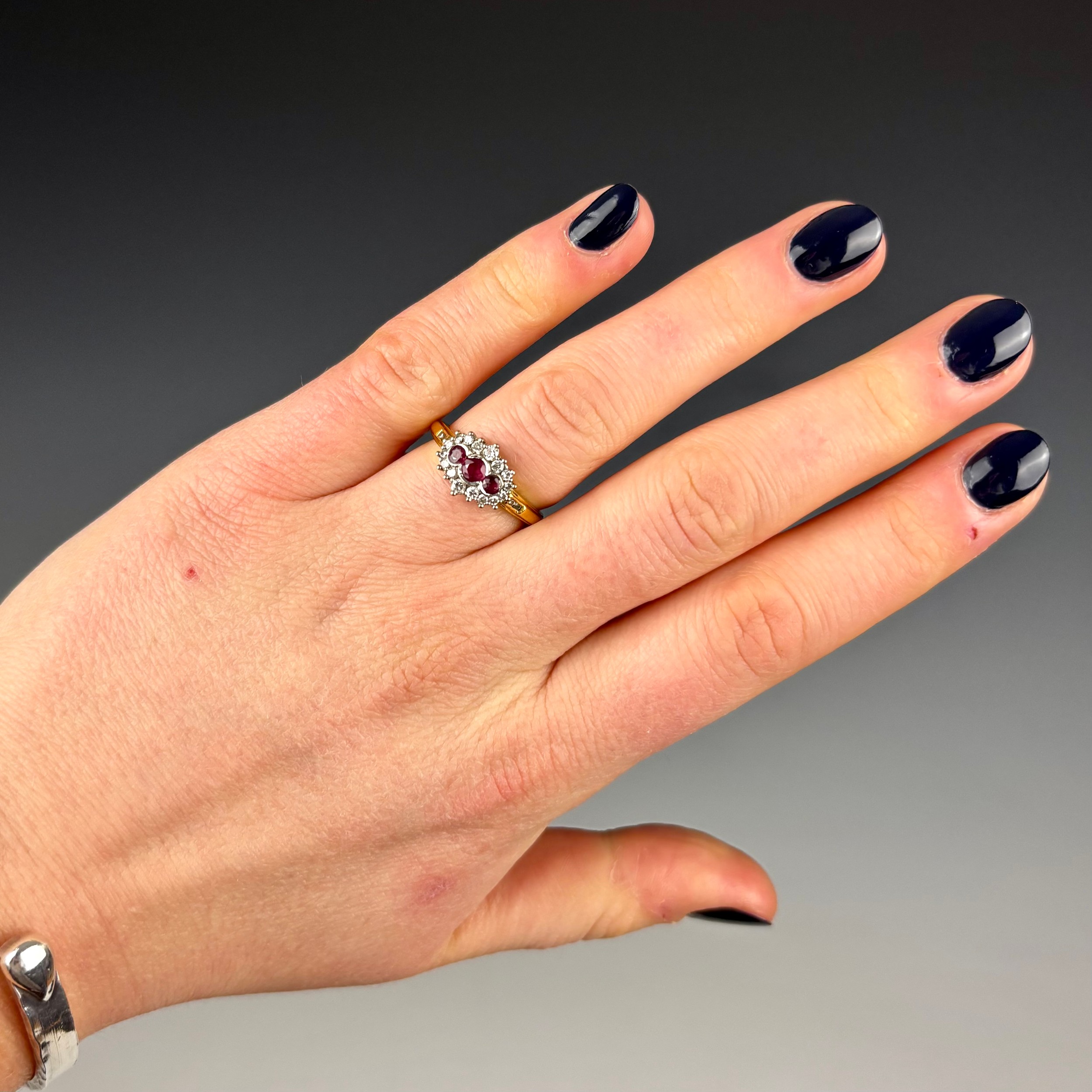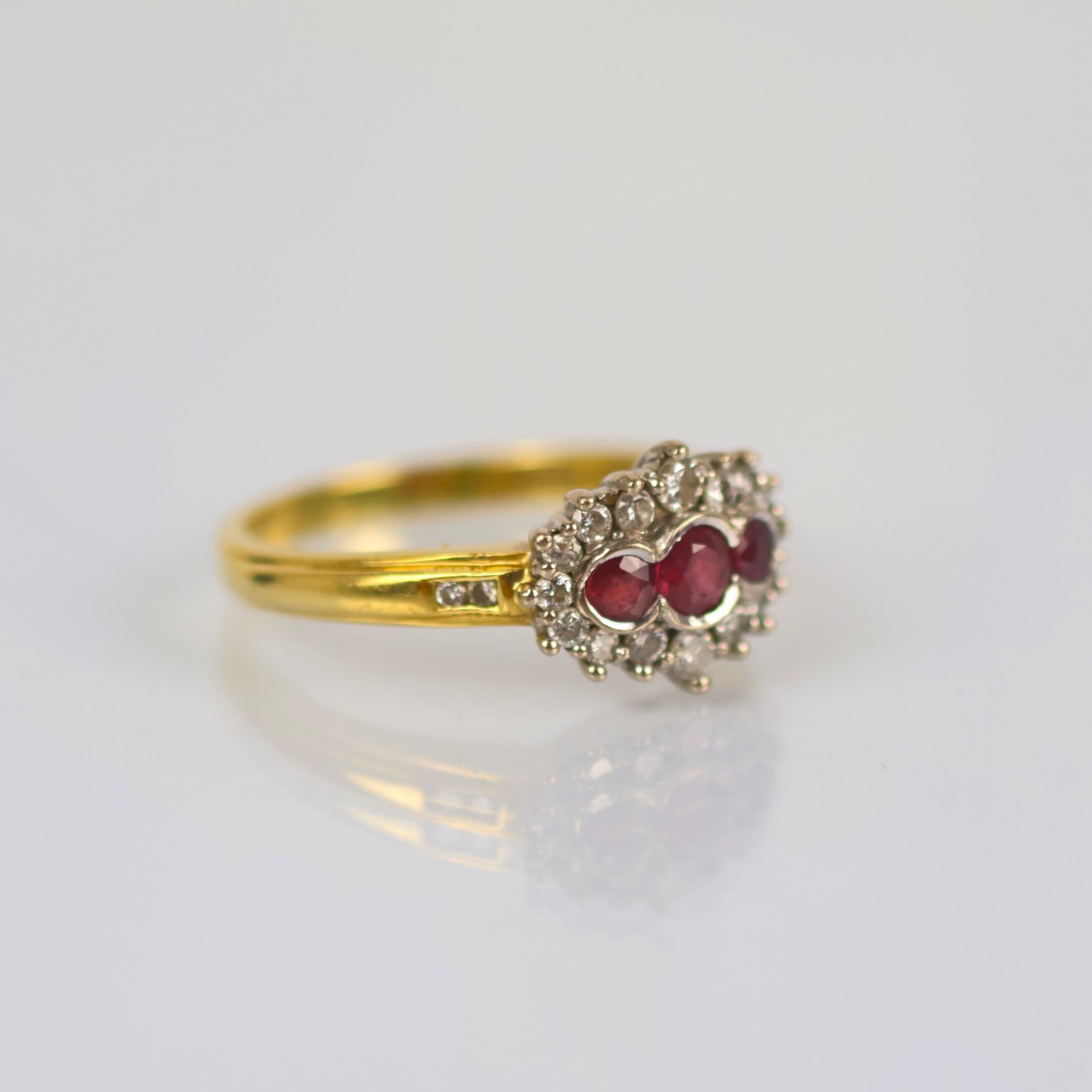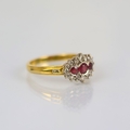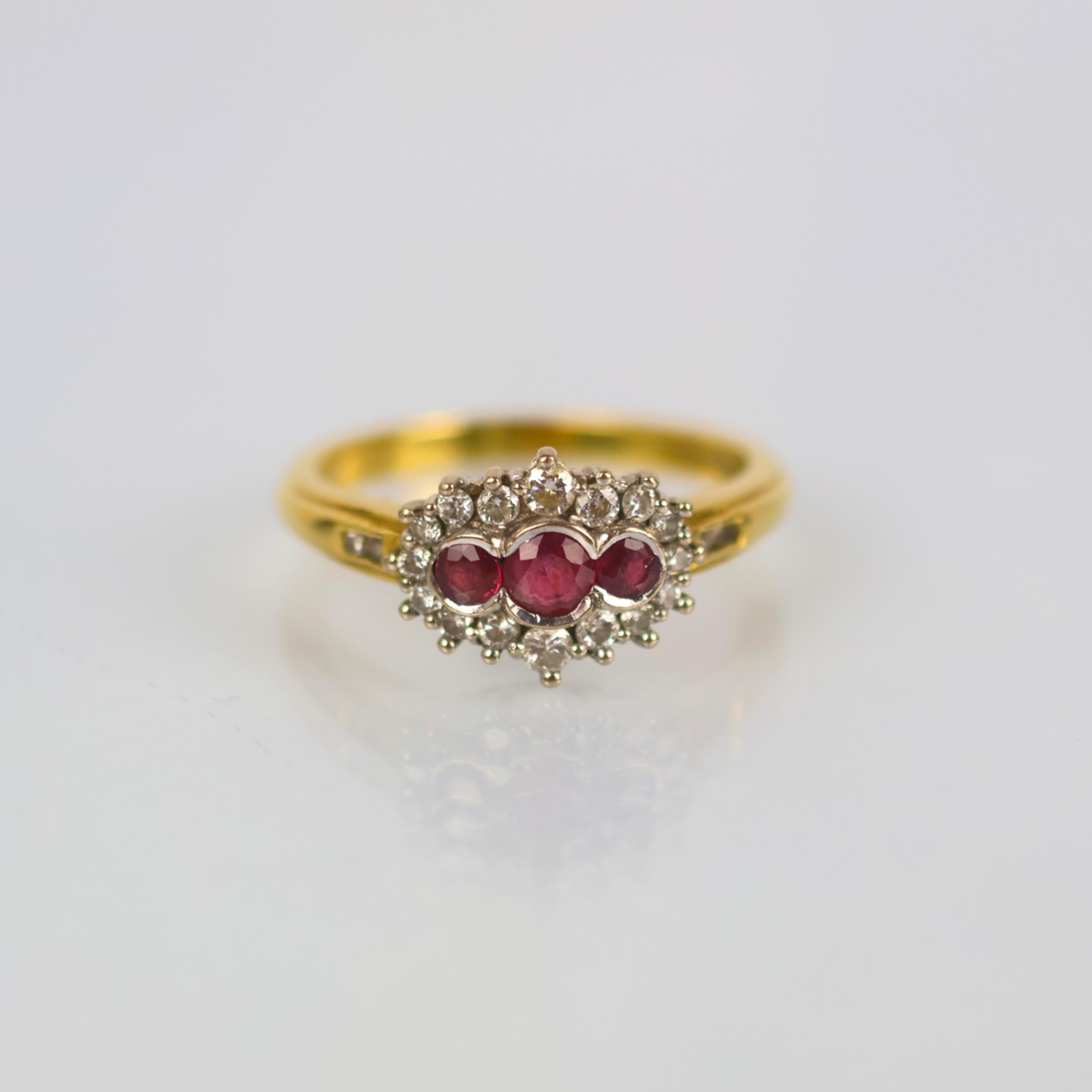 A late 20th century 18ct yellow gold ruby and diamond dress ring, the central trio of round cut rubies, set in rub over mount with surround of round cut diamonds, leading to plain polished shank, hallmarked to interior, ring size O1/2, 4.3gms
