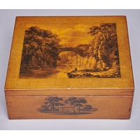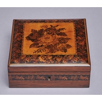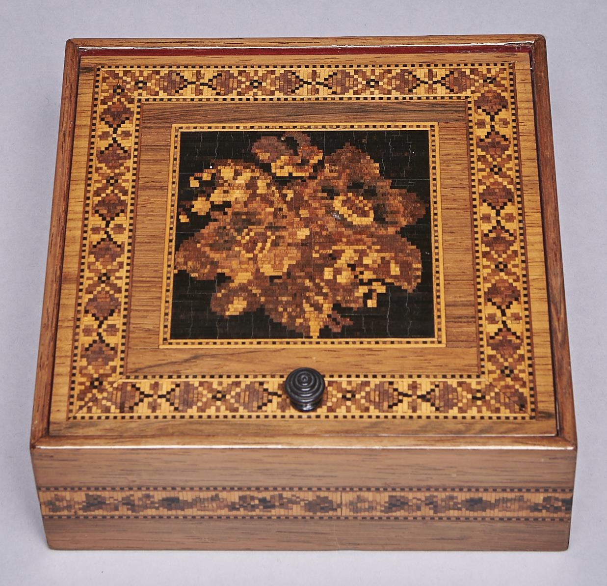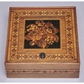 A Victorian Tunbridge work box, late 19th c, the lid decorated with flowers on a black ground, silk lined, 15 x 15cm