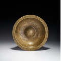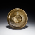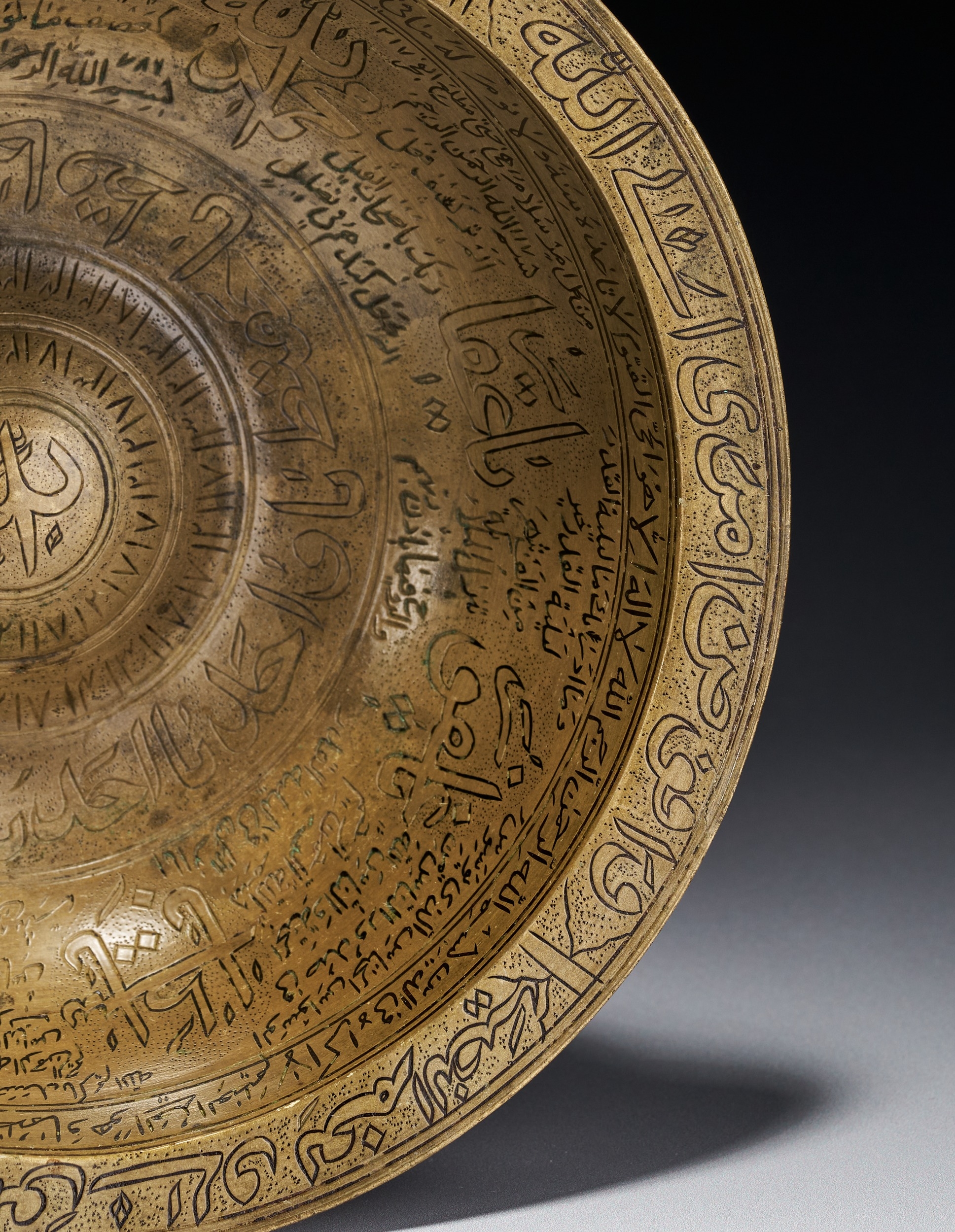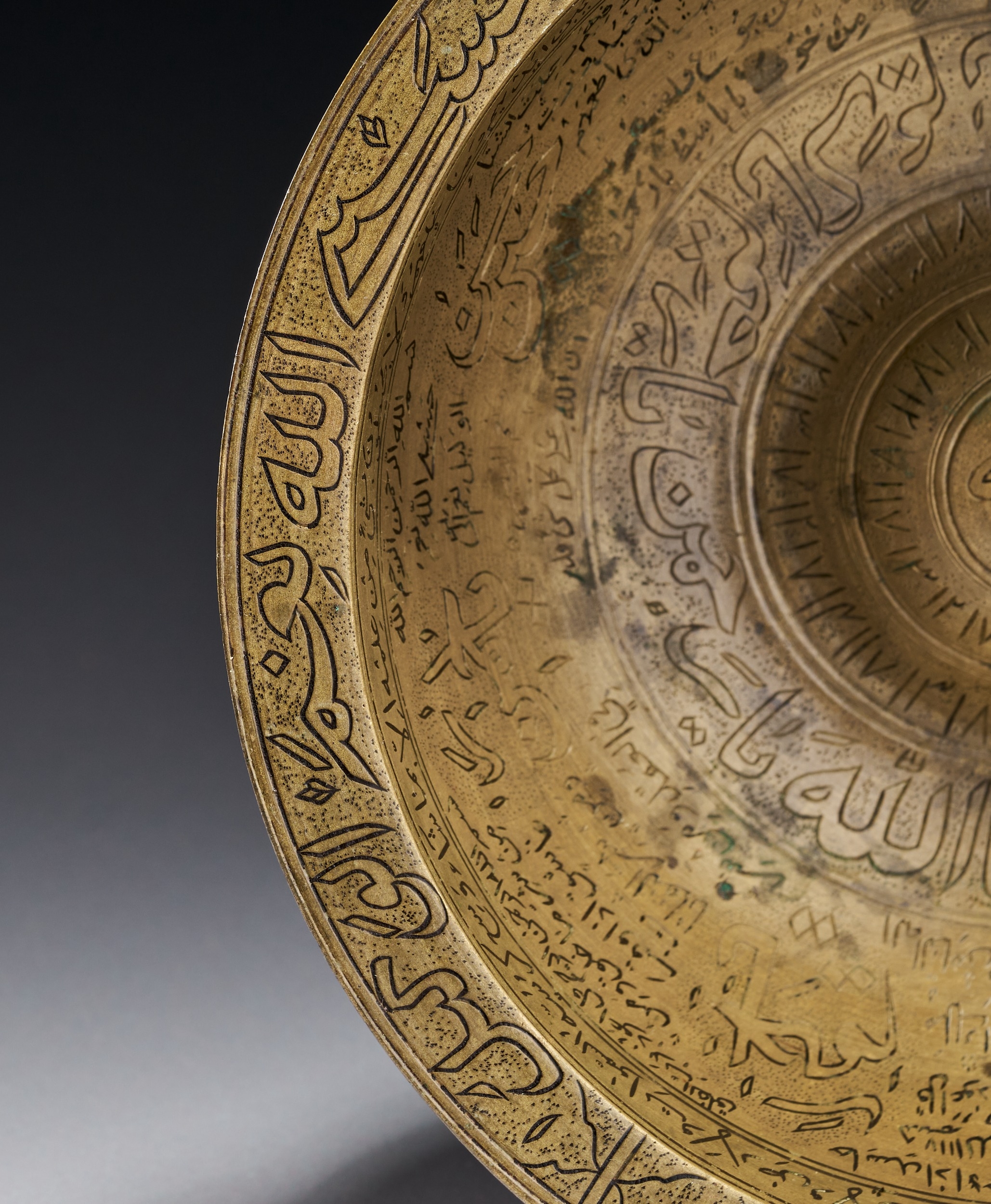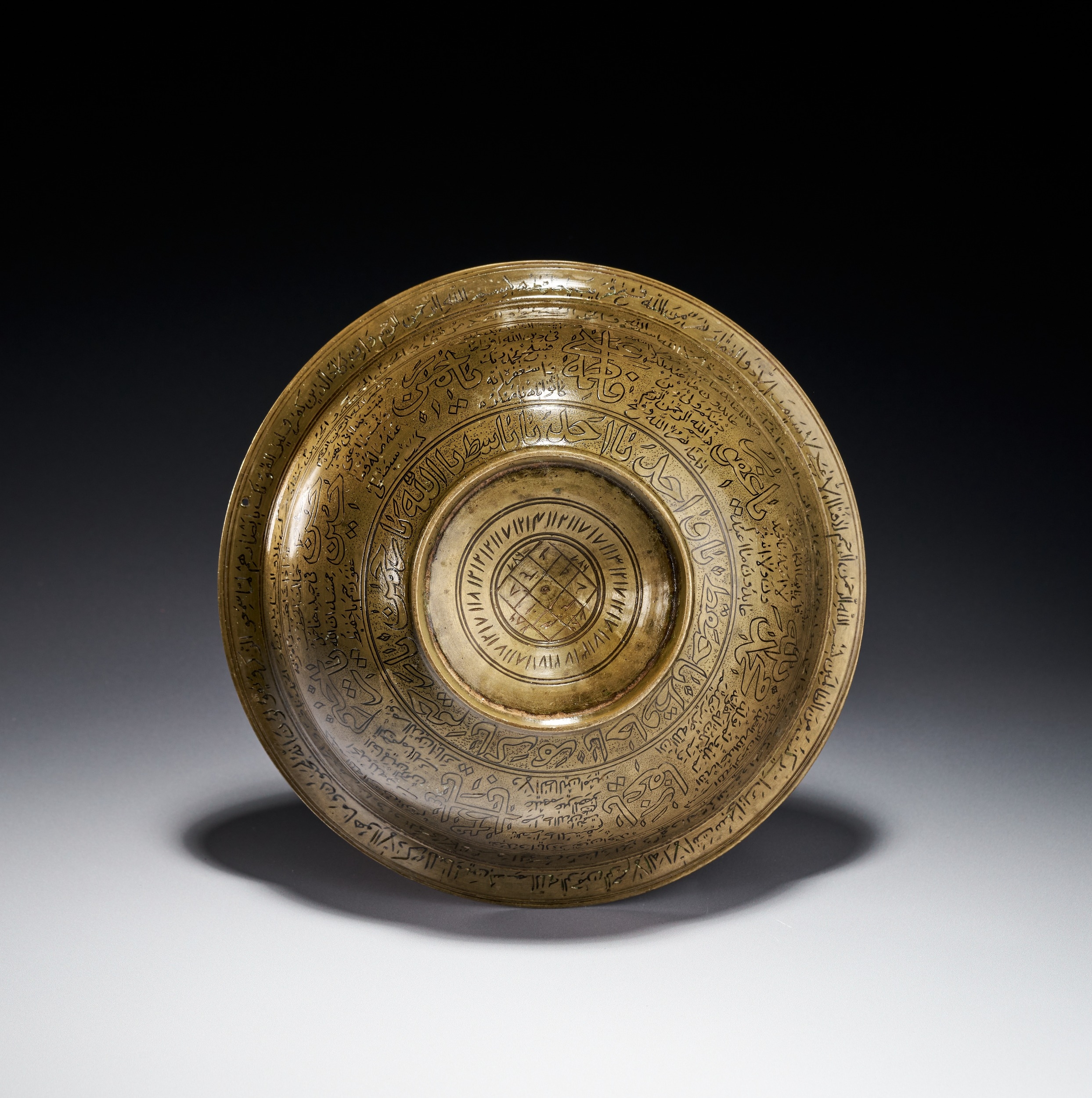 This engraved brass magic bowl is a talismanic vessel of shallow circular form featuring a central raised boss known as an omphalos. Constructed from a copper alloy, the object is decorated throughout with dense incised calligraphic and talismanic inscriptions. The interior rim is bordered by a continuous band of bold Thuluth script containing the Bismillah and other Quranic verses set against a stippled ground. The interior walls are divided into multiple concentric registers of Naskh and Thuluth script comprising Quranic citations, including the Ayat al-Kursi, and the Ninety-Nine Names of God. The central boss contains a calligraphic medallion. The underside of the bowl features concentric bands of text surrounding a central numerical magic square or buduh grid. The engraving technique utilizes stippling to provide contrast for the lettering. This type of vessel was traditionally used in the Persian and Indo-Persian cultural spheres for medicinal and protective purposes.