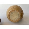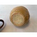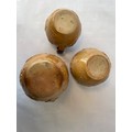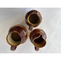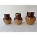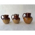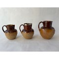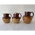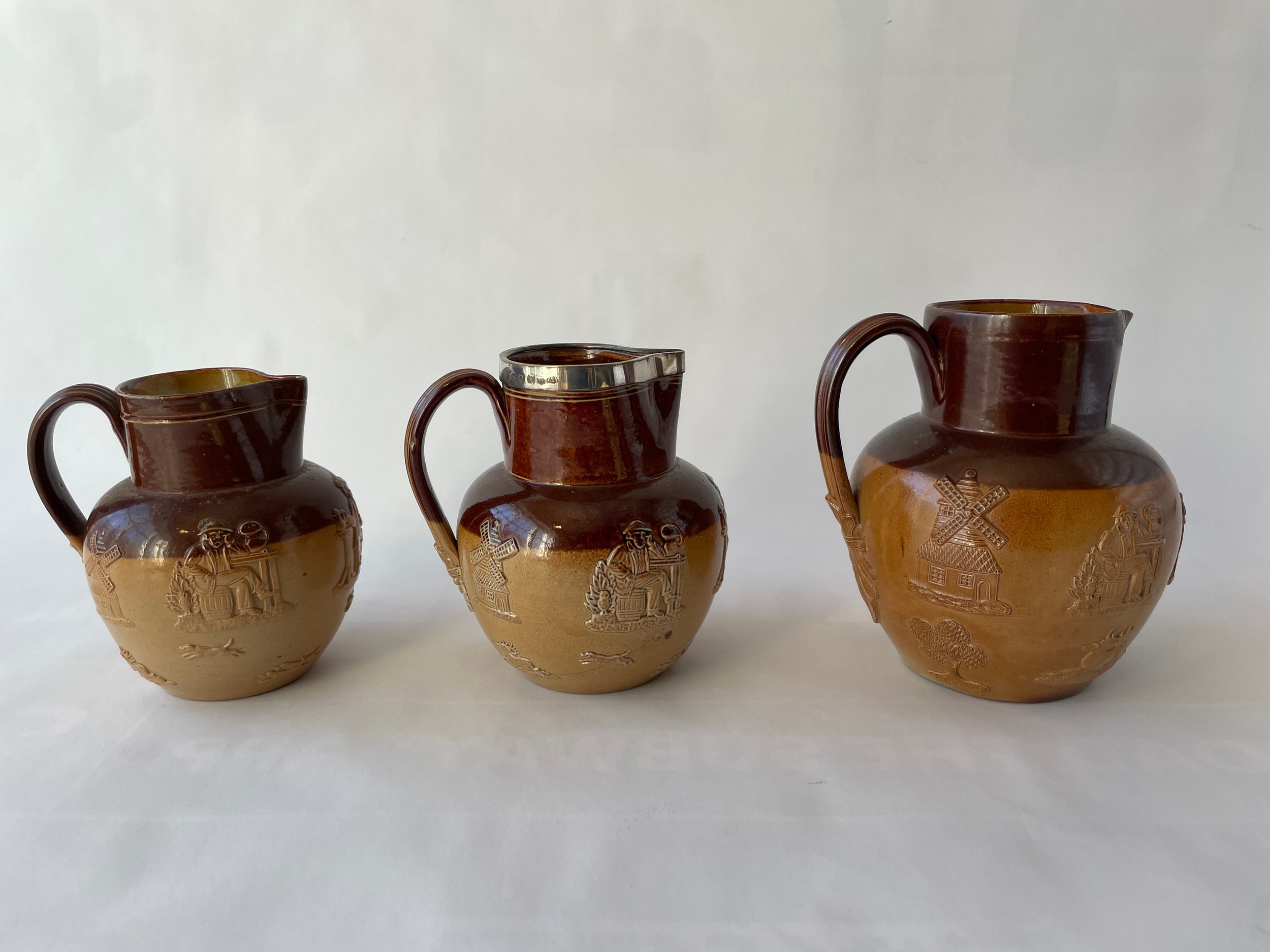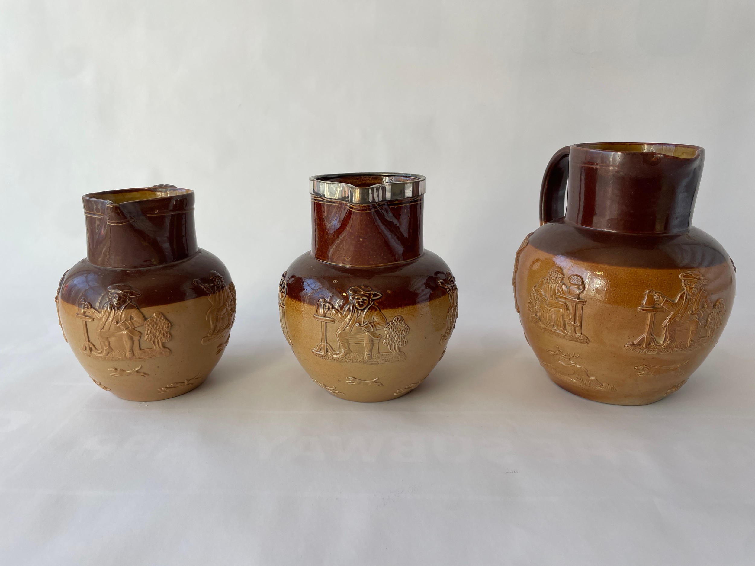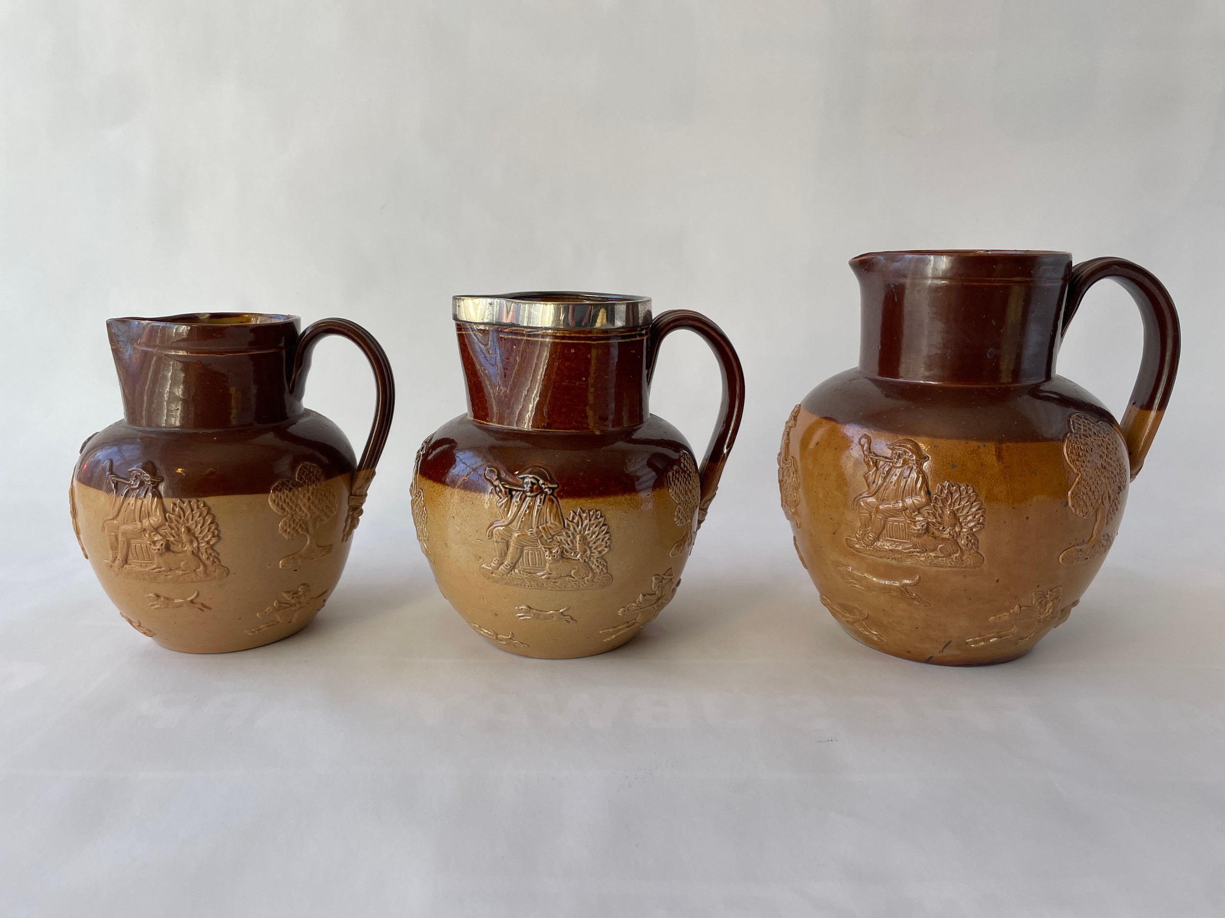 Collection of three antique Doulton Lambeth salt glazed stoneware jugs, one with silver rim. Harvest, tavern and hunting sprigged design. 17 cms, 15 cms and 14 cms high.