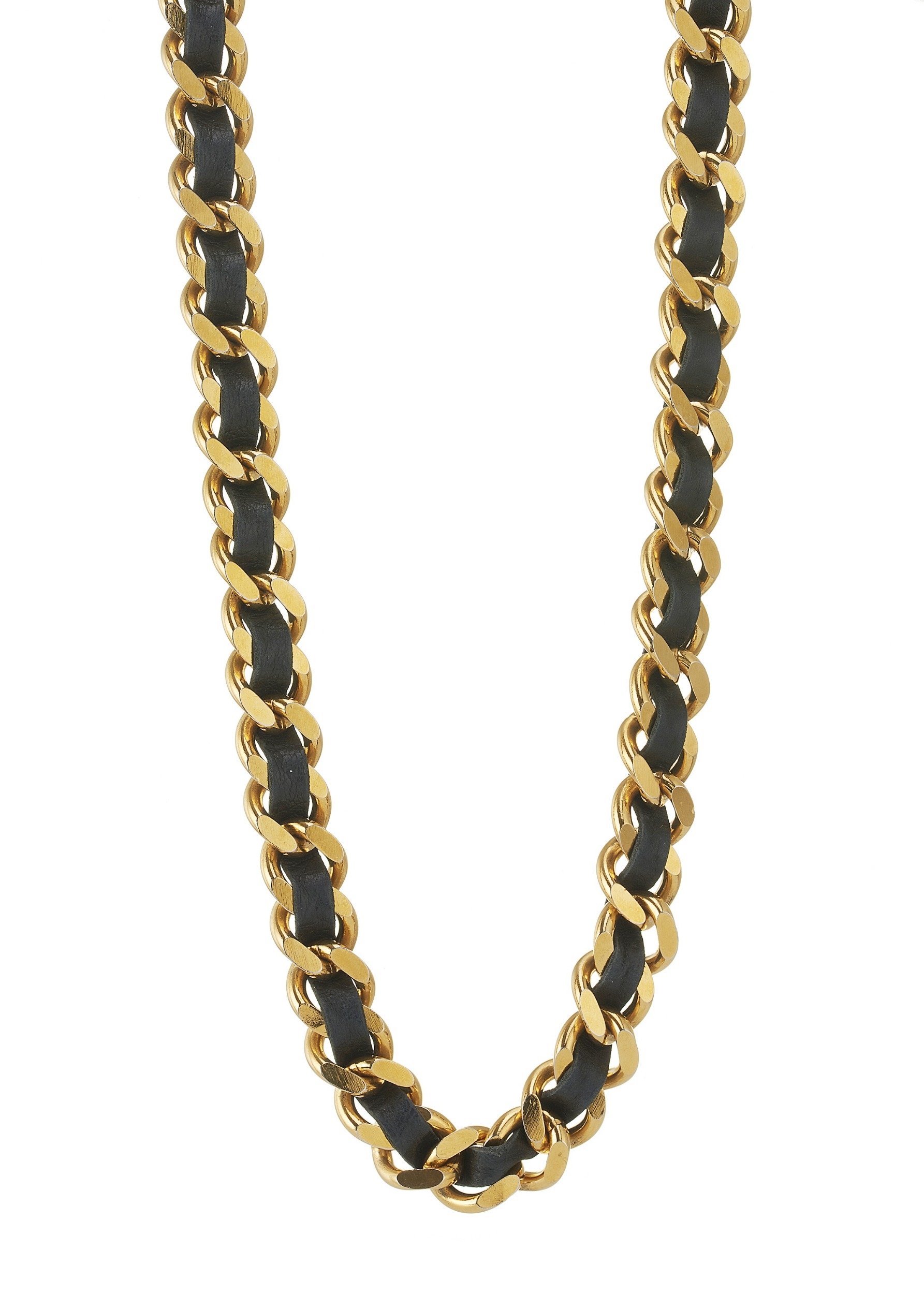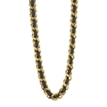 Chanel, a chain belt, interwoven black leather between the gold-tone chain belt, with Chanel panel, and detached Chanel medallion, signed Chanel, belt stamped 97P, length of belt 84cm, length of medallion 5.5cm