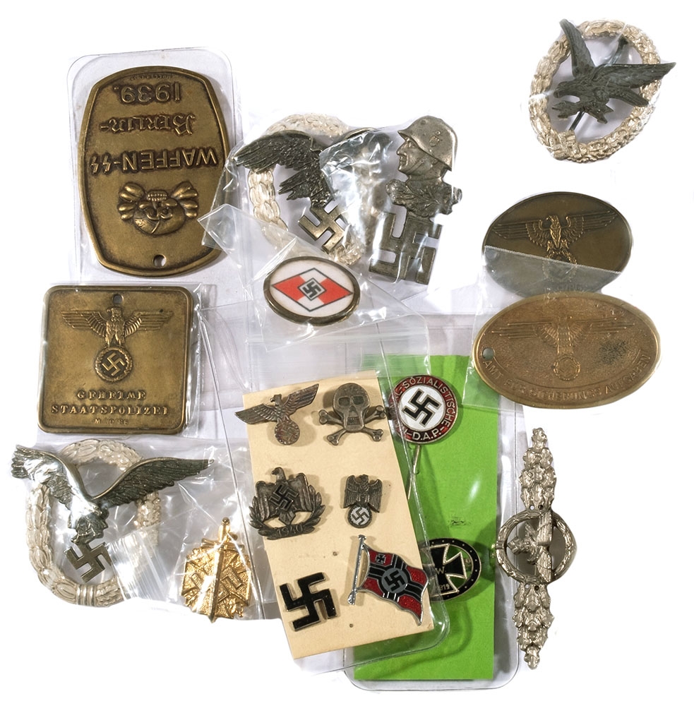 A collection of various German military badges including: NSDAP lapel badge and others (some reproductions)