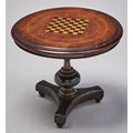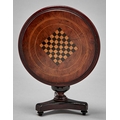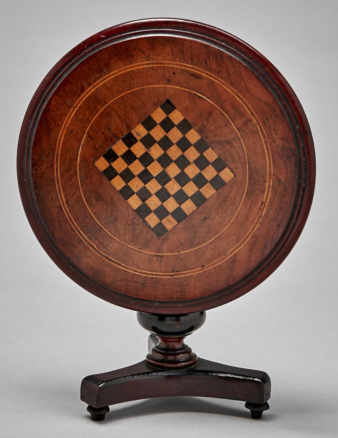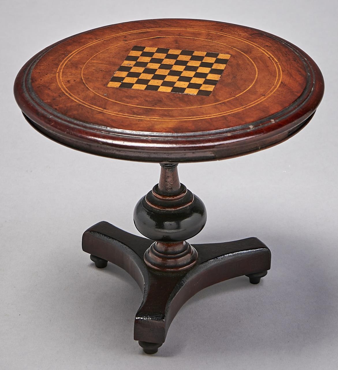 Miniature Furniture. A Victorian mahogany, walnut and inlaid tilt top table, on turned pillar and triform base, 17.5cm diam