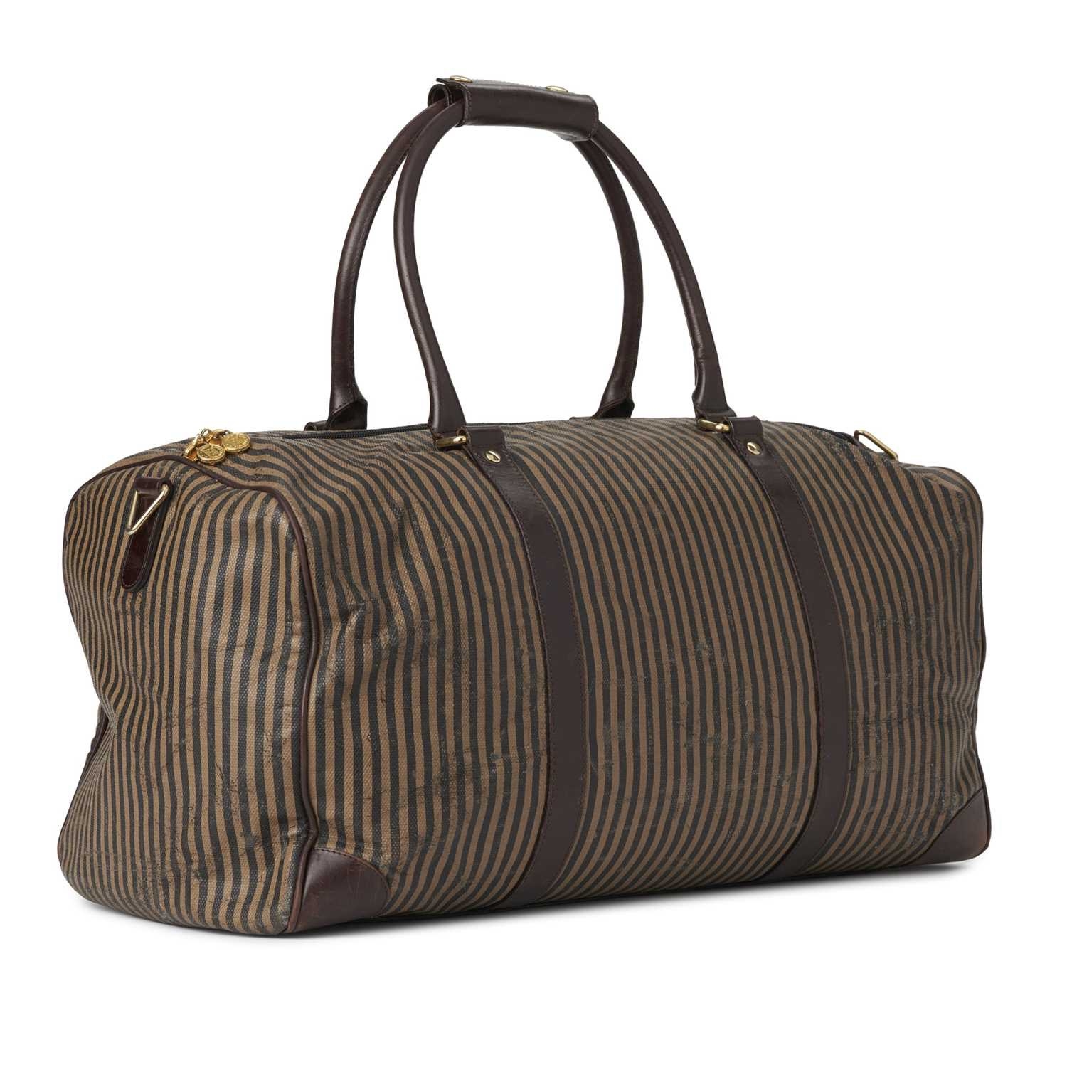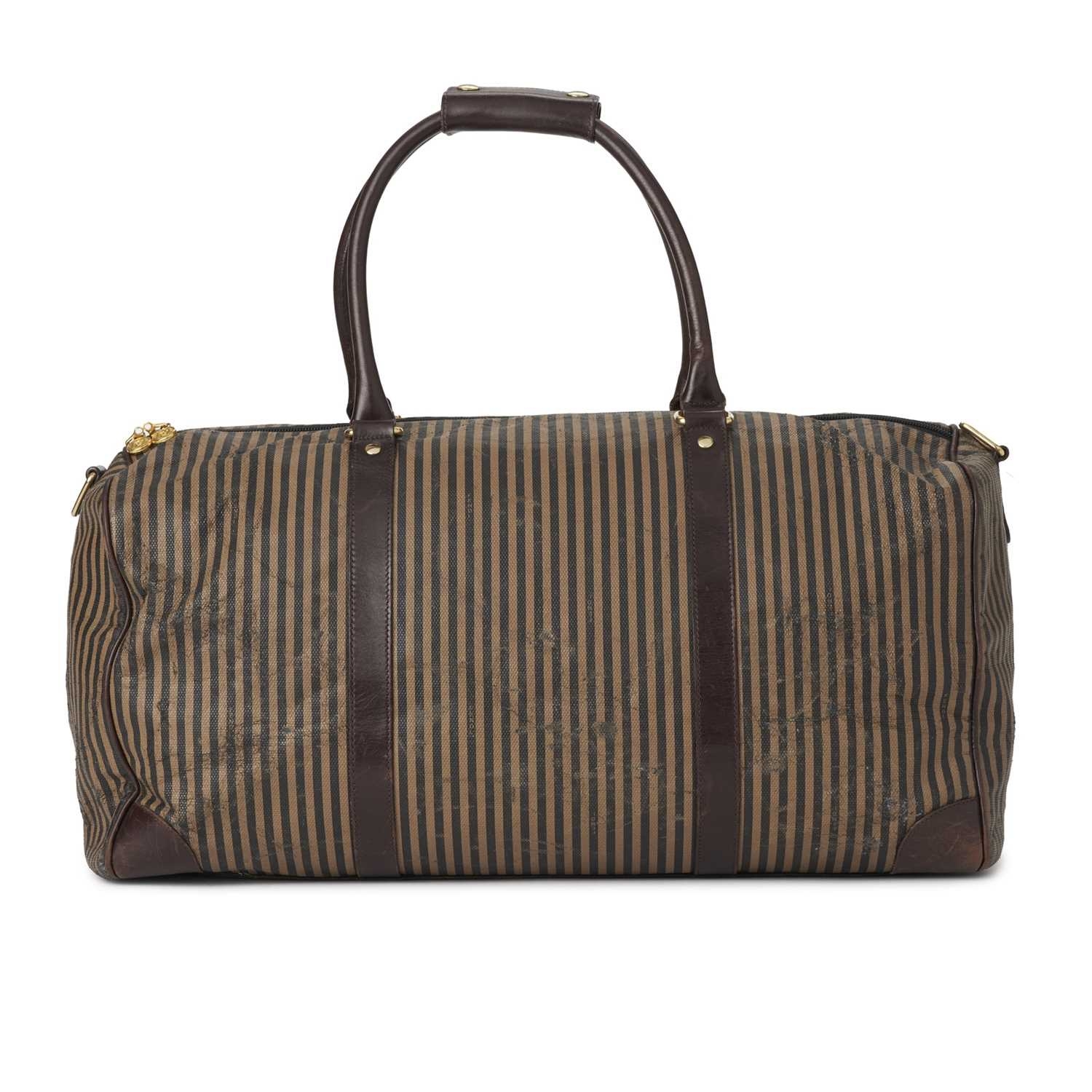 Fendi, a vintage holdall travel bag, crafted from tan and black striped coated canvas, with dark brown leather trim, rolled leather handles, double top zip fastening and one interior zip pocket, measuring 24 by 26 by 52cm