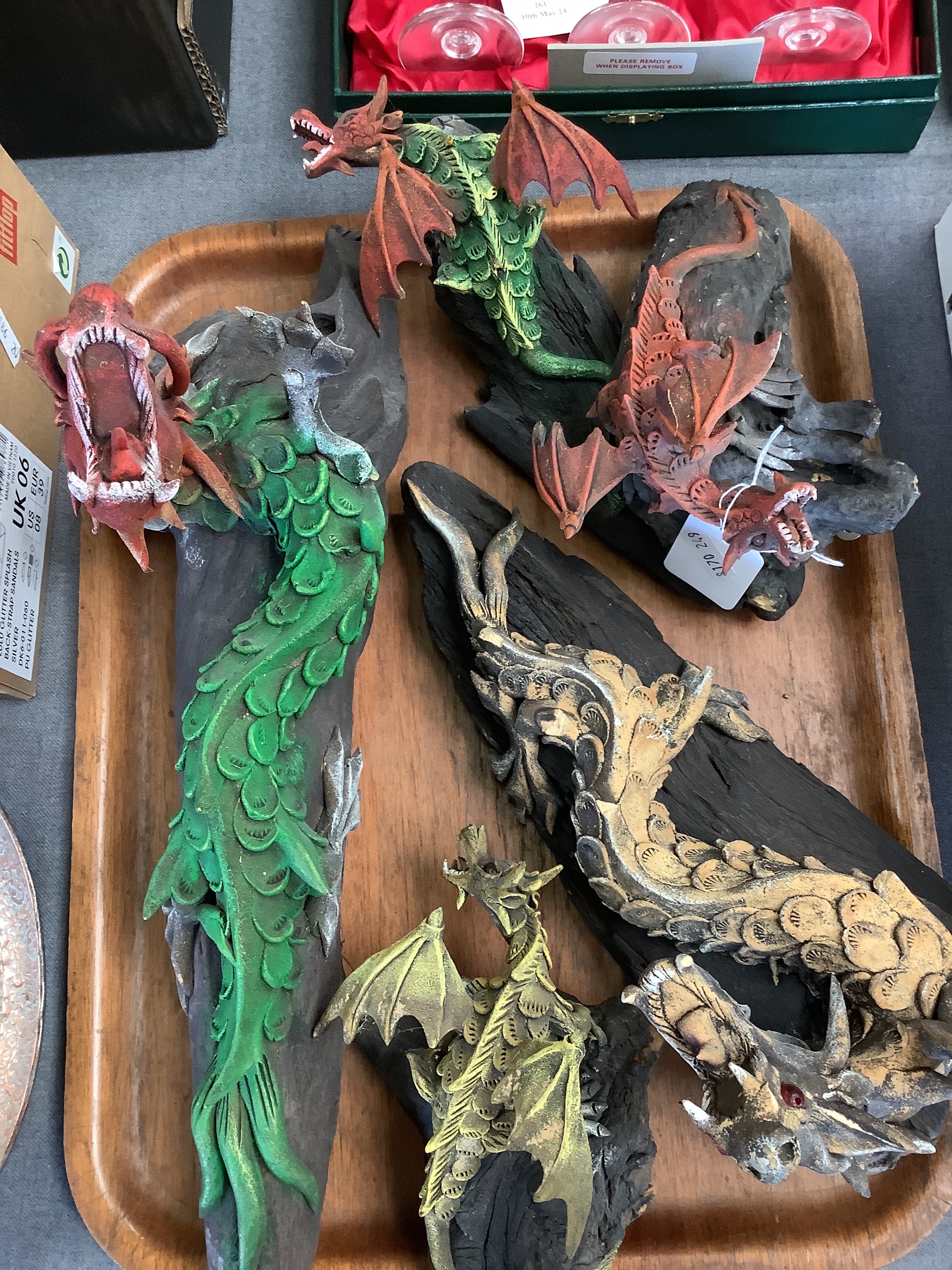 Five carved wooden dragons climbing trees