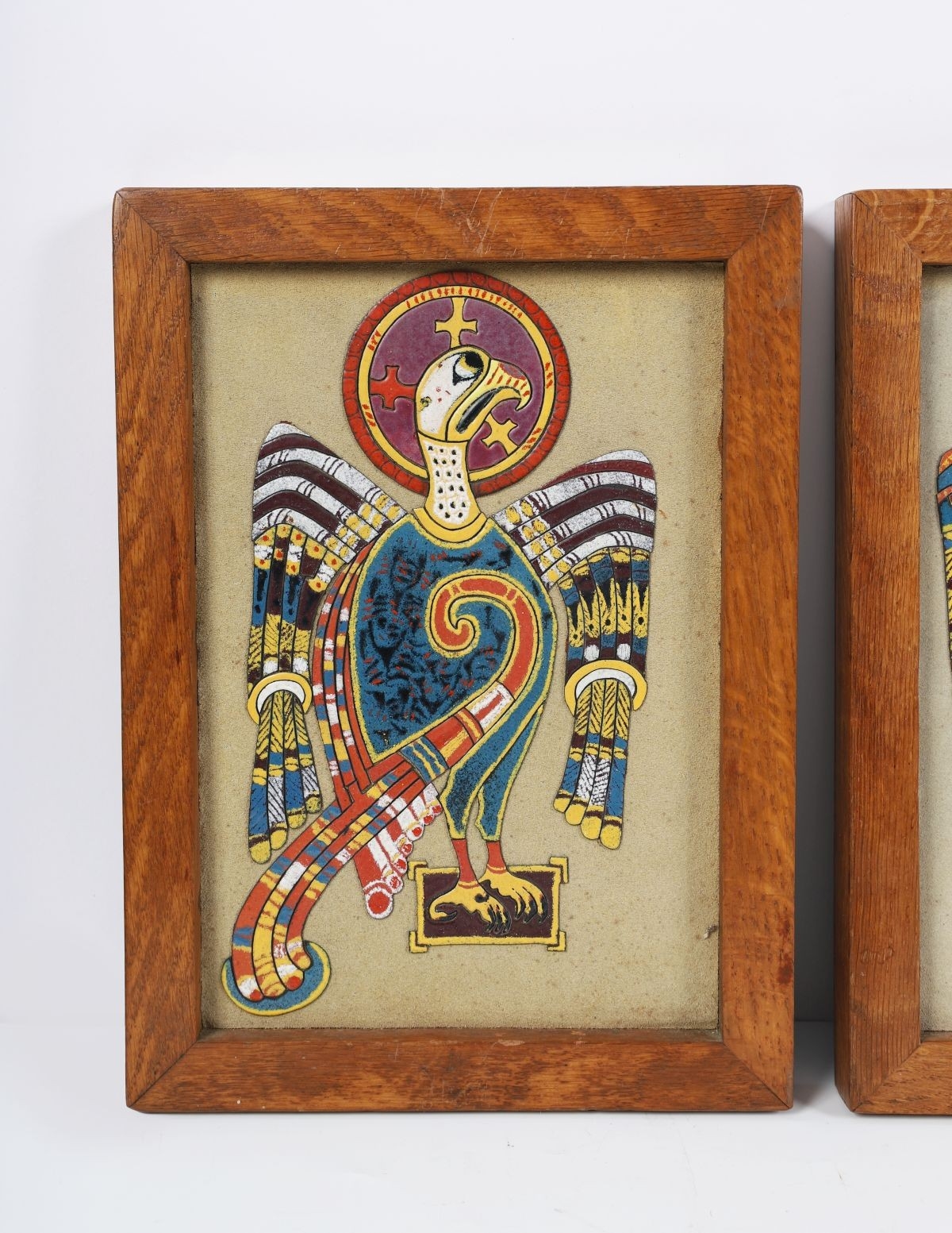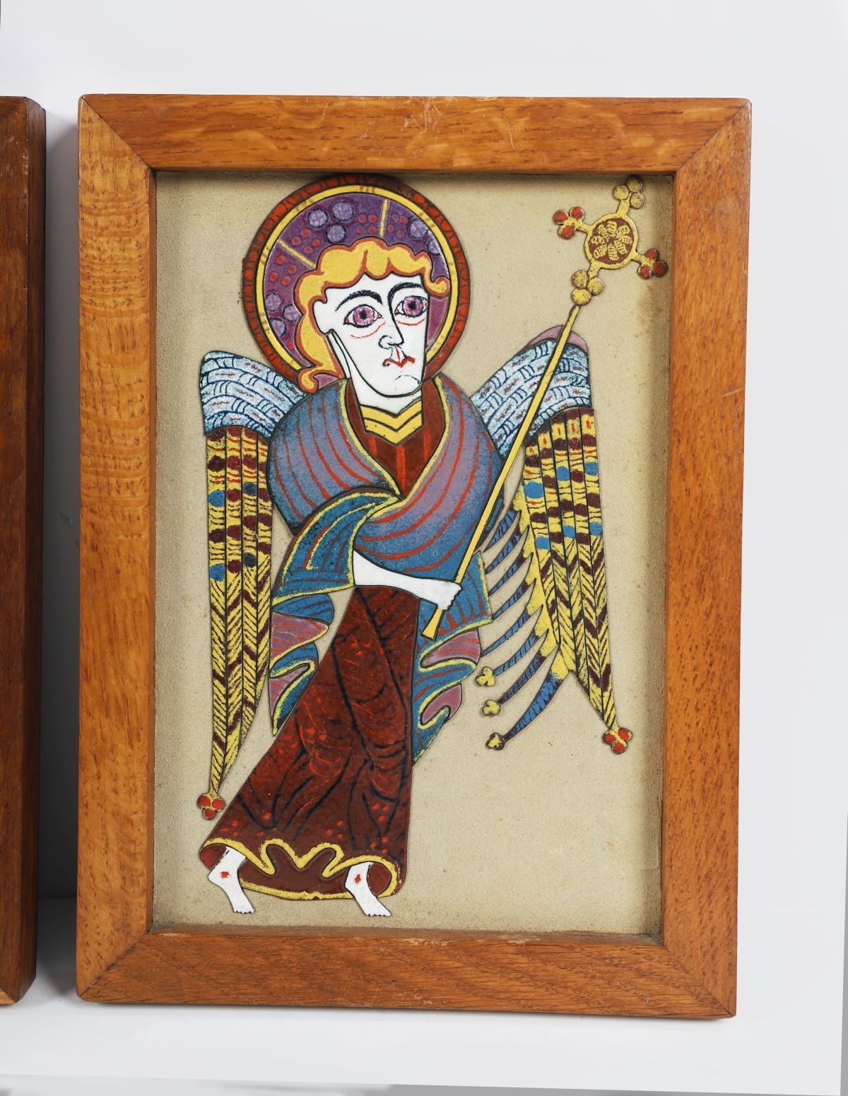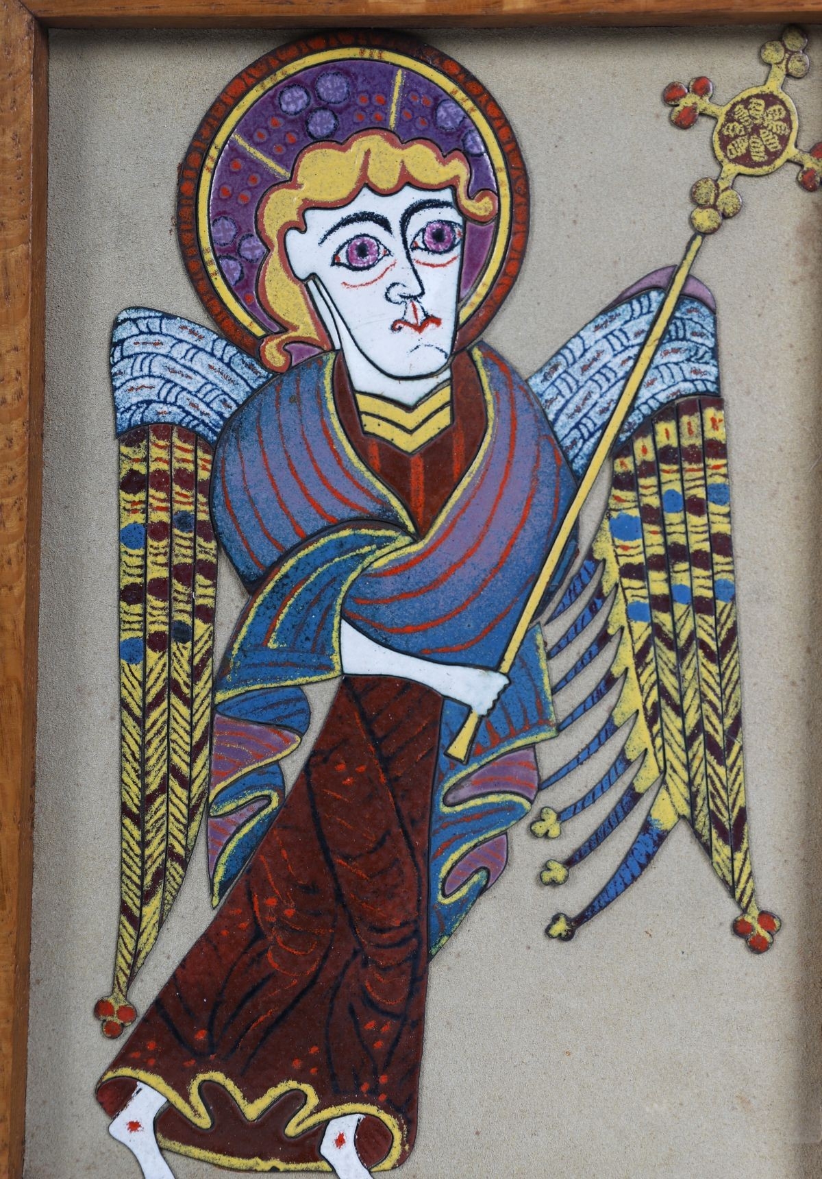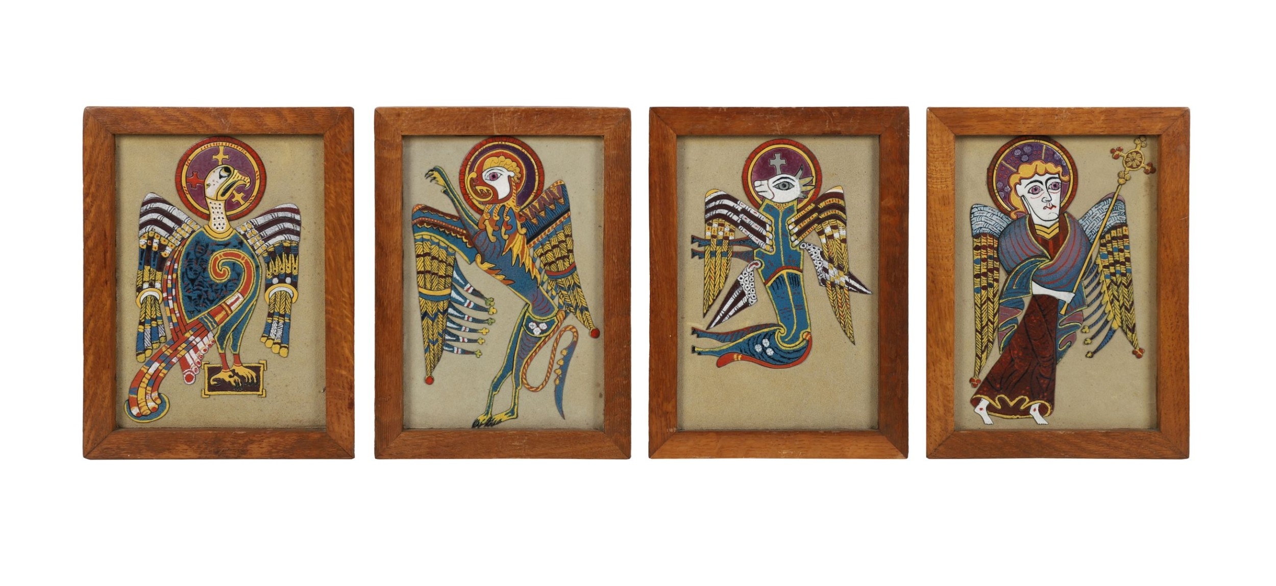 A finely executed set of four enamel panels on copper depicting the symbols of the Four Evangelists — Matthew (Angel), Mark (Lion), Luke (Ox), and John (Eagle) — after designs from The Book of Kells. Each panel individually fired and enamelled in vivid polychrome, mounted in oak frames. Image size: 25 x 17 cm.; framed: 30 x 32 cm. PICTURES AND PRINTS Thursday 11th December 2025 19:47:20