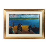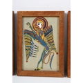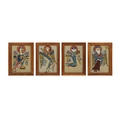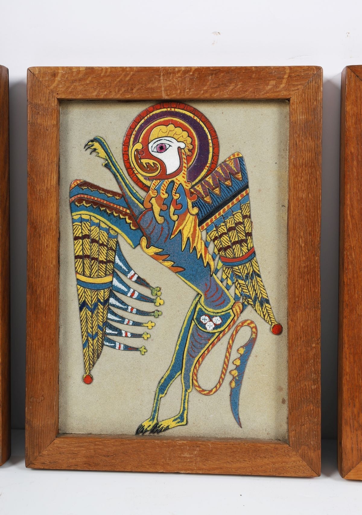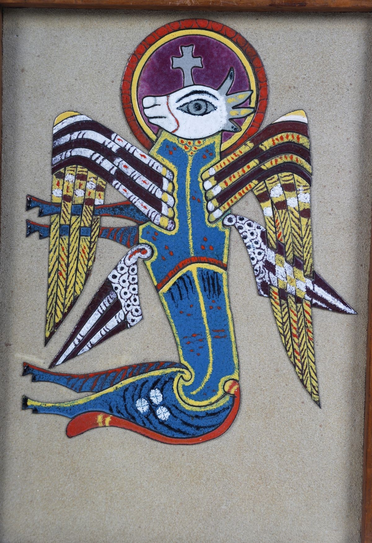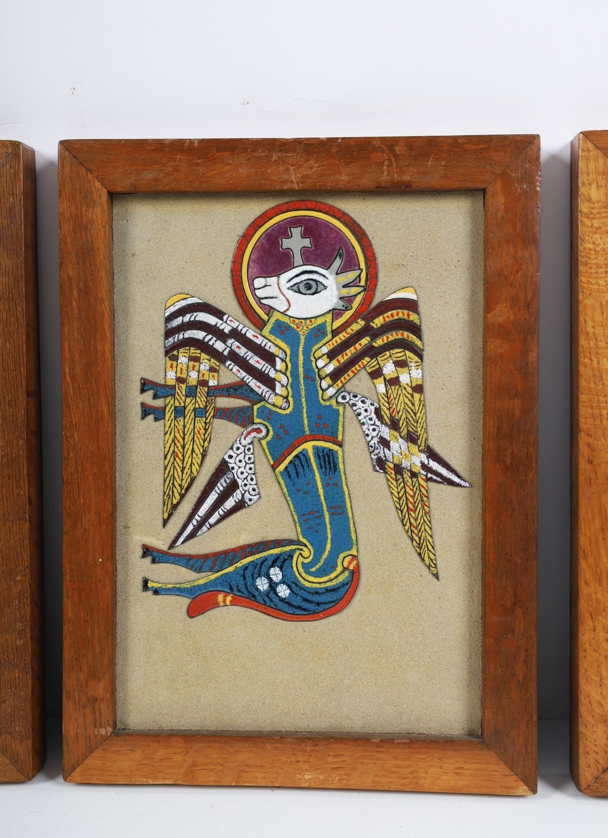 A finely executed set of four enamel panels on copper depicting the symbols of the Four Evangelists — Matthew (Angel), Mark (Lion), Luke (Ox), and John (Eagle) — after designs from The Book of Kells. Each panel individually fired and enamelled in vivid polychrome, mounted in oak frames. Image size: 25 x 17 cm.; framed: 30 x 32 cm. PICTURES AND PRINTS Thursday 11th December 2025 19:47:20