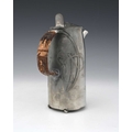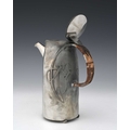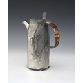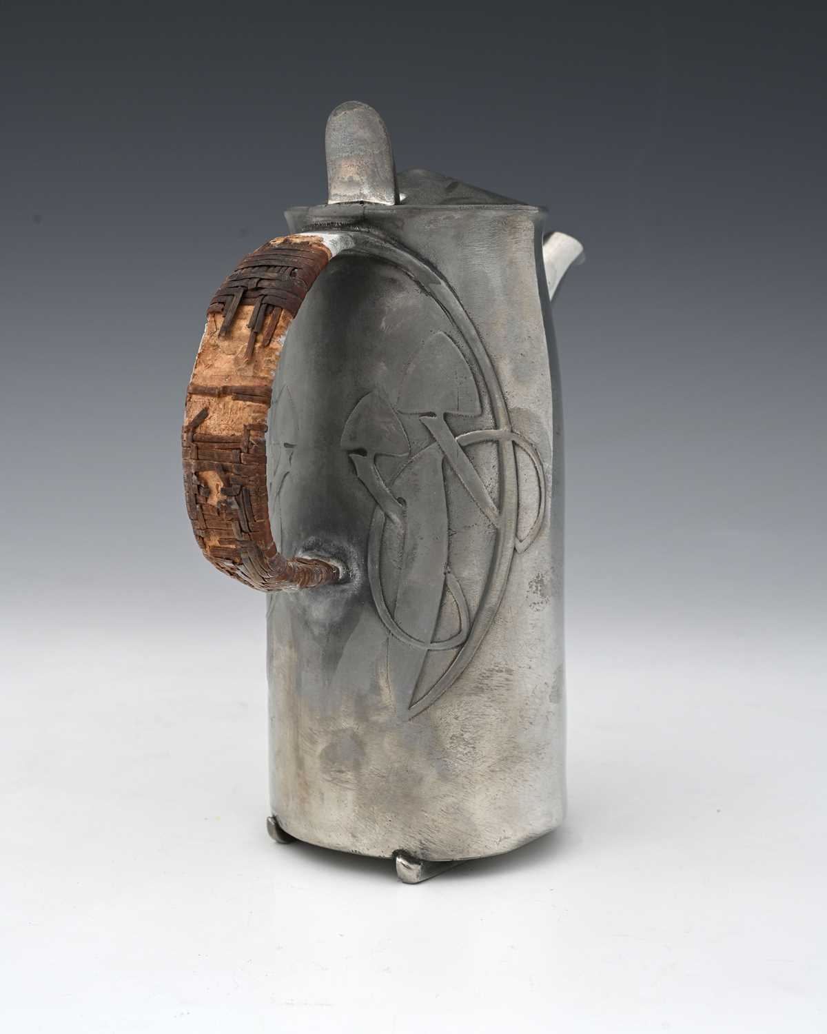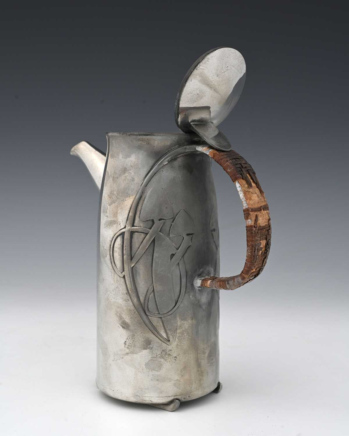 Archibald Knox for Liberty and Co., a Tudric Arts and Crafts pewter coffee pot, model 0231, tapered cylindrical form, cast with knotted tendril motifs and looped rattan handle, on skate feet, conical domed lid, 22cm high
