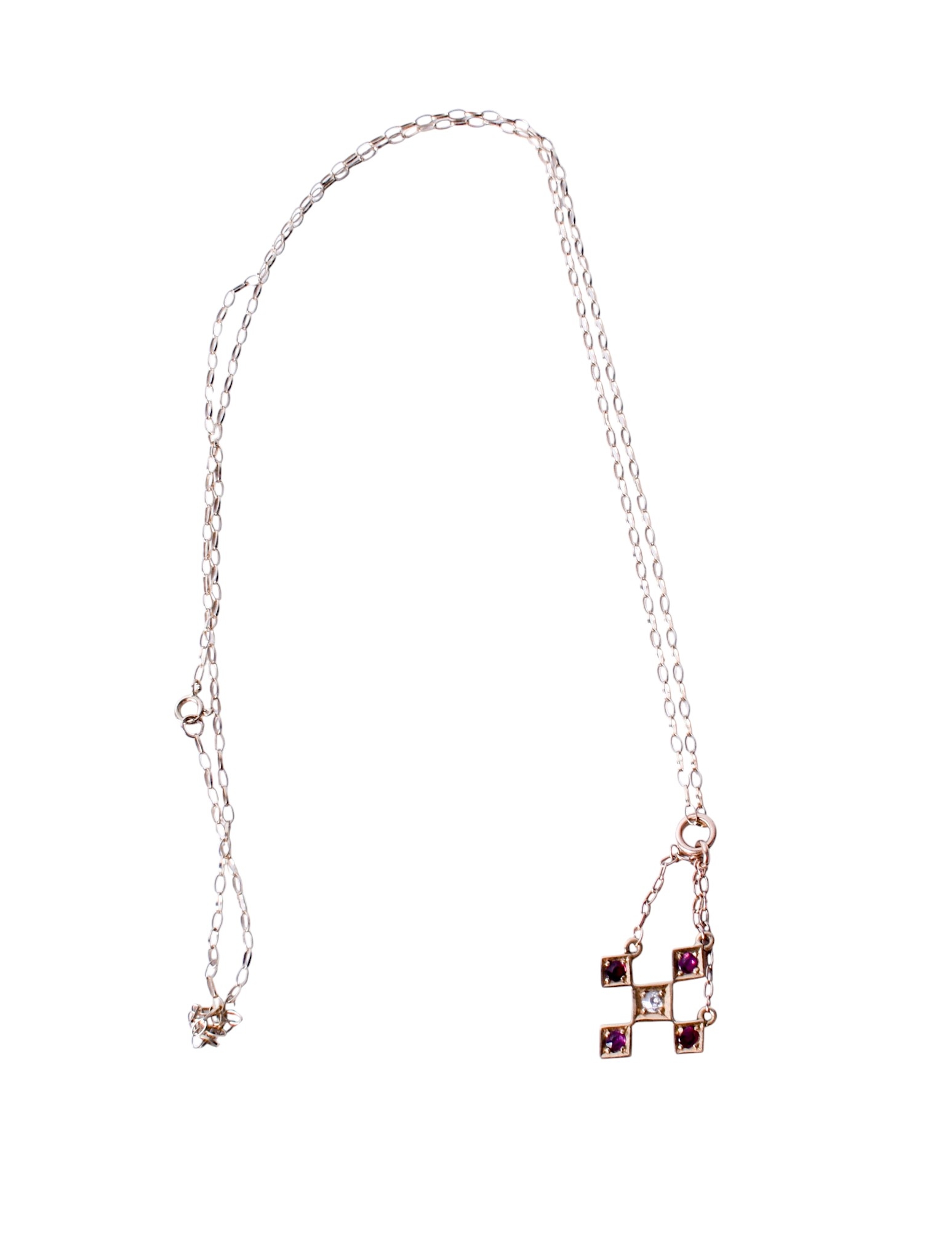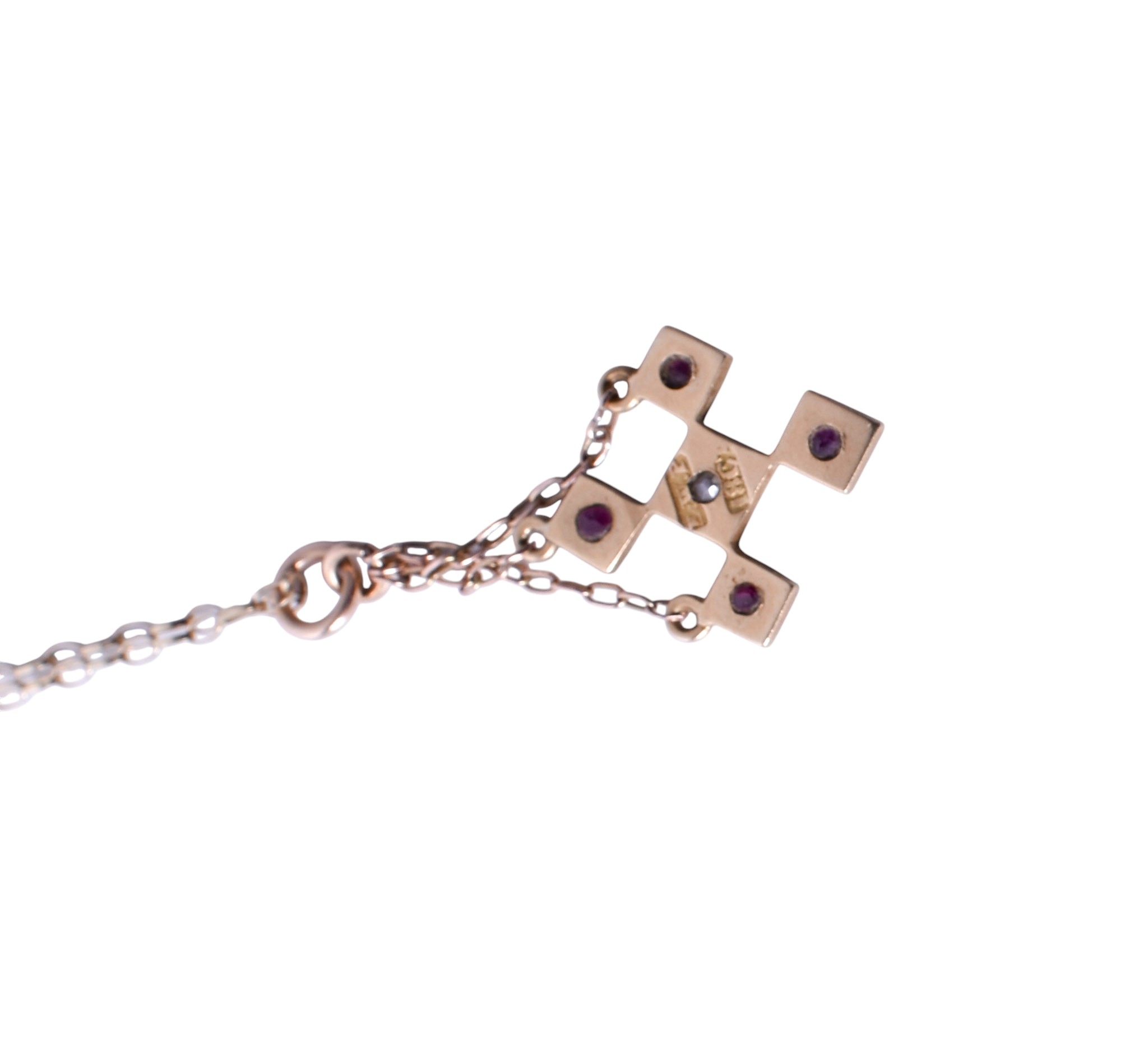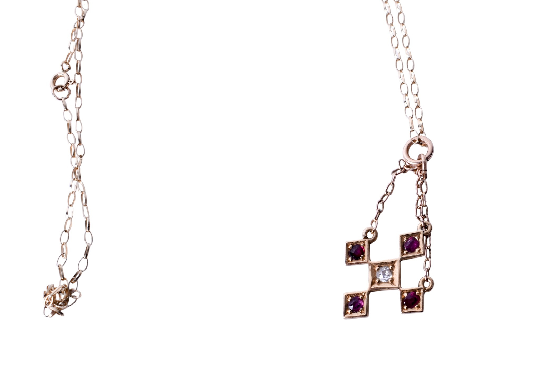 An early 20th century 18ct gold (stamped) pendant. Set centrally with one old cut diamond of 0.05 carats estimated weight with a border of oval faceted rubies of similar size. Suspended from a 9ct gold chain. Gross weight 2.1g.