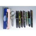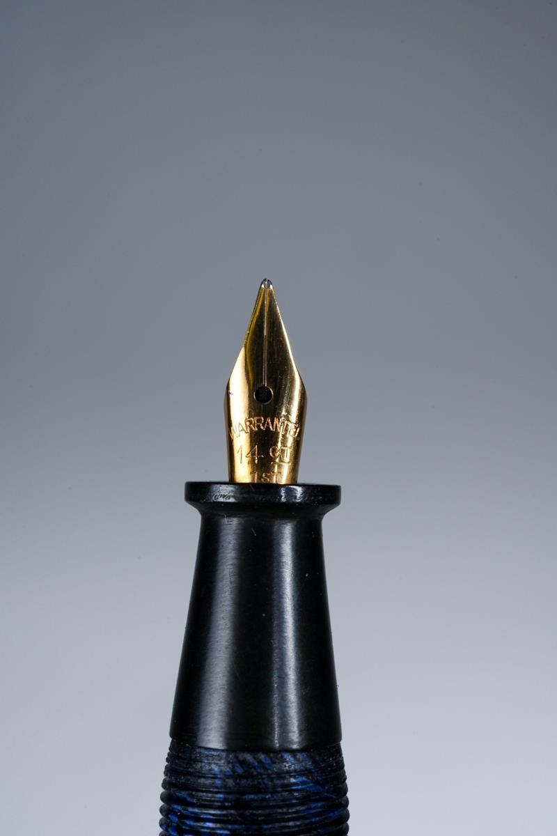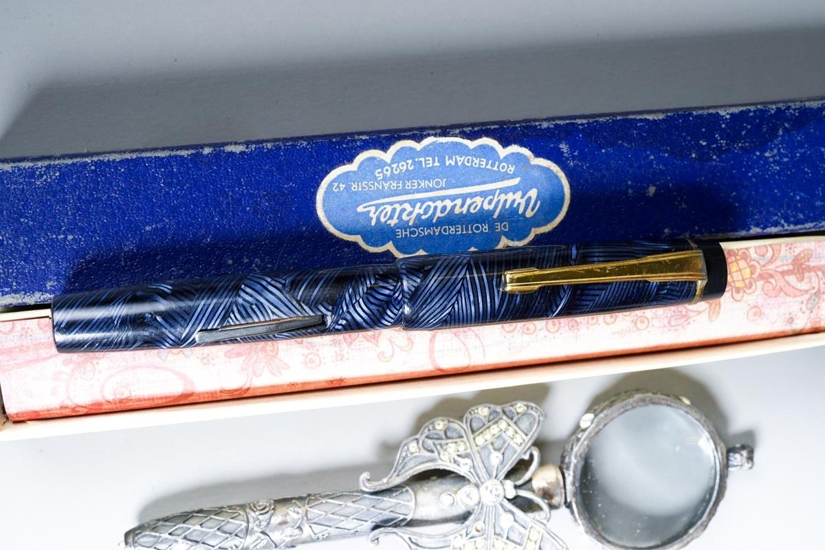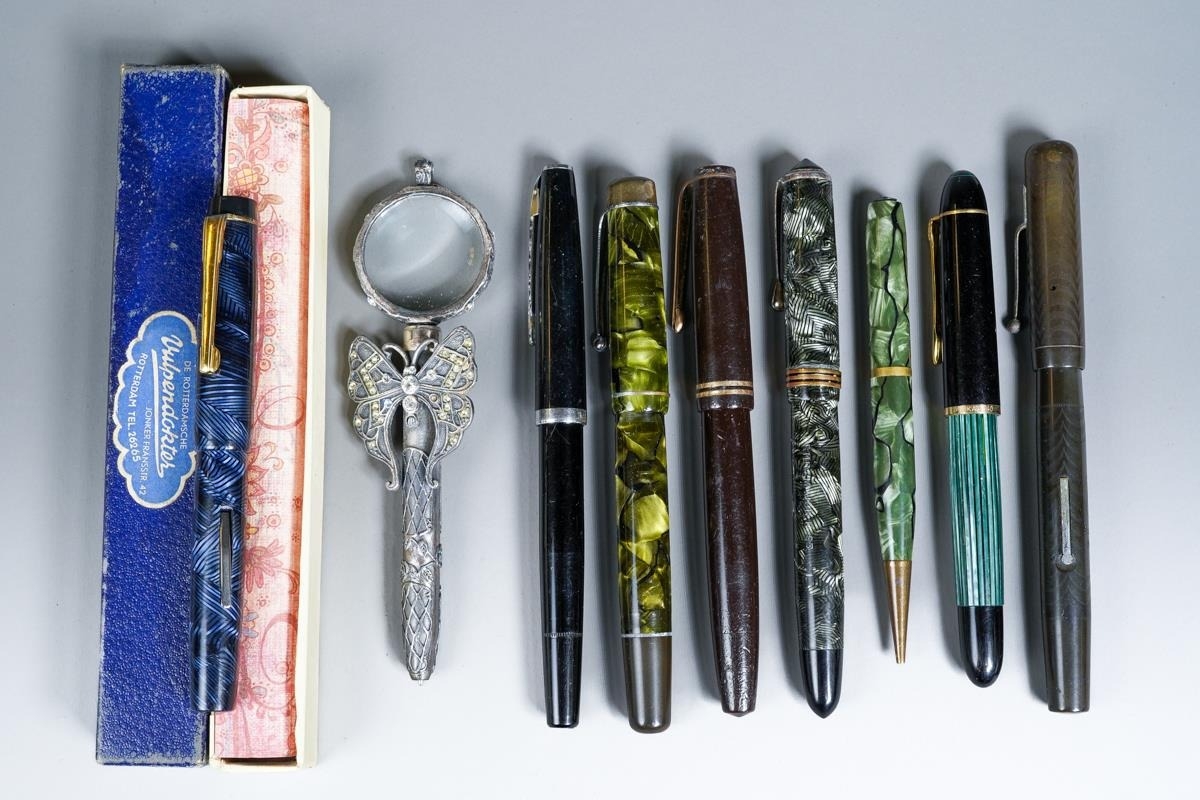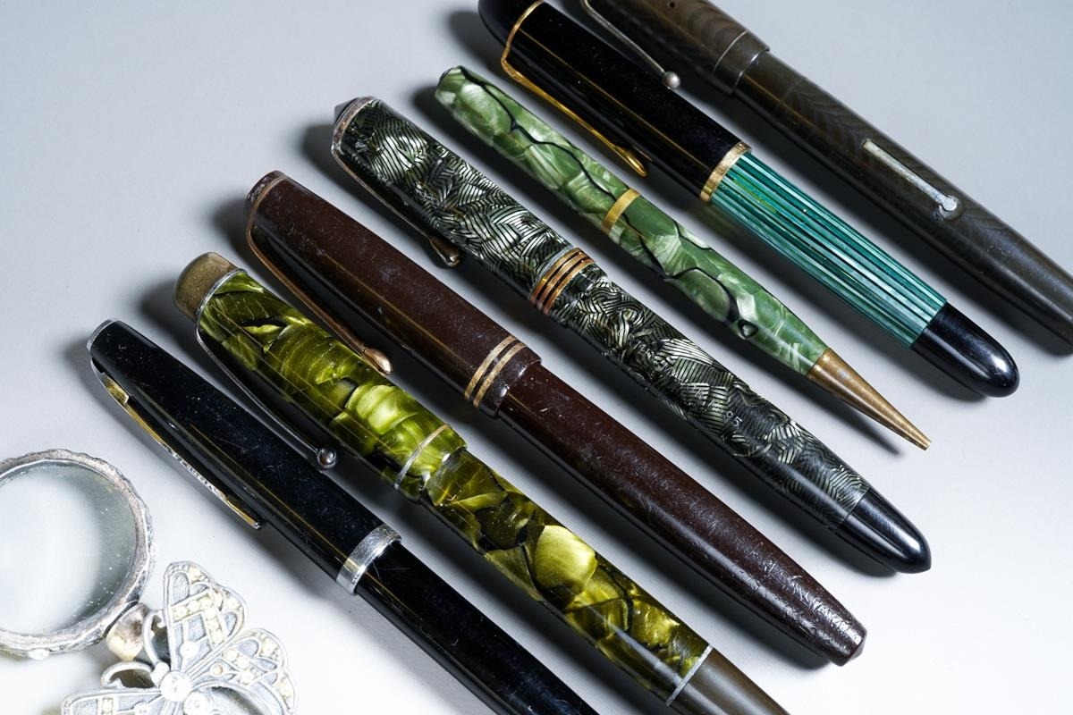 Assorted vintage loose fountain pens to include: Pelikan green and black striated, the nib stamped 14C-585; an English Orium Major no 95 foutain pen, black and white with gilt banding, the nib stamped 14CT; a Stephen's tortoiseshell fountain pen, the nib stamped 14CT and numbered 76; a Parker black and gilt, the nib stamped 14K PEN N; a lever fill blue and black Orium style fountain pen, the nib stamped 14ct and three further various pens [1 bag]