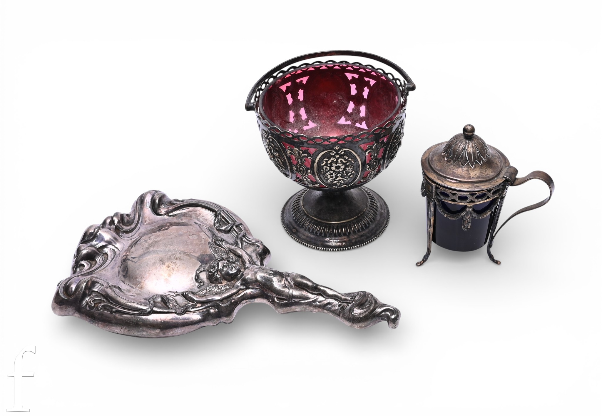 A late 19th Century French style silver plated mustard the frame with vesica band and foliate swags on three reeded tapered supports, fitted blue glass liner, height, a ruby glass lined plated sweetmeat basket, and a hand mirror, with heavily embossed figural handle and whiplash scrolling border. (3)
