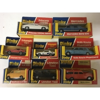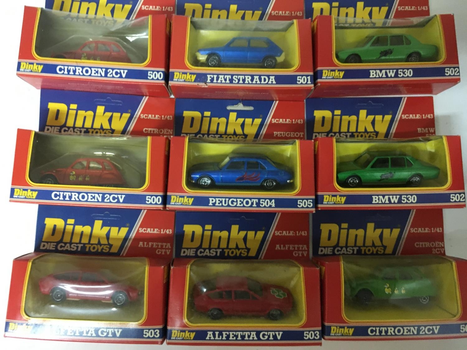 Dinky toys, #500 Citroen 2CV x3, #501 Fiat Strada, #502 BMW 530 x2 , #503 Alfetta GTV x2 and #505 Peugeot 504, boxed