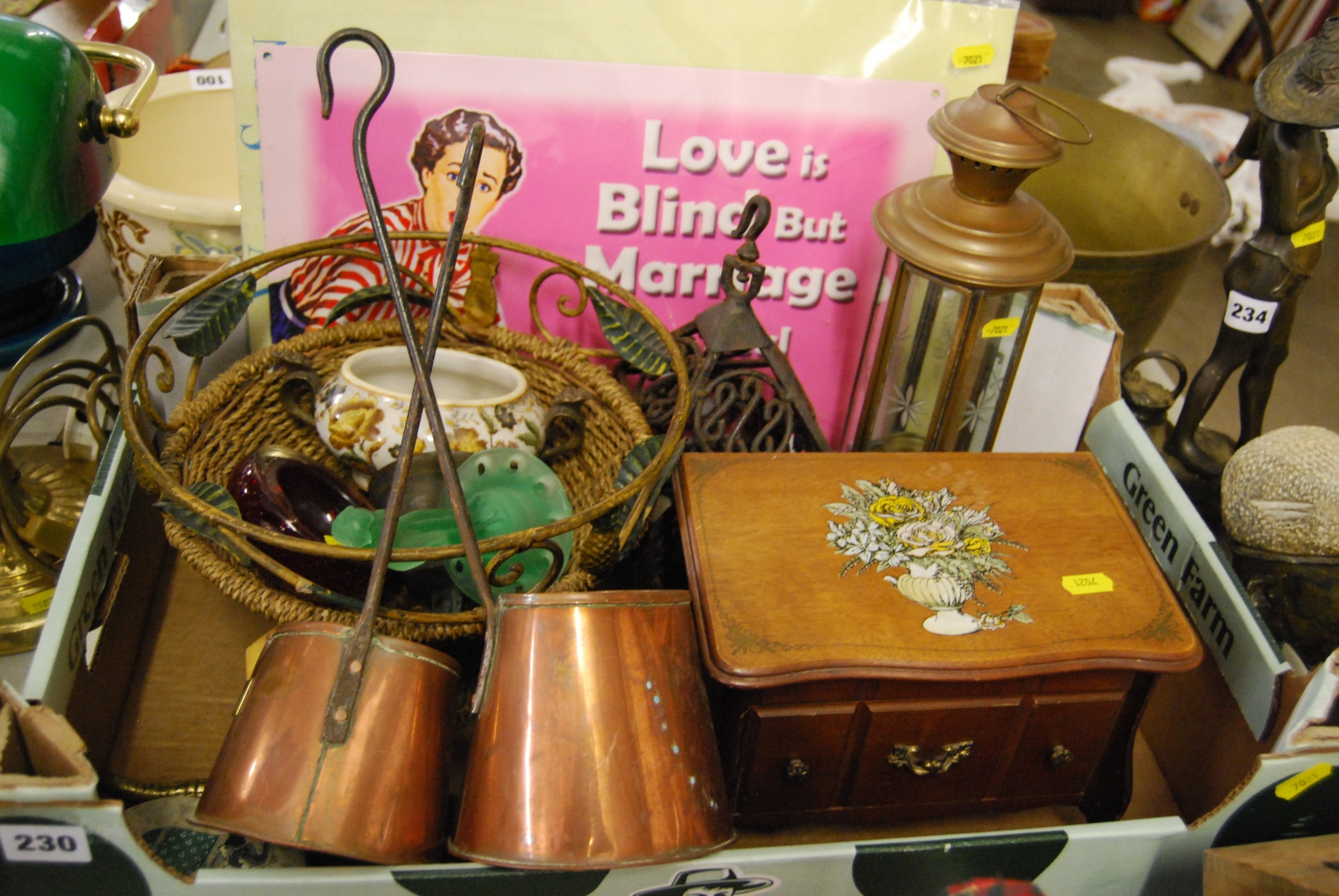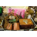 QUANTITY OF MISCELLANEOUS ITEMS INCLUDING 2 COPPER CIDER MEASURES, JEWELLERY BOX, LANTERNS, FRUIT BOWL, ETC