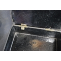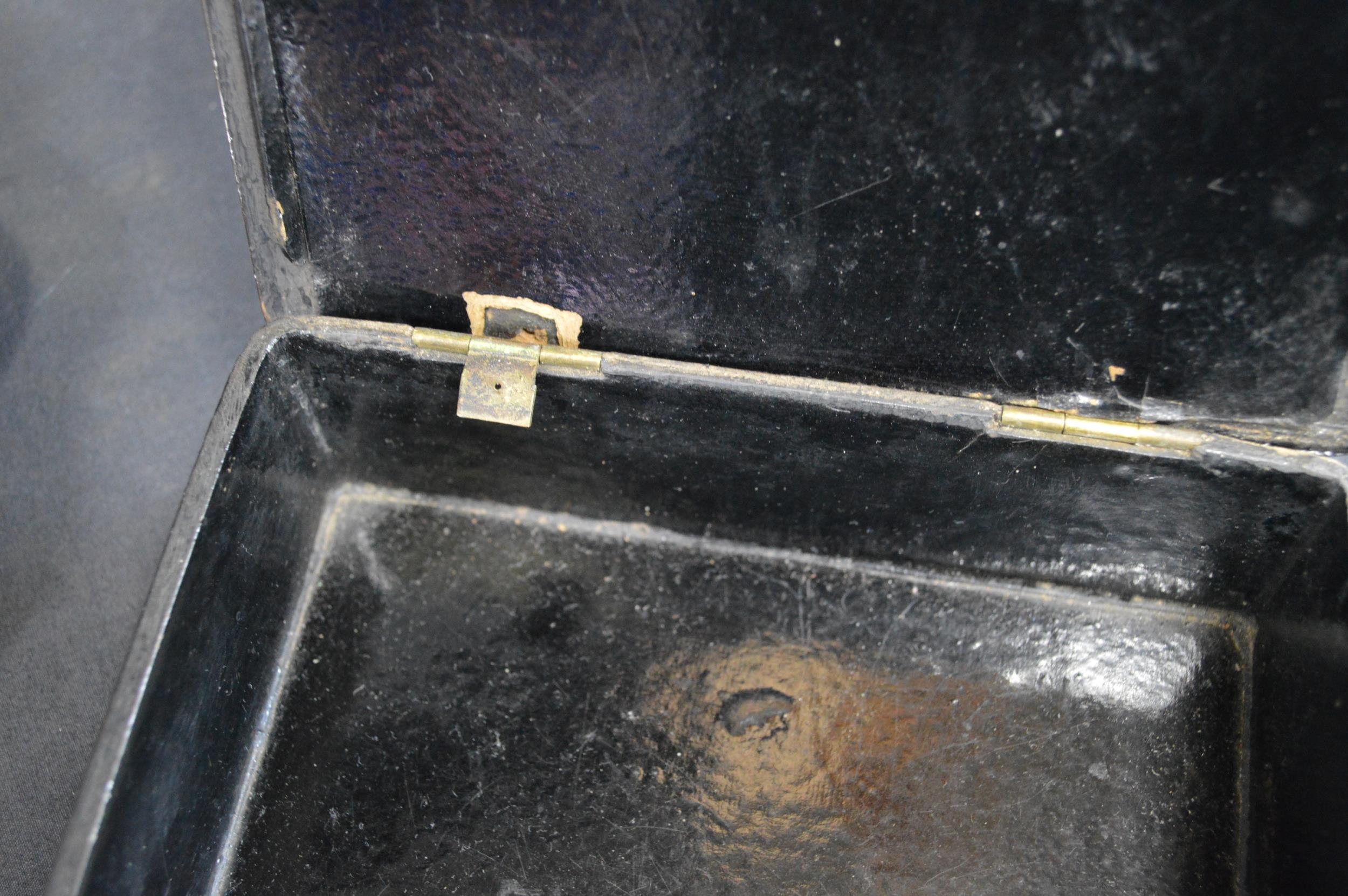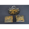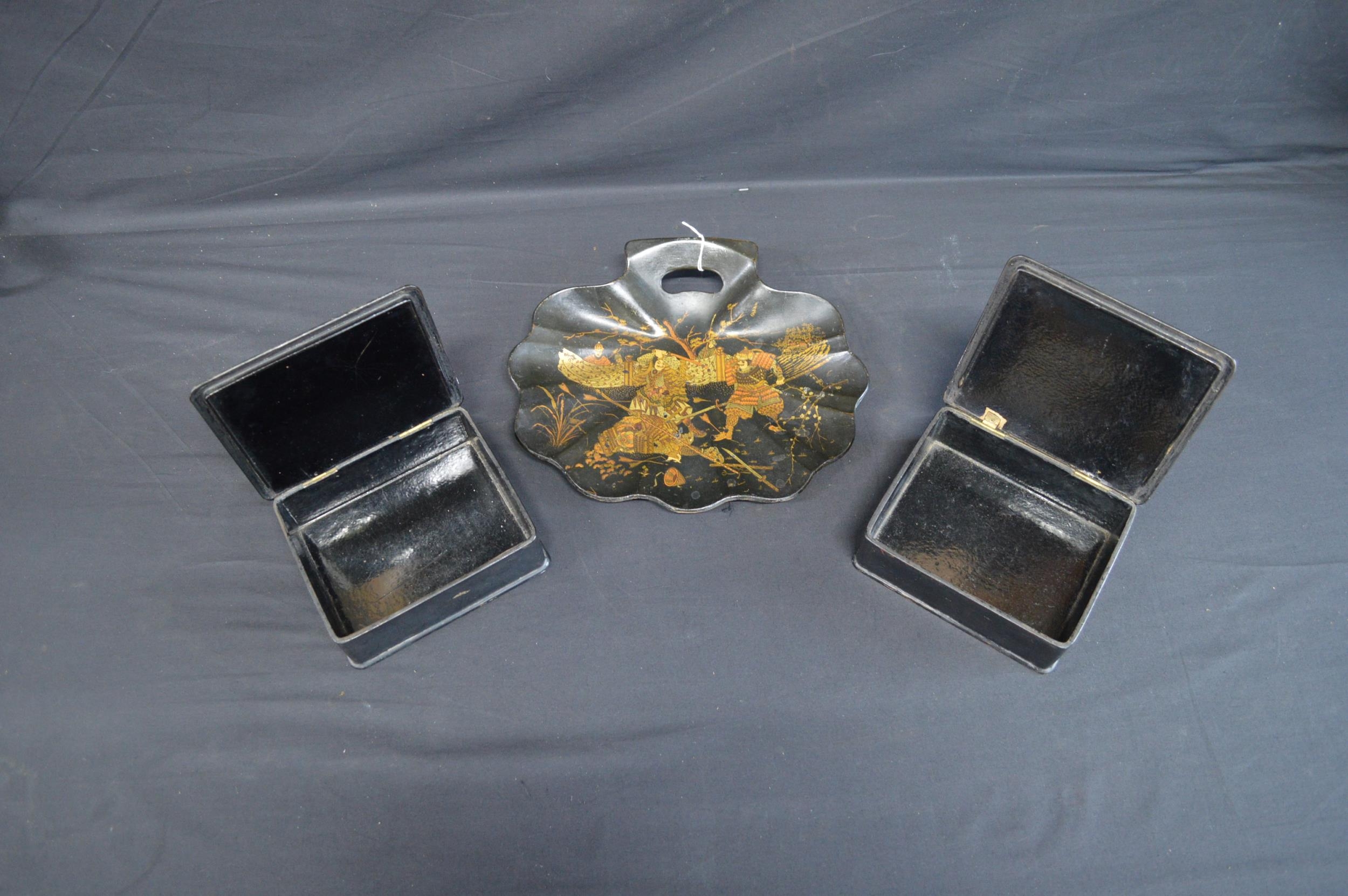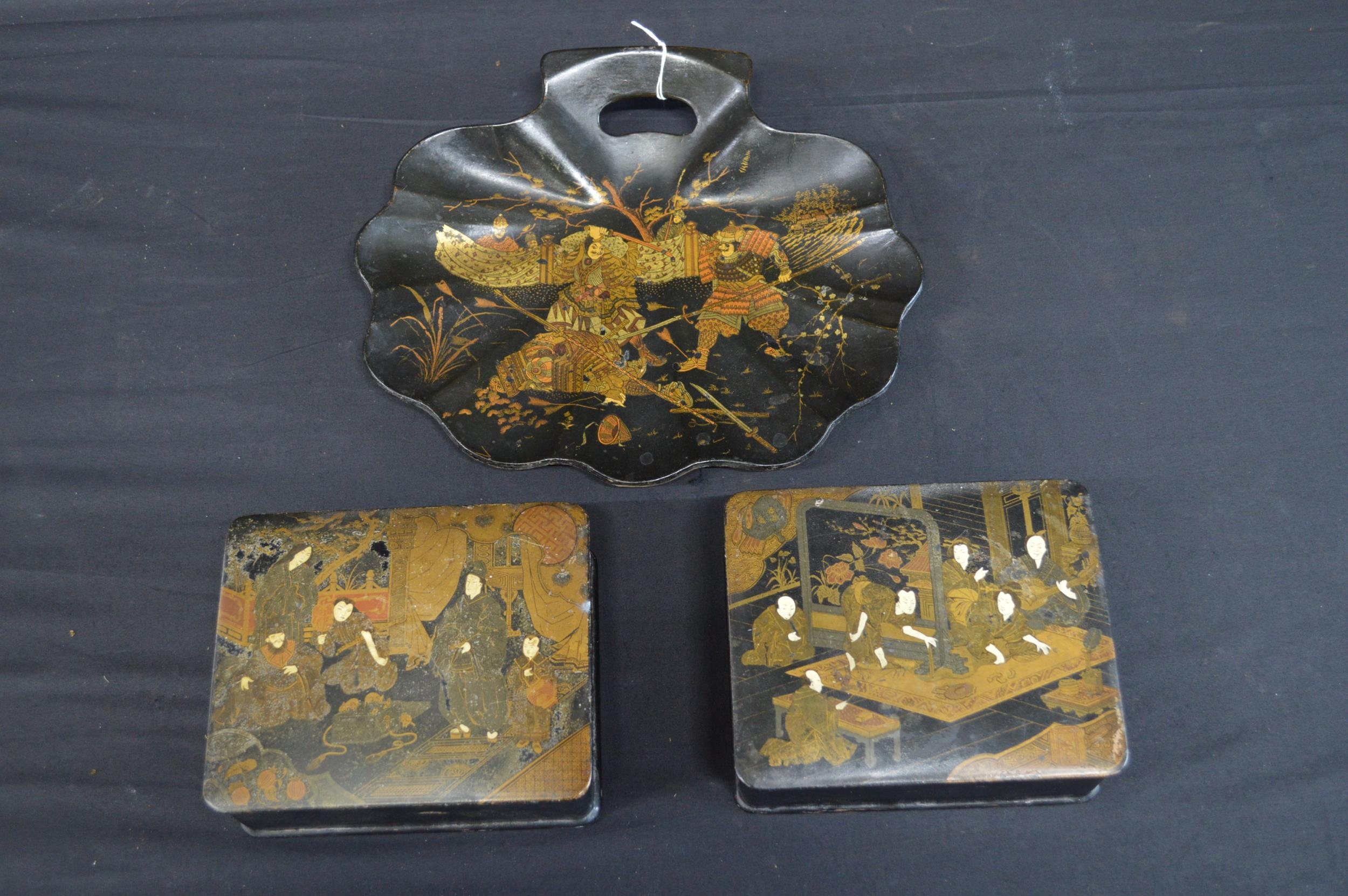 Pair of lacquered papier mache boxes with hinged lids decorated with scenes of figures - 18cm wide together with a scallop shape dish decorated with scene of warriors - 31.5cm wide