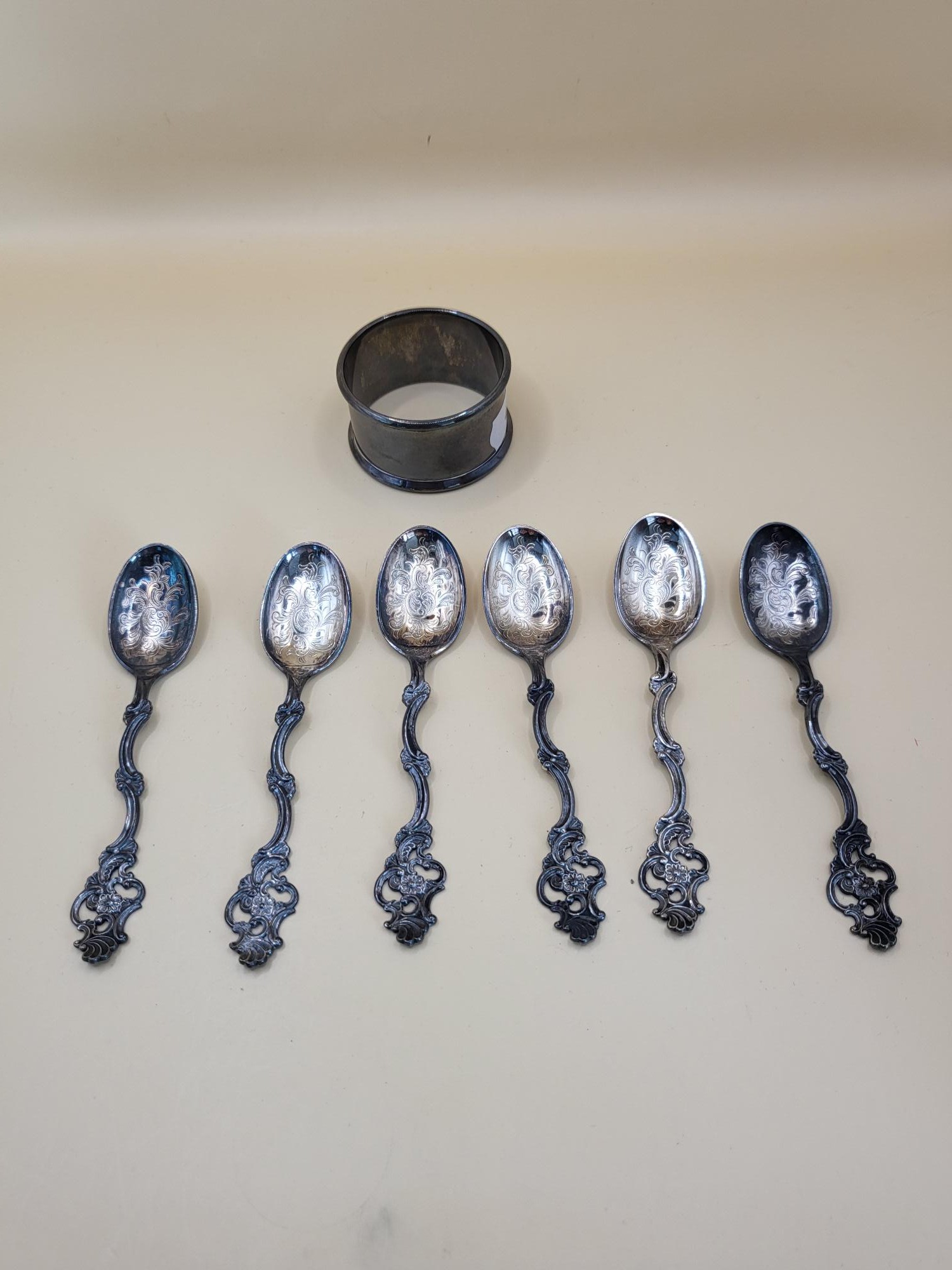 Six Sterling Silver Teaspoons along with a Sterling Napkin Ring Weighs 74g