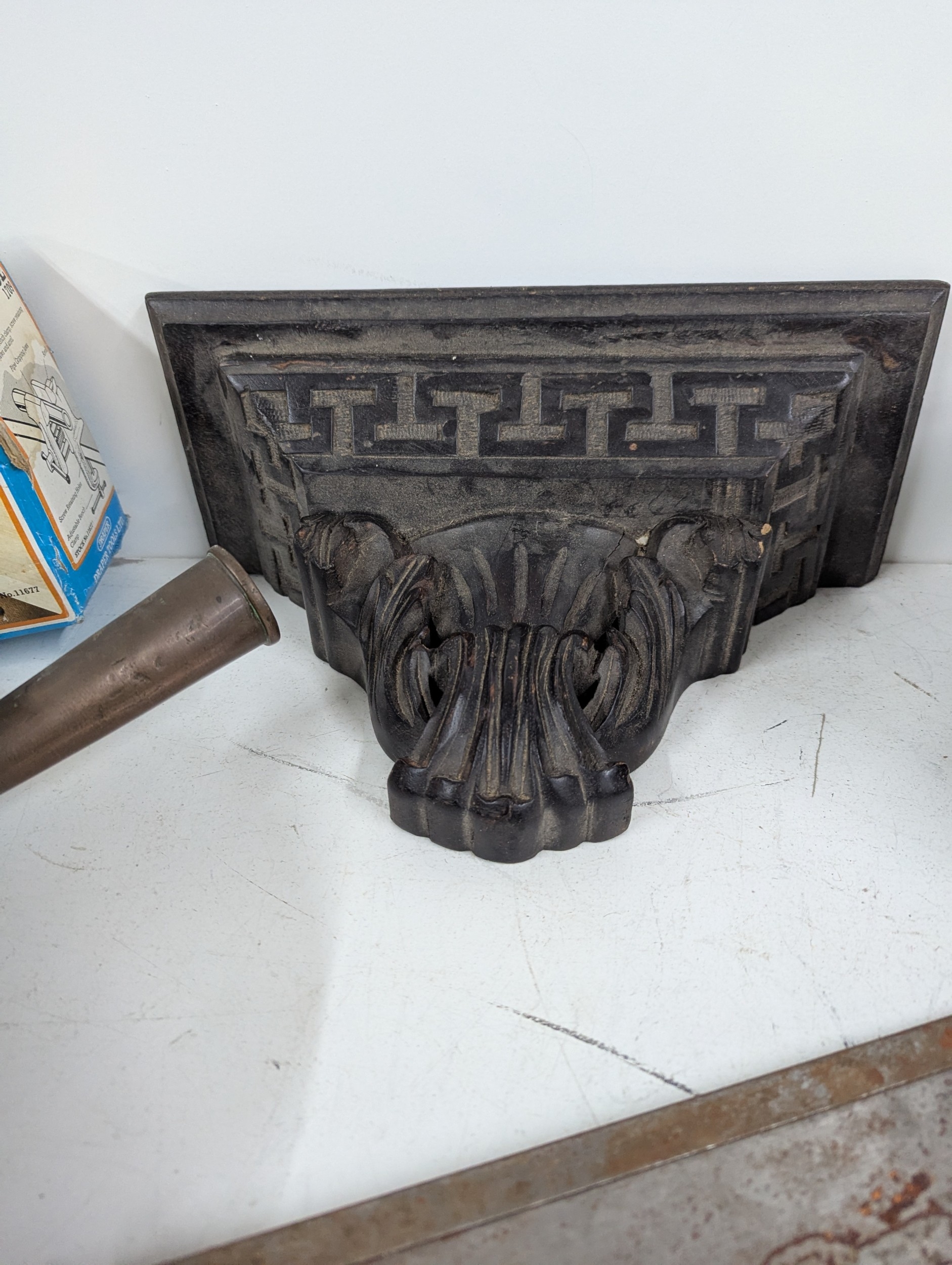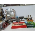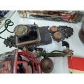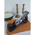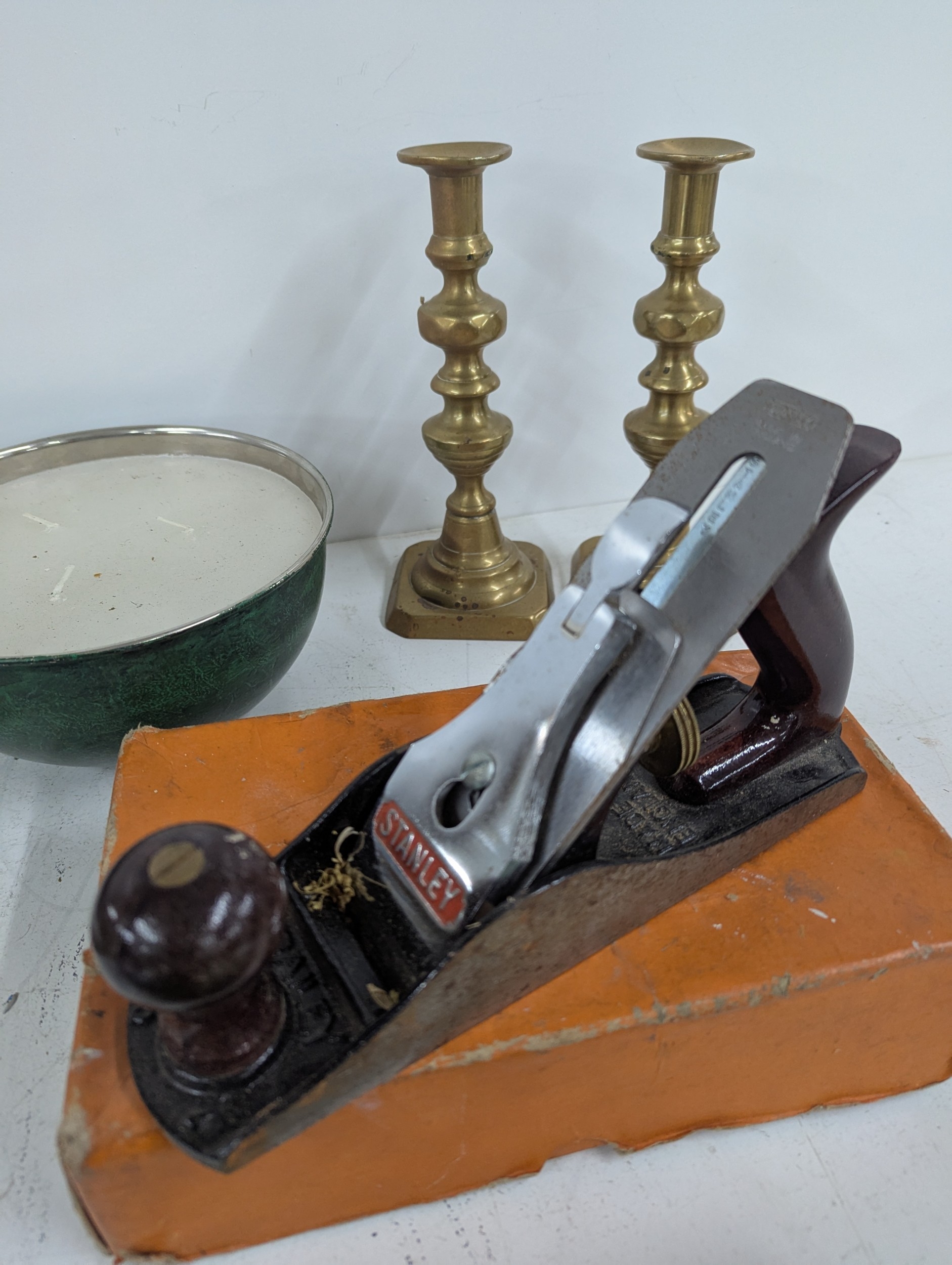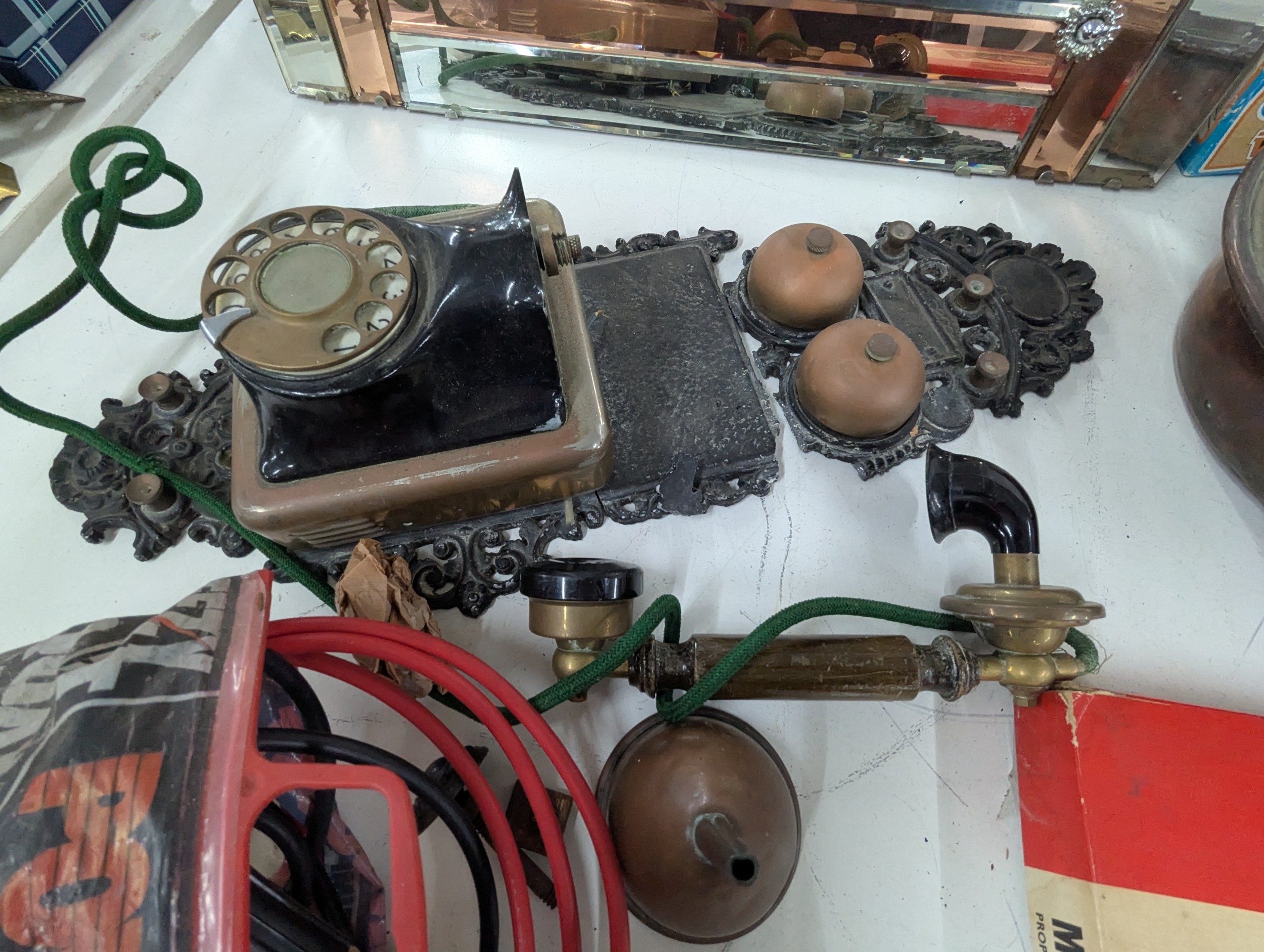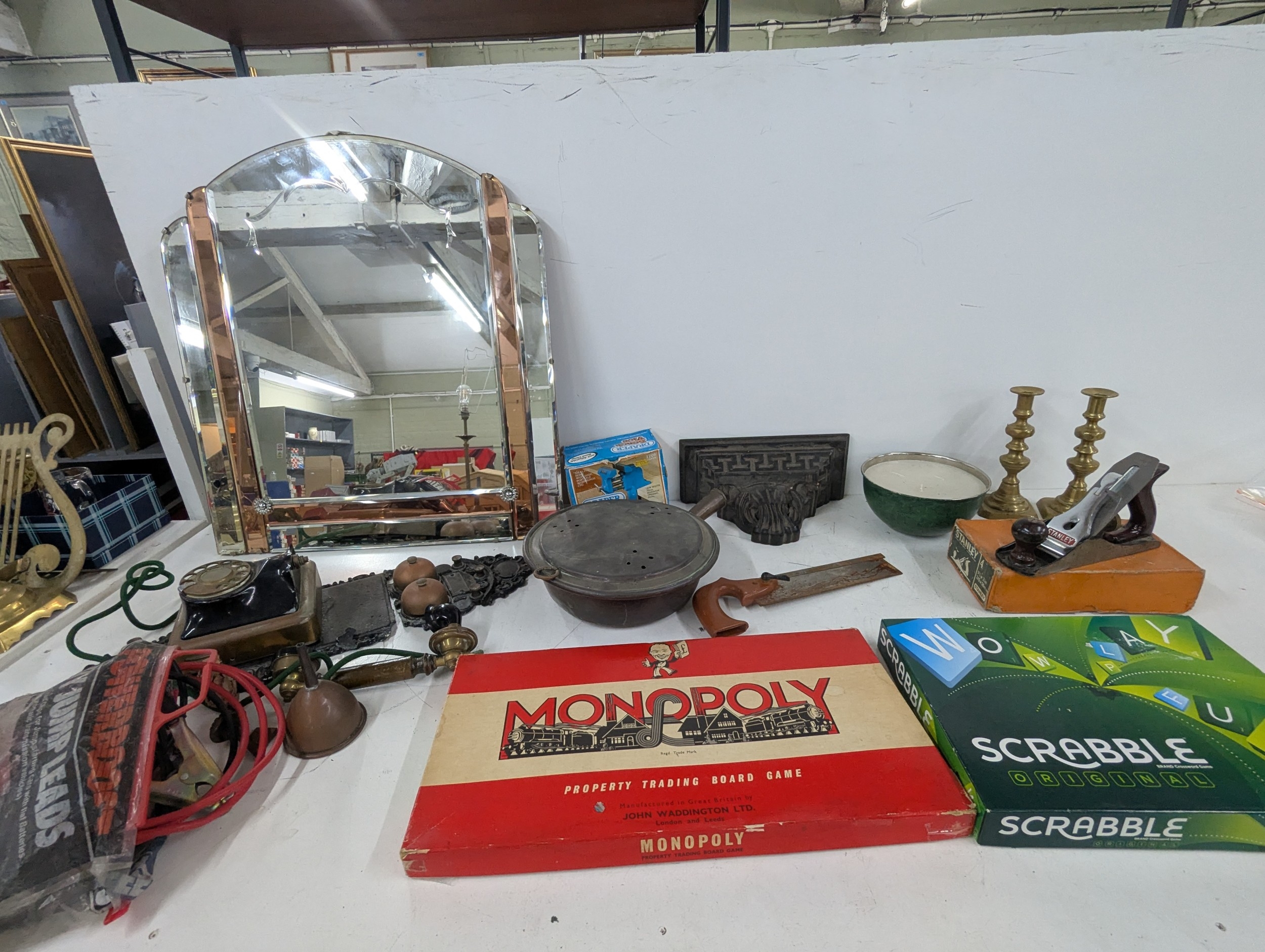 A mixed lot to include a vintage cast iron and brass wall telephone, a Stanley plainer, a pair of jump leads, two board games and other items