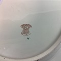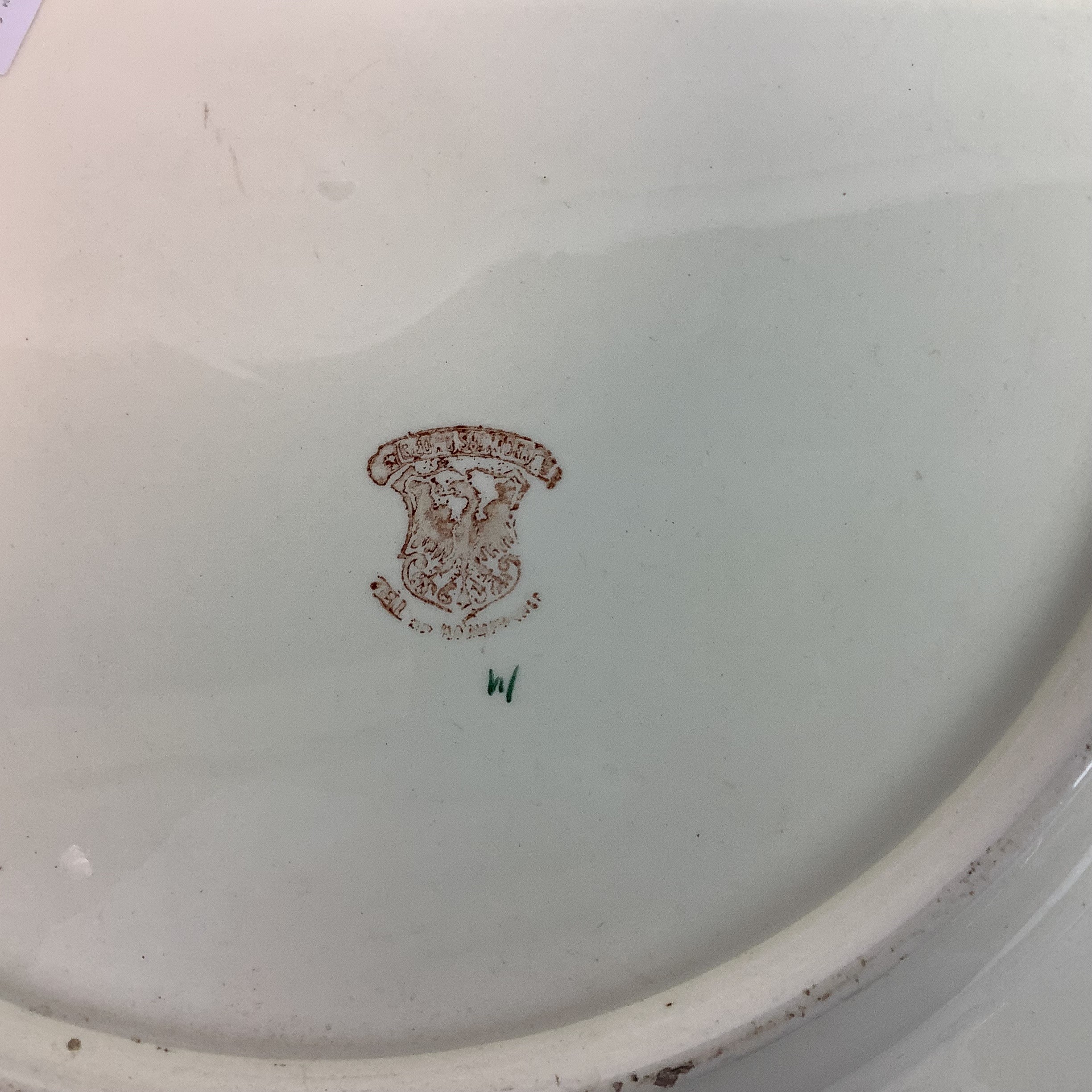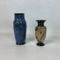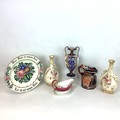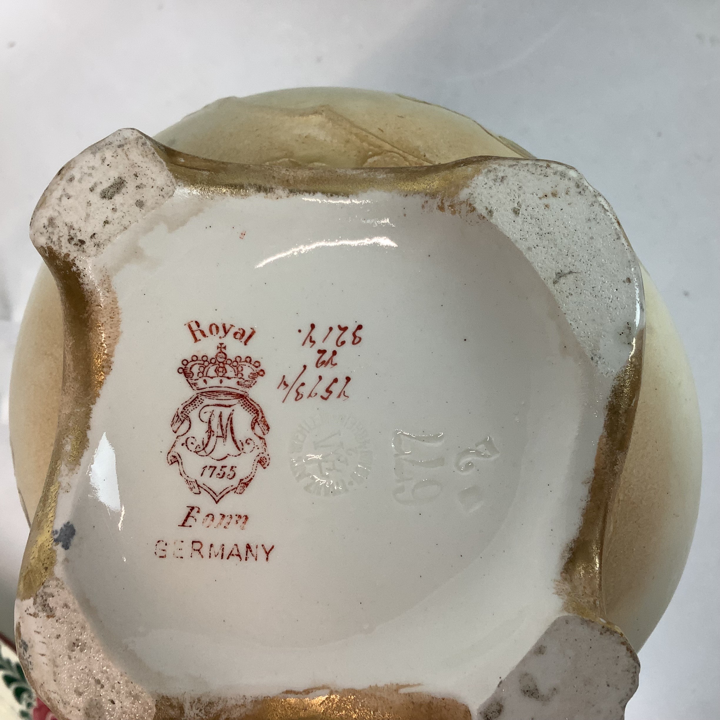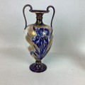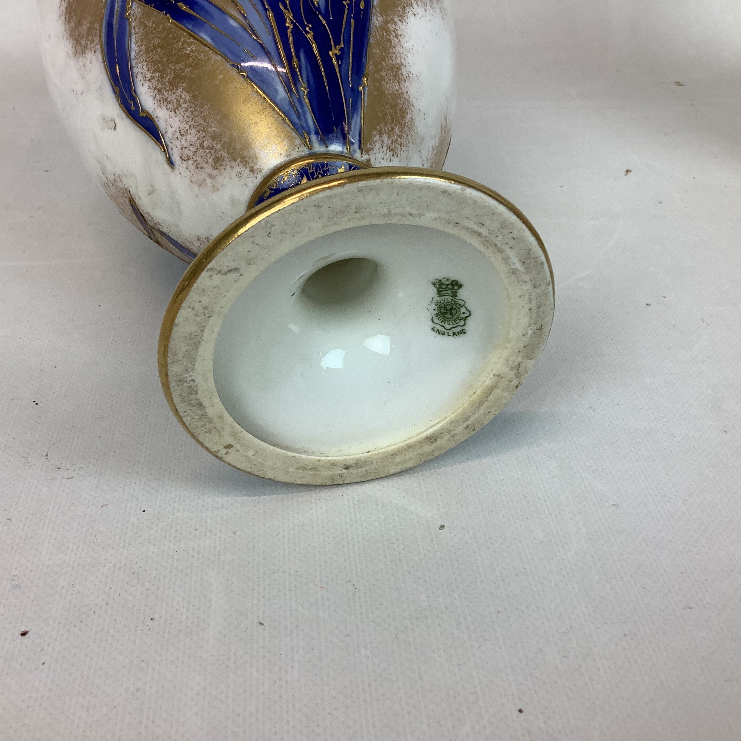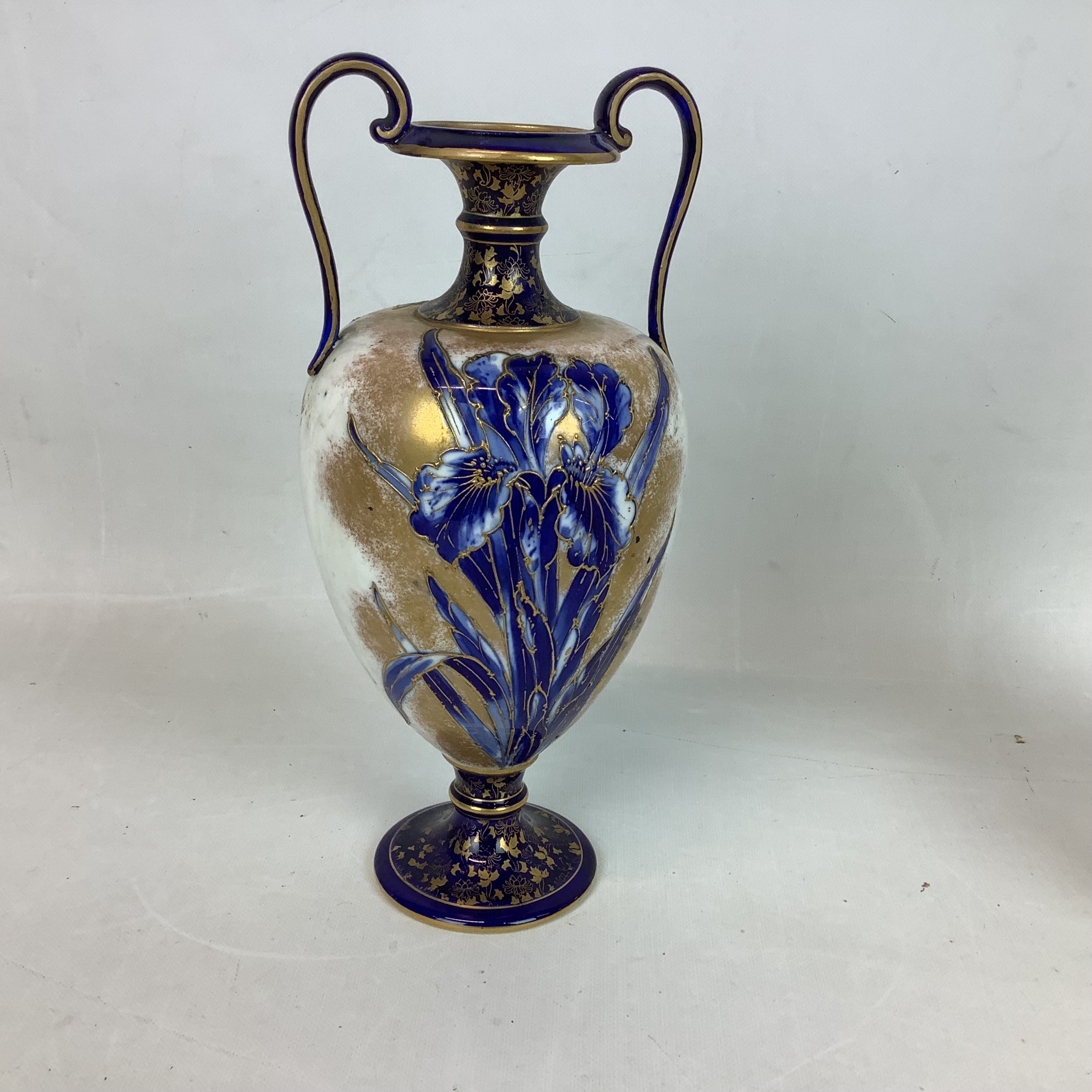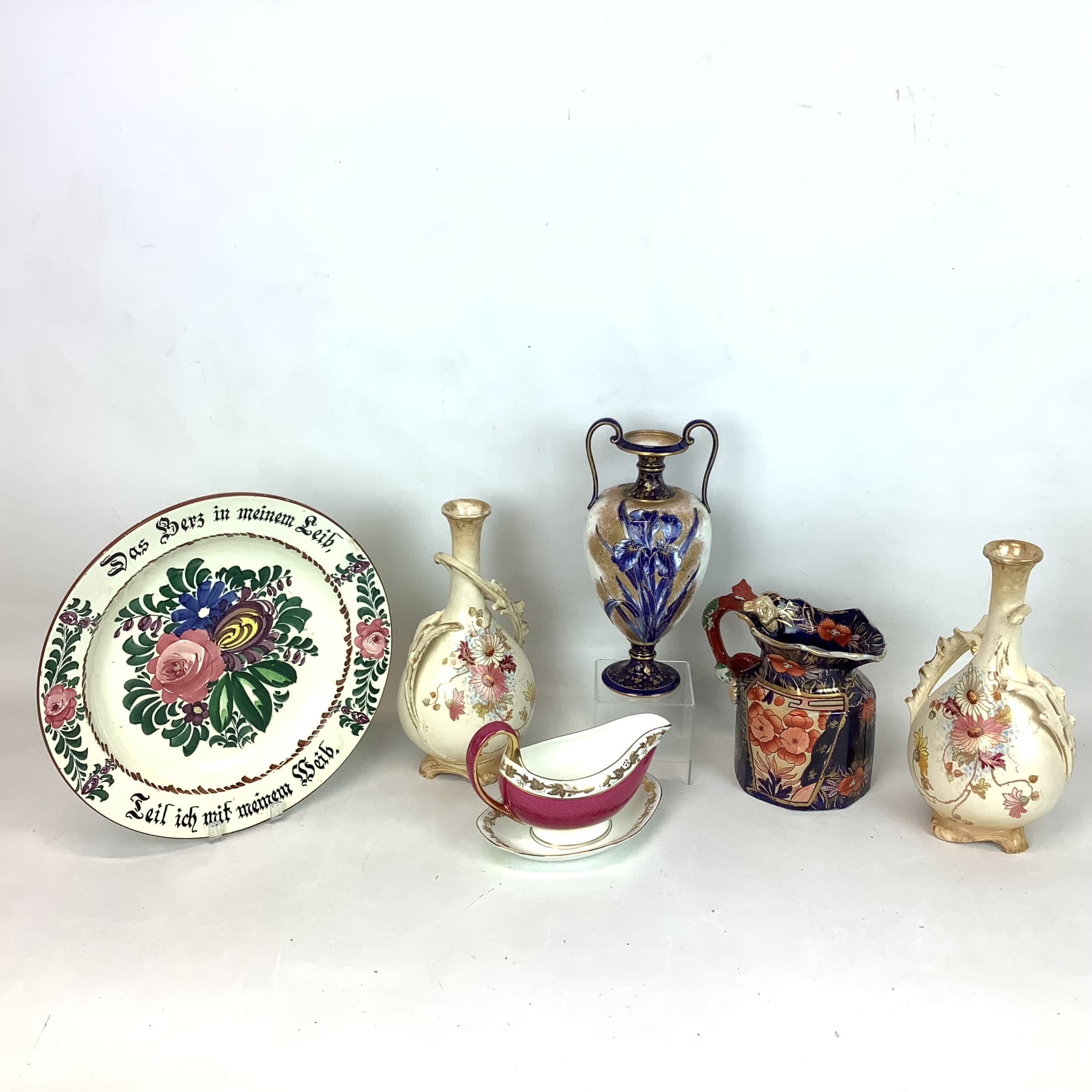 Pair of German bulbous vases decorated with flowers and acanthus handles, H30cm; a twin handled Doulton vase decorated with irises on a cobalt and gilt decorated foot, H29cm. Together with an Imari pattern dragon handled jug, a Wedgwood sauce boat, and a German charger.