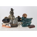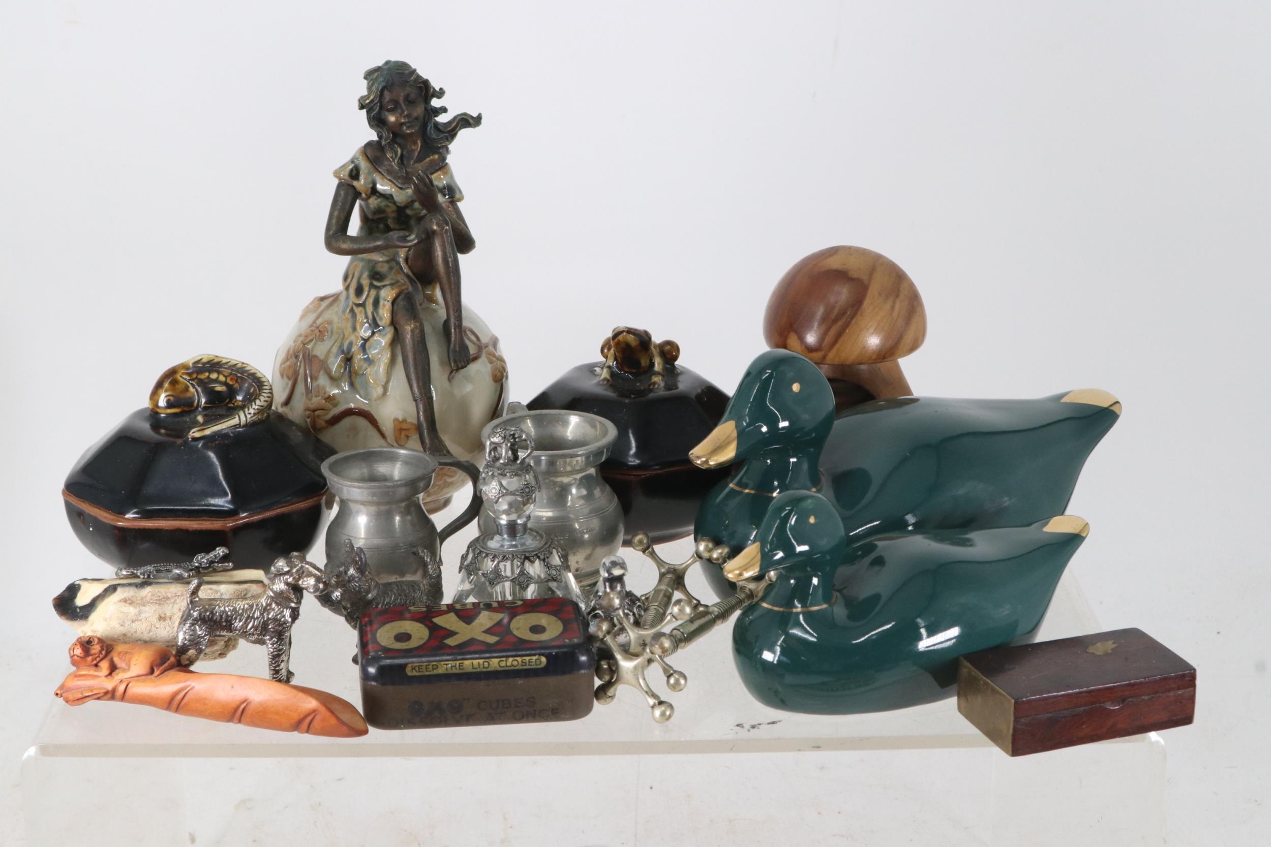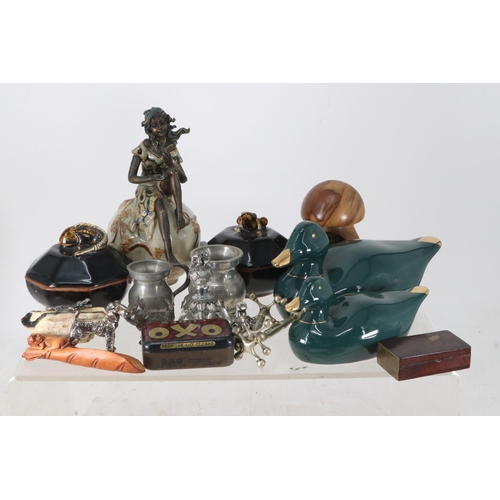 Decorative scent bottle, small metal dog figures, ceramic ducks, Wooden netsuke etc