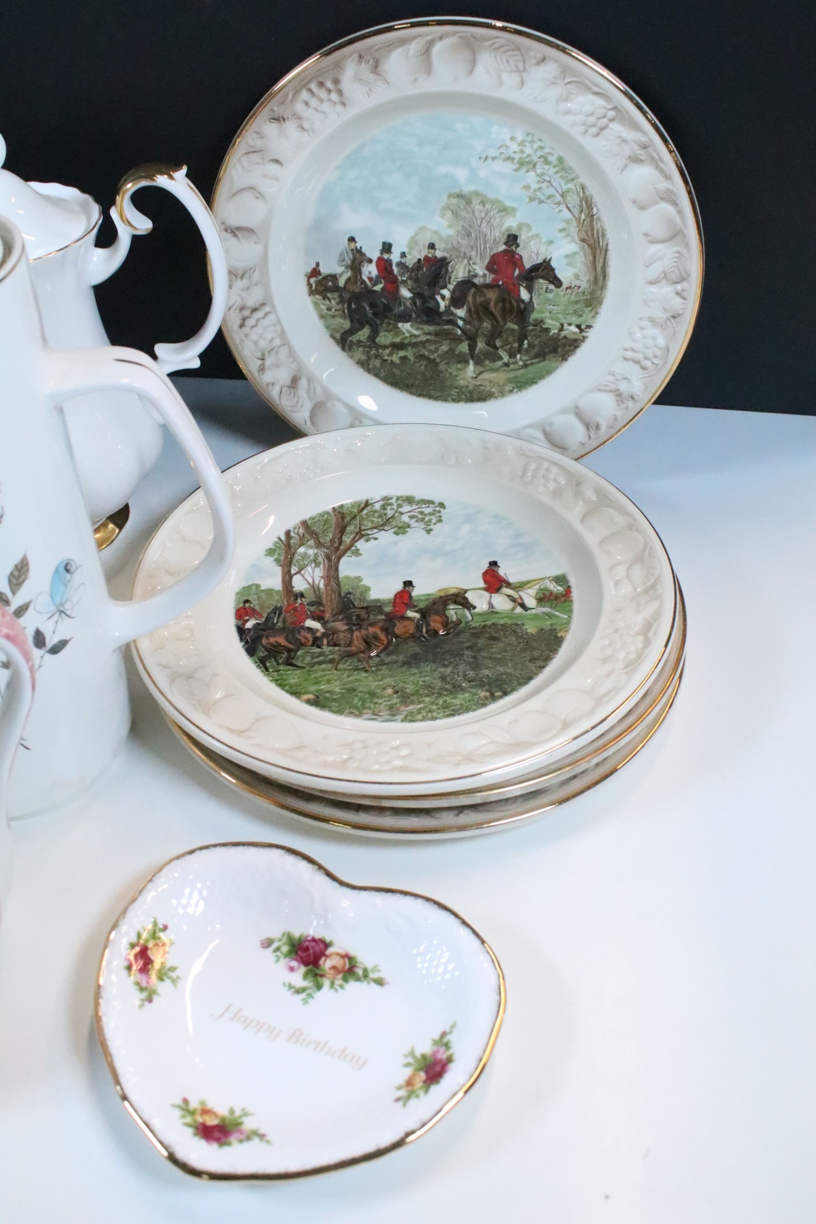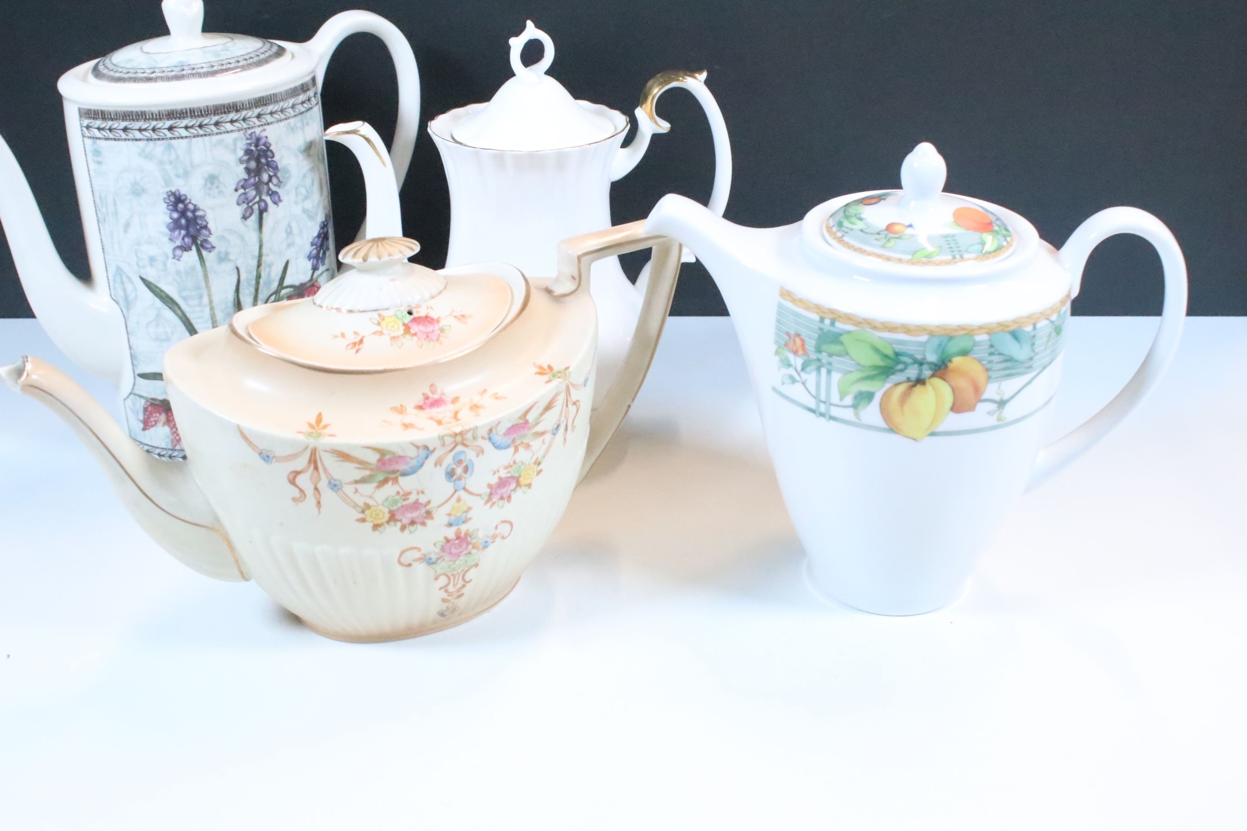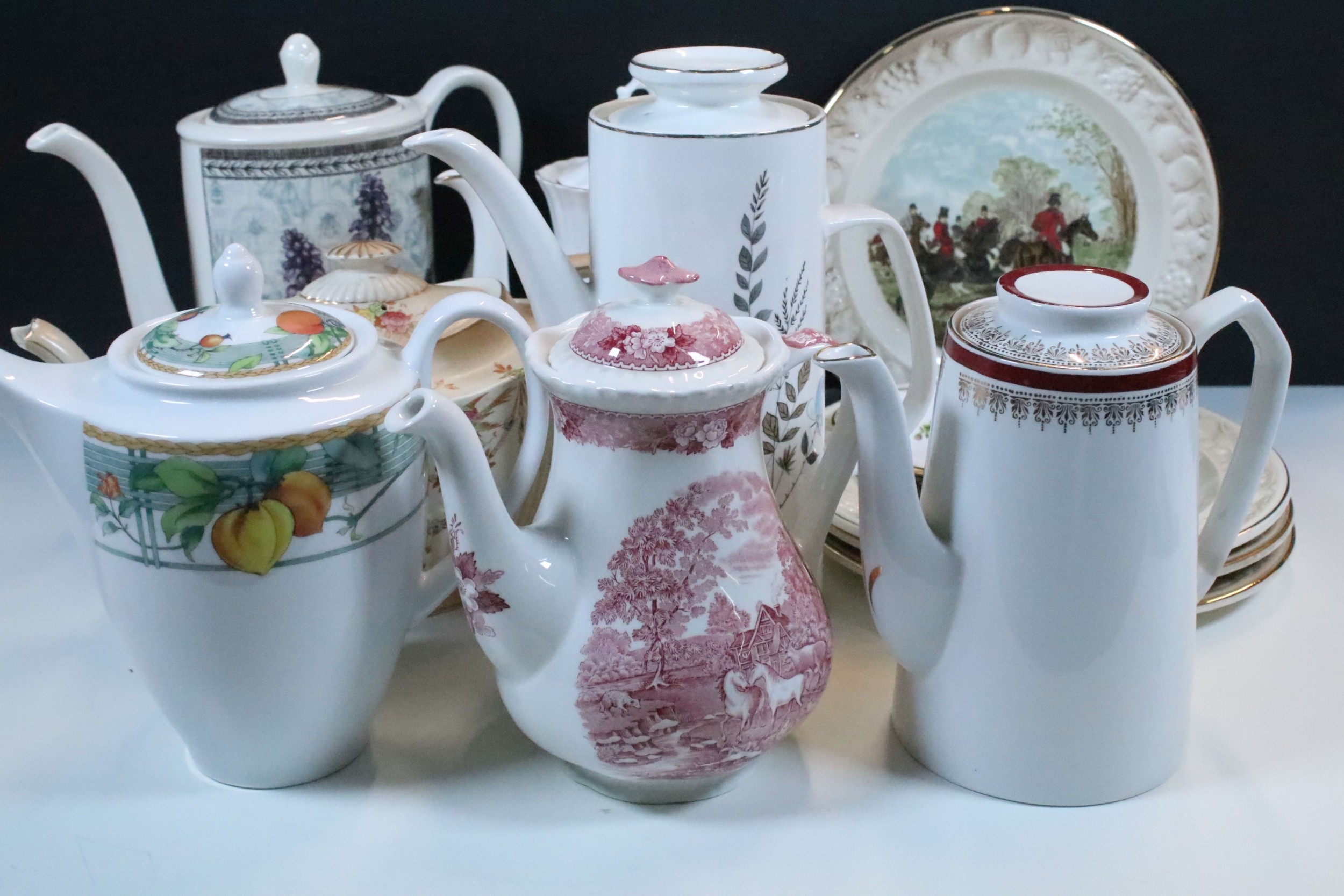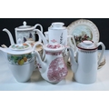 Quantity of tea and coffee pots to include Royal Albert, Crown Devon, Wedgwood and Adams examples together with a set of four Palissy 'Herring Hunting scene' Plates (1 box)