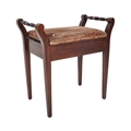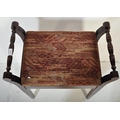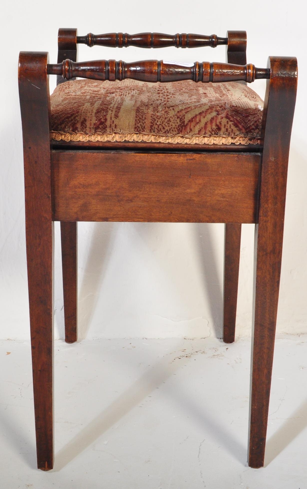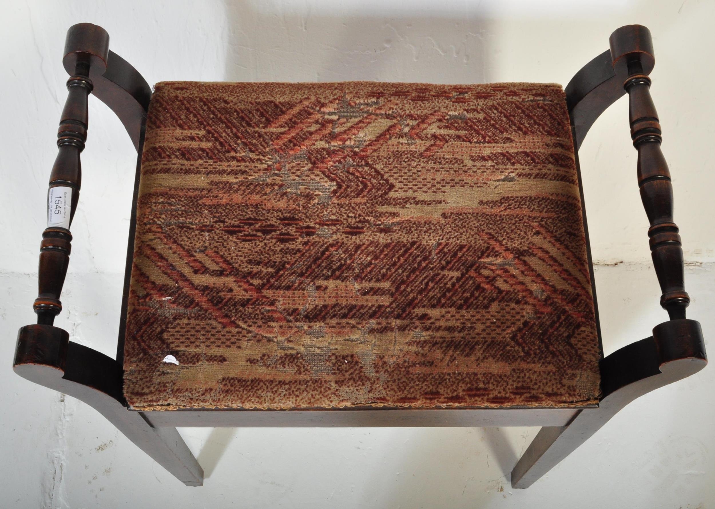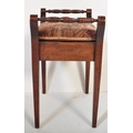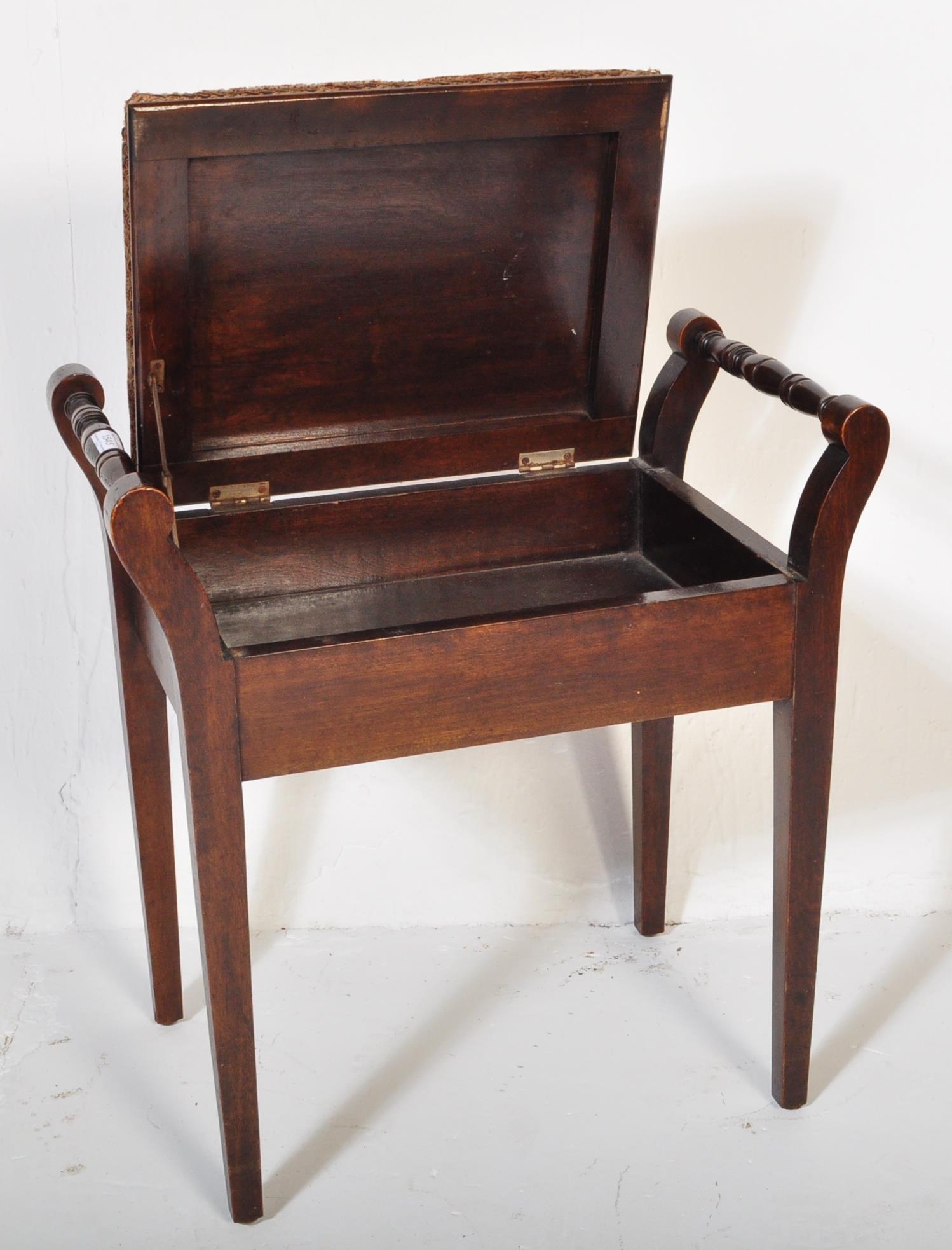 An Edwardian mahogany piano stool seat. Raised on squared legs with upholstered seat having hinged top with sheet music storage space inside. Flanked by two turned handles either side. Measures approx. 60cm x 57cm x 35cm.