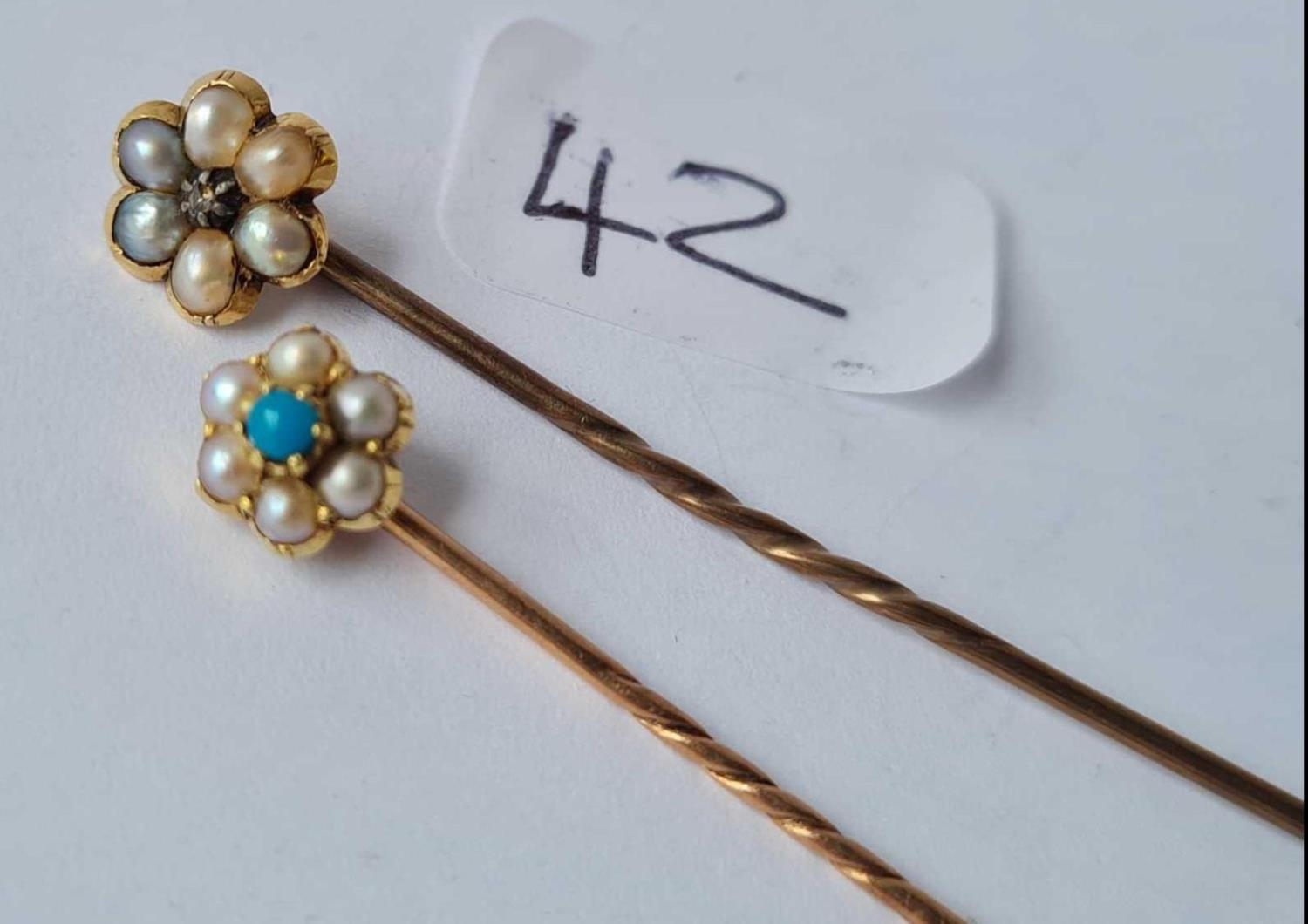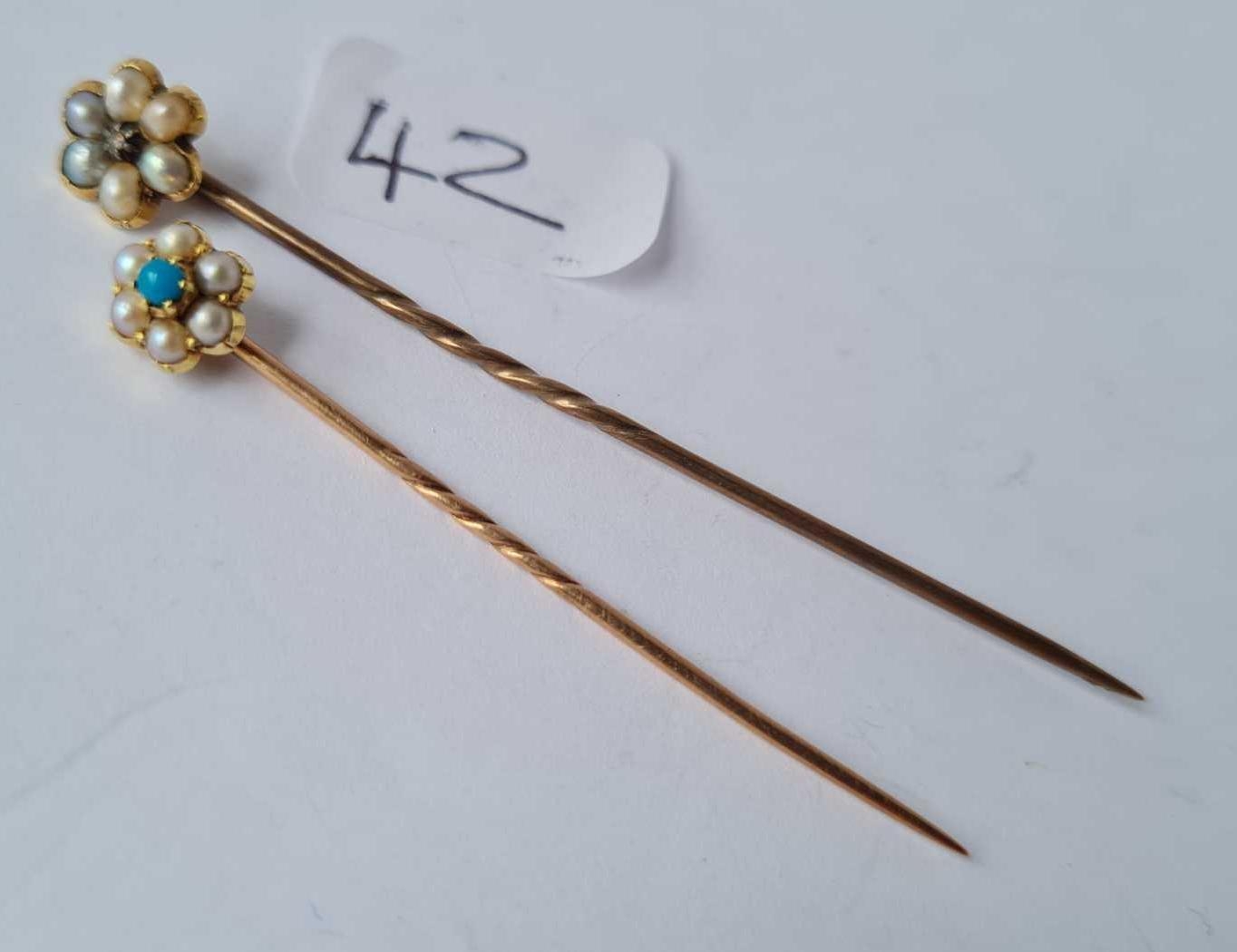 Two pretty stick pins ( 1 X diamond and pearl cluster 1 X turquoise and pearl cluster ) both set in gold