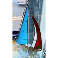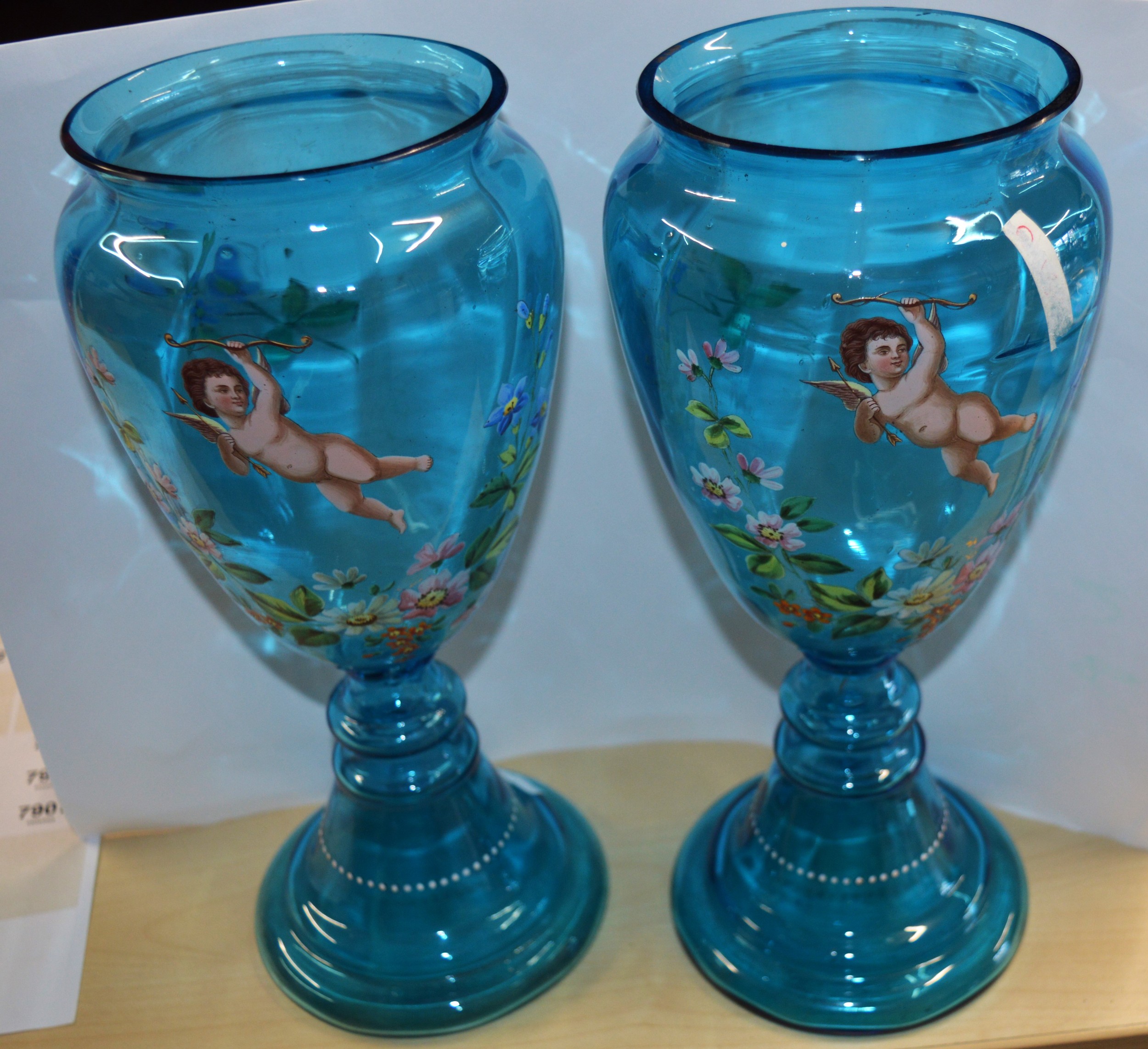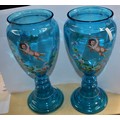 Pair of Turquoise Glass Vases having Hand-painted Cherub and Flower Design - 1 Foot High