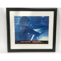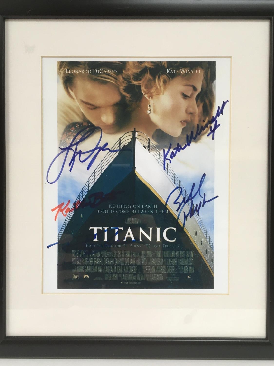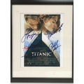 A framed and glazed multi signed movie card for James Cameron's 'Titanic', approx 32cm x 37.5cm.