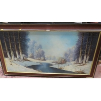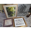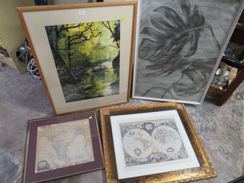 A FRAMED AND GLAZED IMPRESSIONIST TYPE WATERCOLOUR OF A WOODED RIVER SCENE SIGNED LOWER LEFT EDWIN F MASON ? TOGETHER WITH MAPS PRINTS ETC (4)