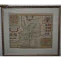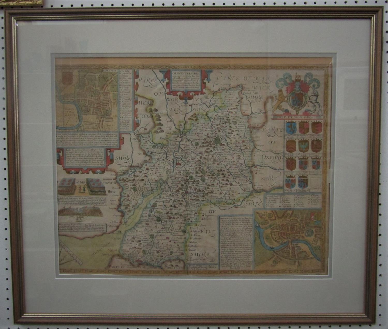 John Speed (British 1552-1629) - A 17th century hand coloured engraved map of Gloucestershire - Contrived into 33 several hundreds, etc, sold by Thomas Bassett and Richard Chiswell, 38.5 x 49.5cm approx visible sheet size (slipped in mount) framed