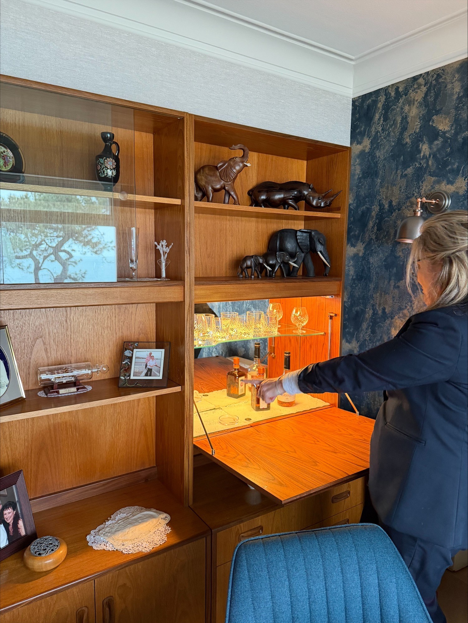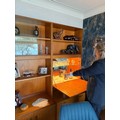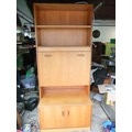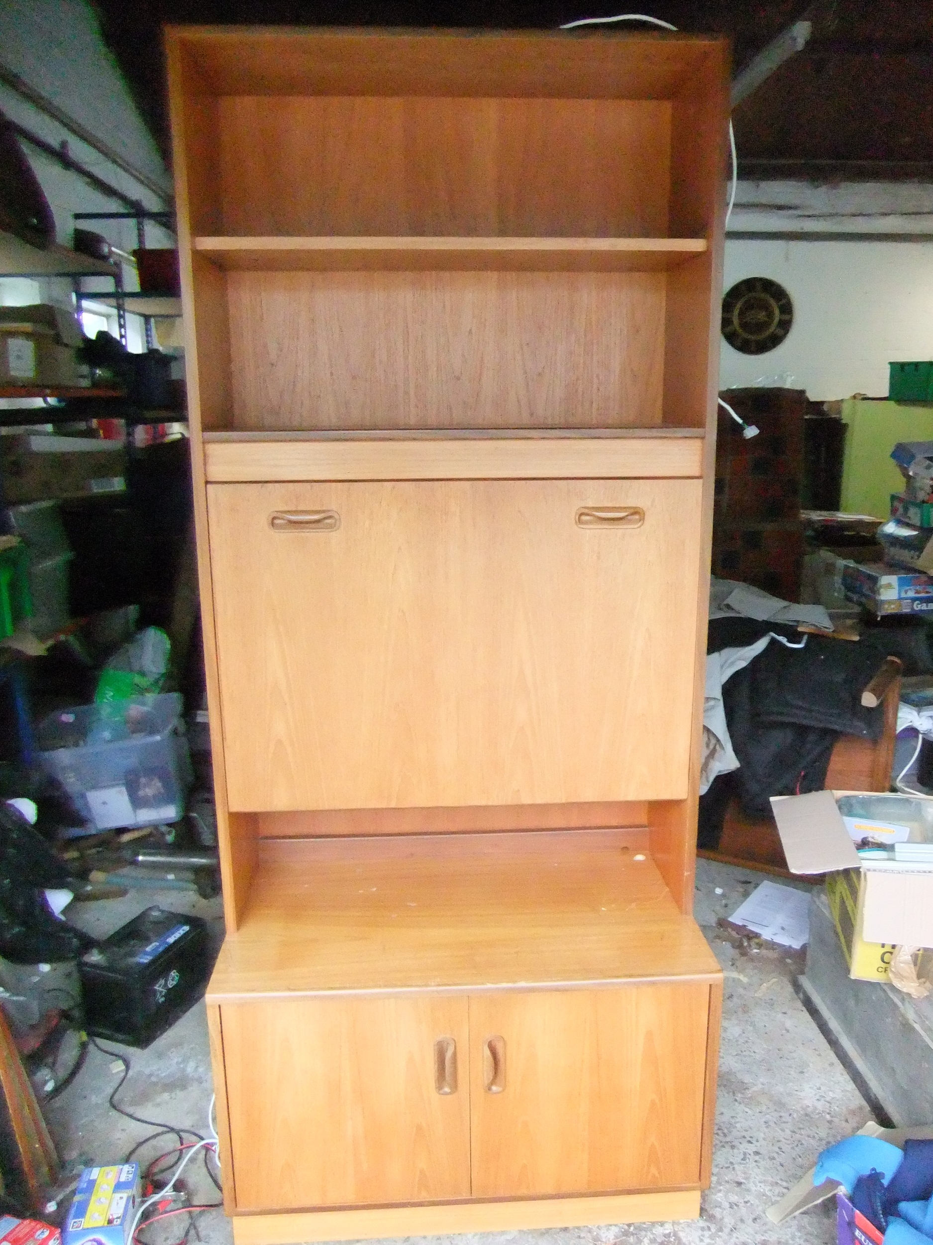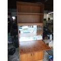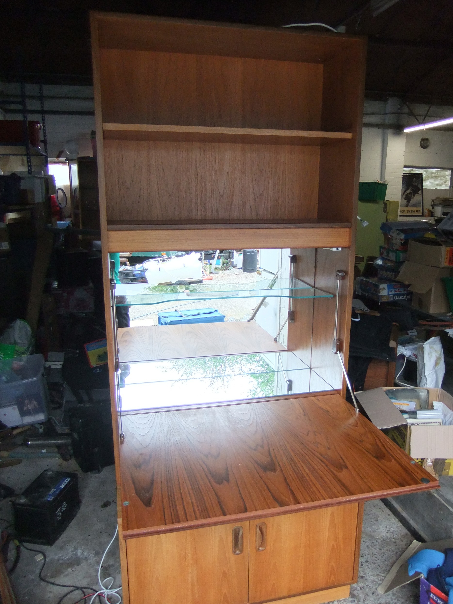 A large G-Plan wall unit with drop front, mirrored with glass shelf and designed as a drink cabinet, internally lit, with cupboard under and shelves over. Approx height 6' 6" (very roughly!) but splits for transport. In good order. (Picture of unit in use to right, but with different base unit [drawers and not cupboard])