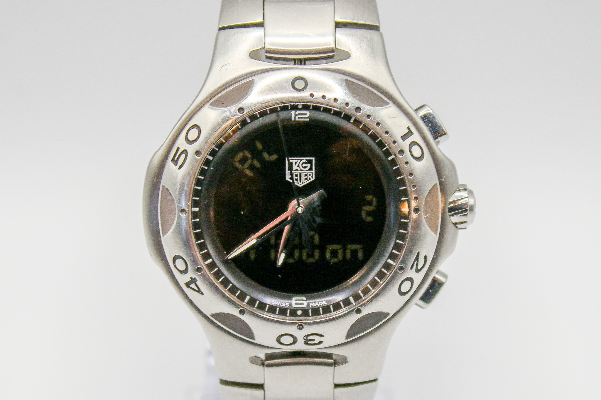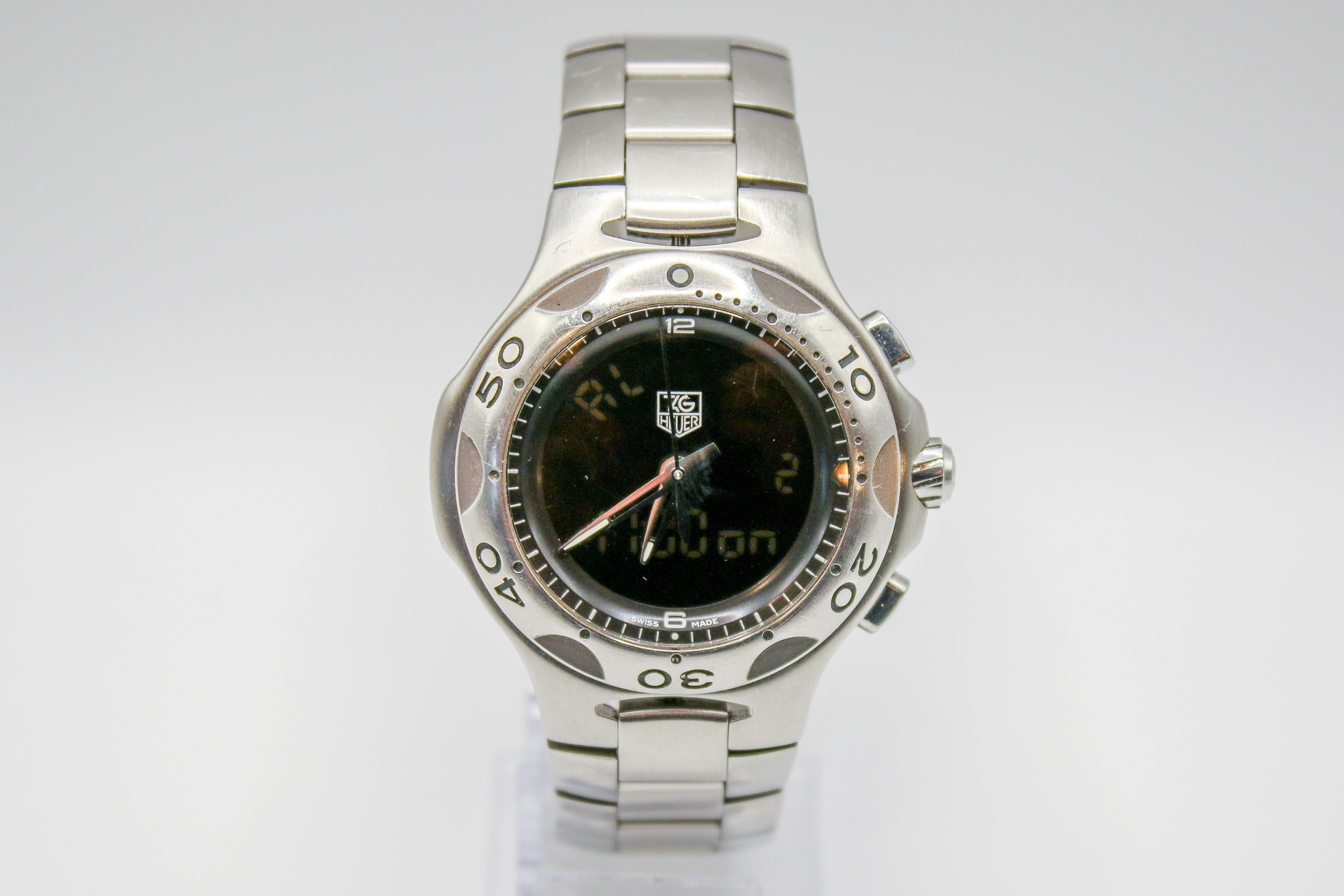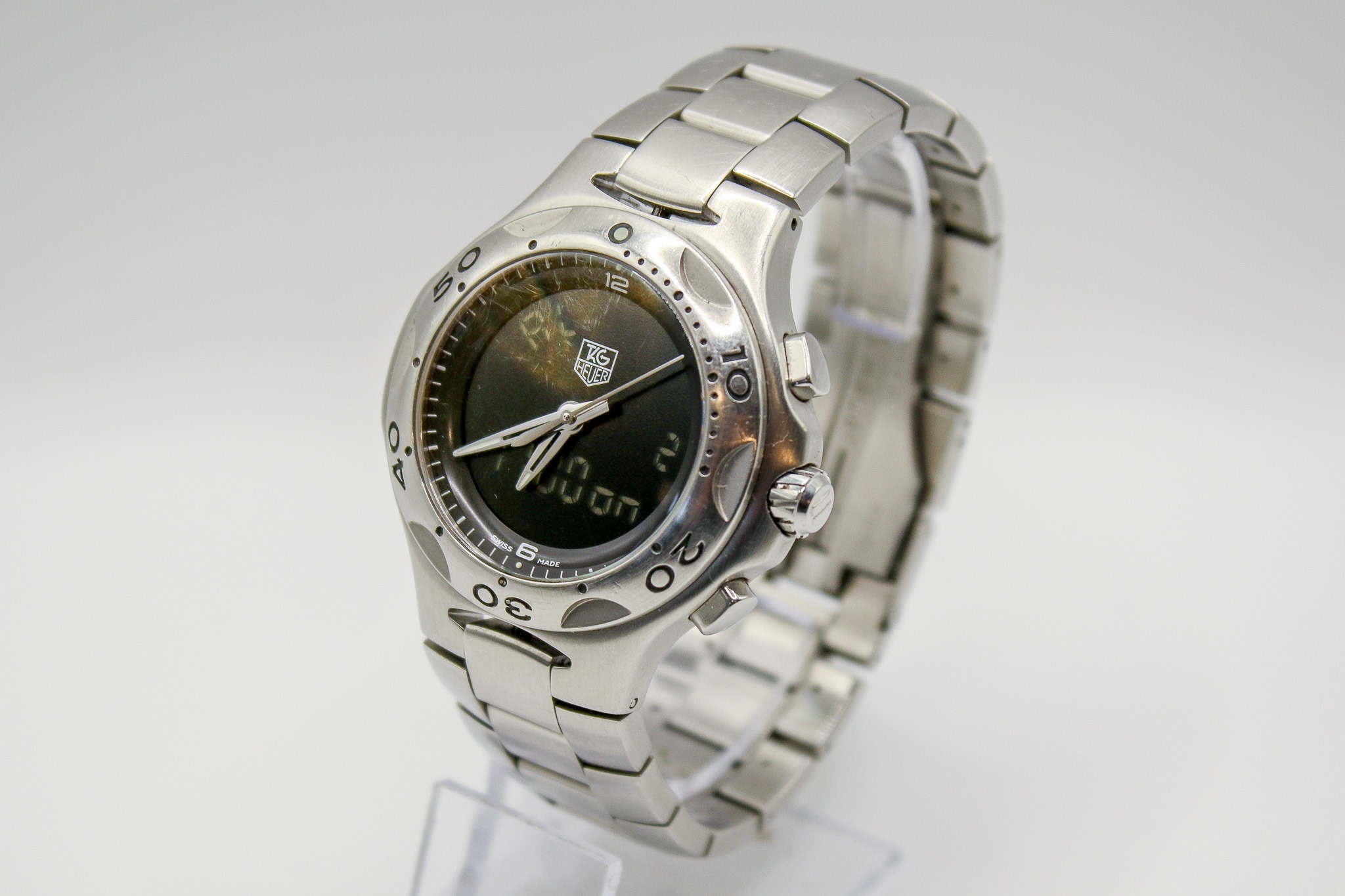 Tag Heuer Kirium F1 circa 2003 gentleman's stainless steel quartz wristwatch. S/N CL111A / HL9755, having black face with digital numbers, numbers to the bezel, on a bracelet strap with two instruction booklets and case. Case diameter 4.1cm.
