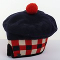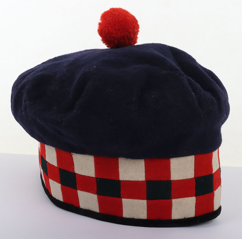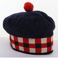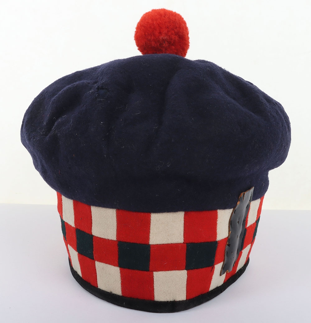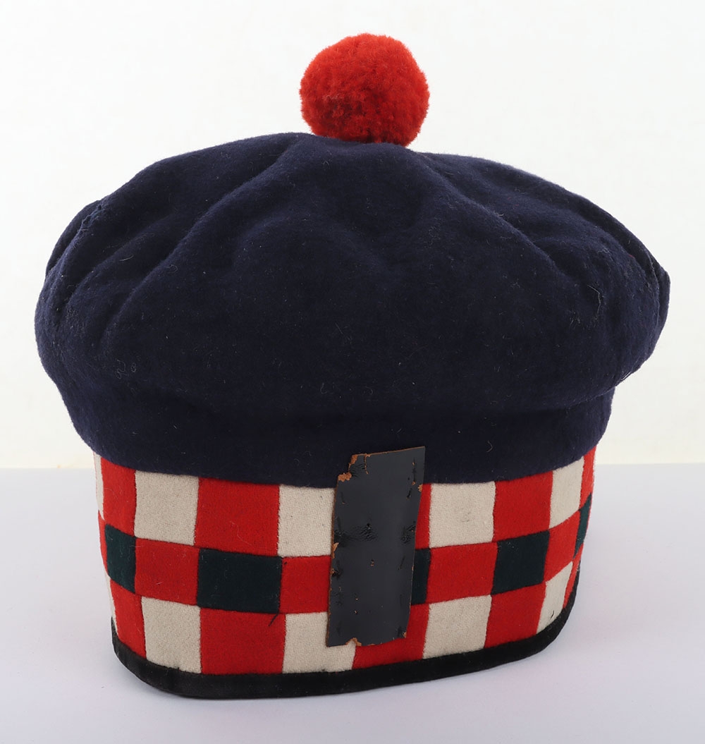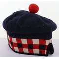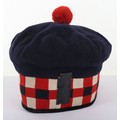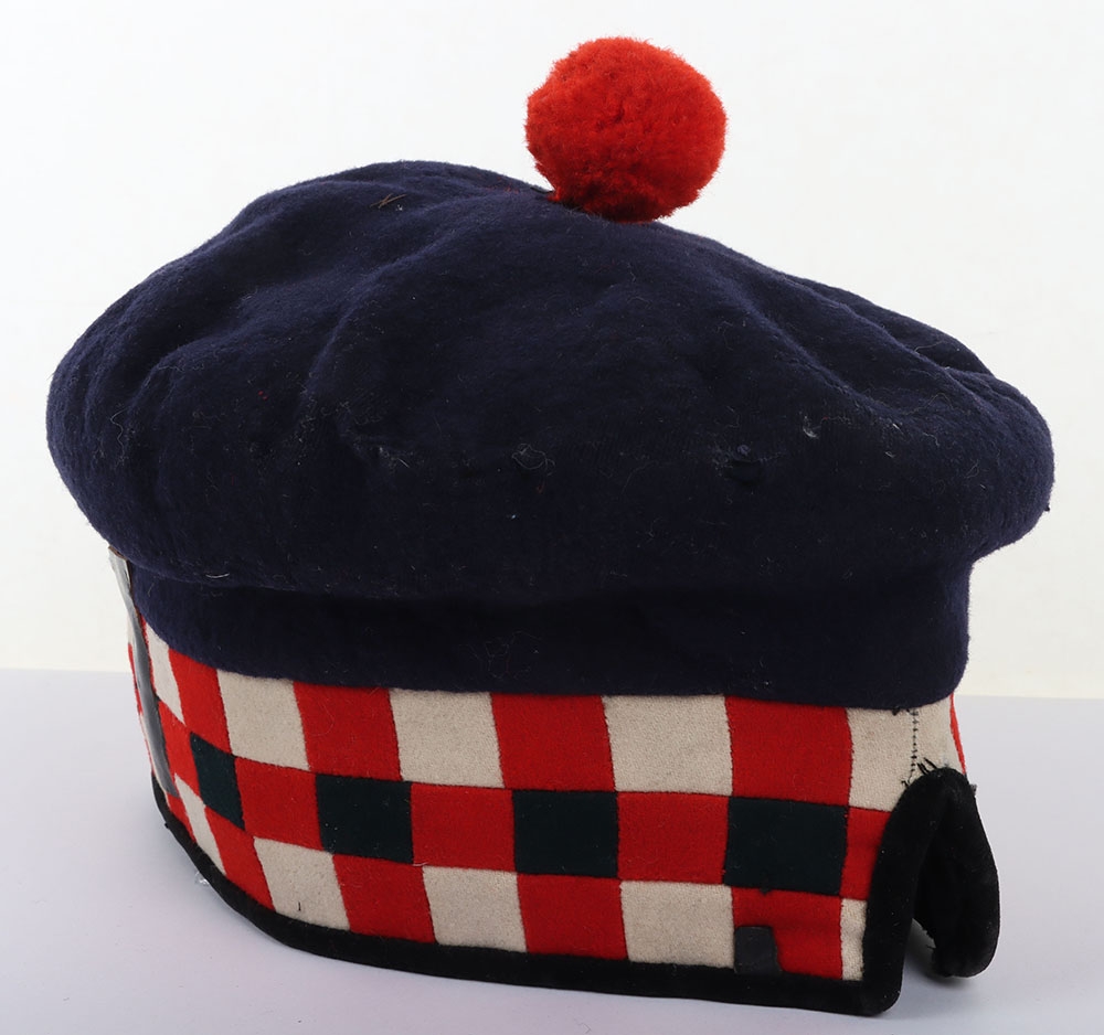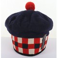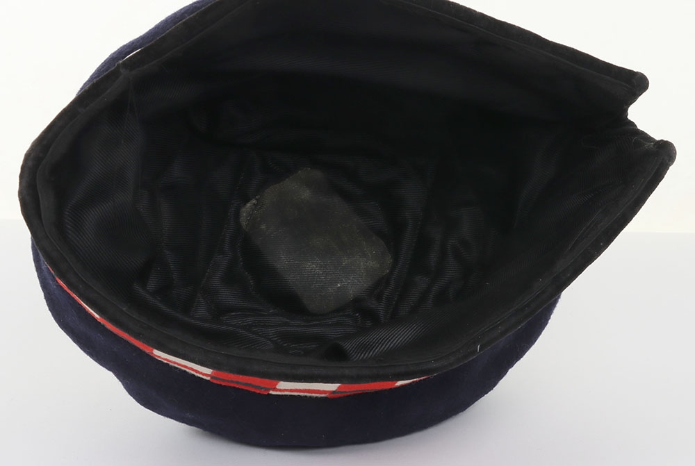 Scottish Balmoral Headdress, fine early example with blue wool top, diced head band. Velvet brim. Black cloth quilted lining. Leather hackle slot. Some light areas of moth.