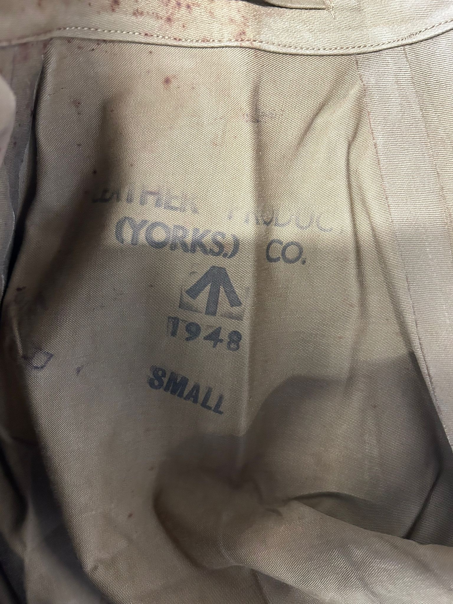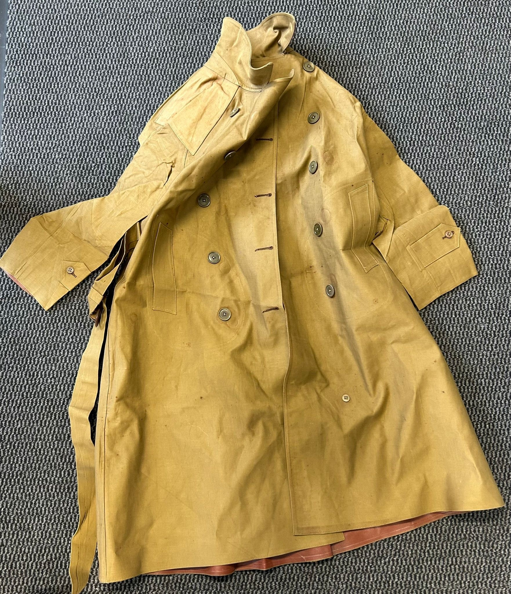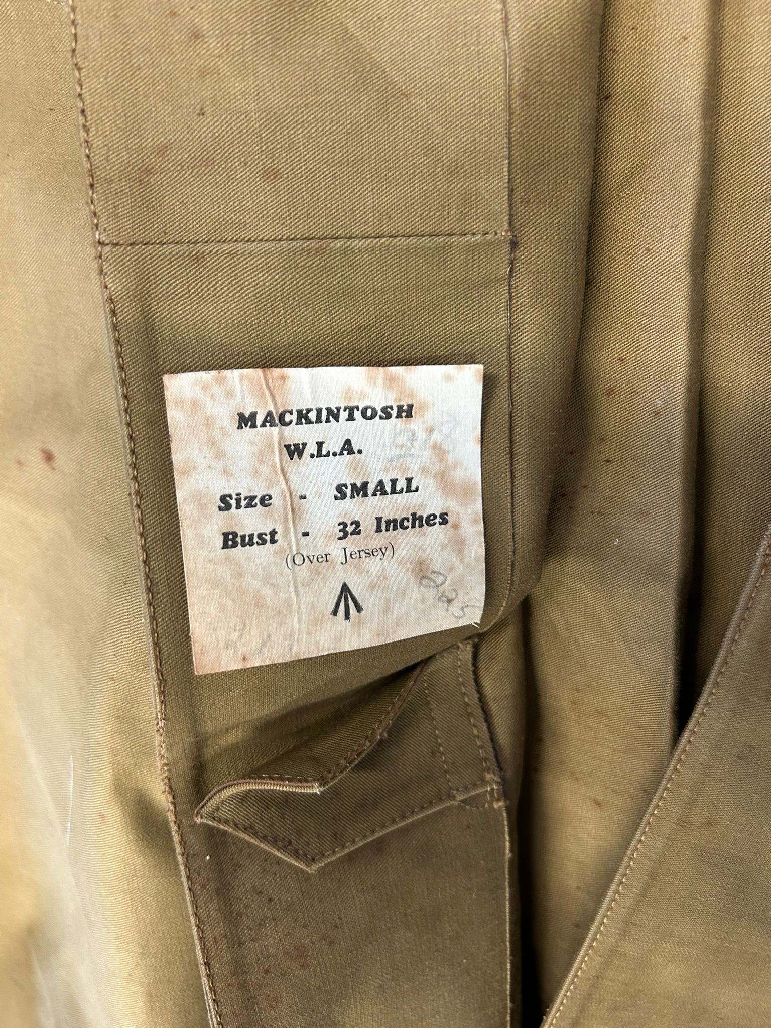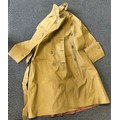 A scarce WW2 pattern Women's Land Army Mackintosh coat of rubberised material label inside marked marked "Mackintosh W.L.A. "lining marked" Leather Products York Ltd. 1948. Complete with original belt. In unissued condition (sleeves little stiff from storage)